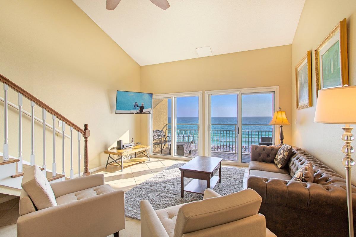 "Crystal Sands 303B" is a two-bedroom vacation rental residence that also features some gracious bonus guest quarters in the upper floor loft. The wall of sliding glass doors that lead to the beachfront balcony and vaulted ceiling accentuate a bright, spacious setting. The balcony features rich straw woven furnishings, which invite you to experience the gorgeous gulf views first hand. The living area includes an elegantly styled leather couch and a white armchair that ensemble around a thick honey-toned plank-top cocktail table. A large wall-mounted flatscreen TV is provided for entertainment. Six stylish raised hardwood chairs around a black granite-topped island table provide a dining area beside the open kitchen featuring rich chocolate-colored custom cabinetry and stainless steel appliances. The Master Bedroom has a bright window and a king-sized bed with access to a full hall bath, while the guest quarters are also located in the loft area upstairs. The front portion has a queen-sized bed and sleeper sofa beside a full bath that connects back to double bunks with two full beds and two twins.