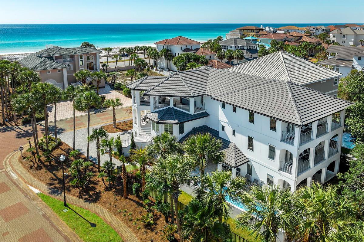 Casablanca stands as one of the most iconic beachfront family compounds on 30A, offering nearly 7,300 square feet of antebellum-inspired elegance overlooking the Gulf. With space for up to 26 guests, this estate blends crisp white coastal architecture with timeless interiors, multiple Gulf-front balconies, and a private pool perched above the sand. The main house features grand gathering spaces, a gourmet kitchen, a regal primary suite, beautifully appointed guest rooms, and a media room perfect for movie nights. A separate two-story guest house adds even more room to spread out, complete with a game room, kitchenette, and additional bedrooms for extended family or friends. Located near Gulf Place and beloved local spots like The Vue on 30A and Stinky’s Fish Camp, Casablanca delivers the ultimate beachfront retreat for those who expect space, style, and unforgettable Gulf-front living.