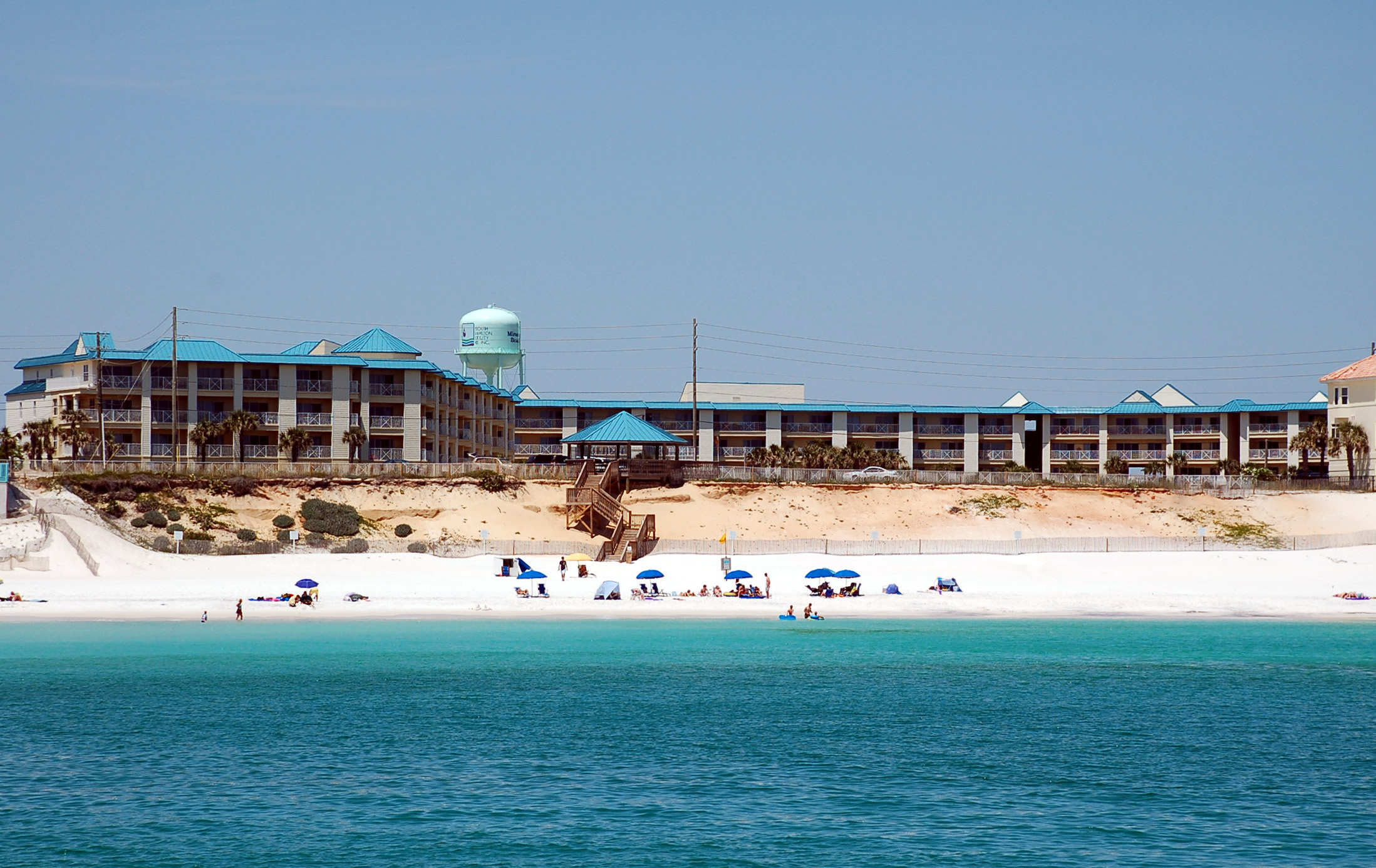The Amalfi Coast Resort is located across from a towering, sand dune on Scenic Gulf Drive which also marks one of the highest points of elevation on the Gulf of Mexico. The panoramic vista views, from this fortunate locale, extend from Sandestin towards the east to the towers of Destin towards the west. An old fashioned gazebo takes optimum advantage of these views with a stairway that extends down to the beach below. This provides the perfect spot for a relaxing view of the coastal scenery as well as experiencing some really spectacular sunsets which occur over the Gulf from late fall until early spring. Full moons over the water during summer provide a romantic, silver-splattered, magical view. The entire resort sits on over eight and one half beautifully landscaped acres with over 120 yards beach frontage. The complex includes two large, adjacent swimming pools in front, one of which is heated seasonally. The expansive pool decks with swaying palm trees are nestled next to a landscaped lagoon with Gulf views. This is accentuated by a long bridge which takes you with ease, to the gazebo's beach access point.