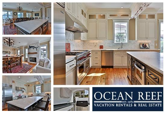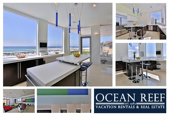 Many of our Ocean Reef Resorts guests choose one of our fabulous distinctive residential vacation rentals near the beach in order to have all the comforts of home and the valuable option of having a kitchen available for "dining in". After all, for only a portion of the price you would pay for everyone to dine out at some fancy restaurant, your group may buy lots of fresh seafood and other special goodies locally with the added enjoyment of preparing it together. Staying individually in an expensive one-room hotel room that has a microwave oven and an "Honor Bar" refrigerator doesn't quite cut it. This is particularly true when you are including extended family members to join you on vacation who can help share the cost of food or when a party buffet may be planned for an event like a beach wedding. Our Ocean Reef Resorts beach homes and luxurious condominiums come complete with a full kitchen and in all sizes. You may choose whichever one best meets your needs whether it be a cozy romantic rendezvous for two or a big place that can sleep multiple friends and family members for a planned event. The following is a quick look at three Destin vacation rental homes we offer that have big gourmet kitchens, can provide enough sleeping quarters for everyone, and happen to be a perfect place for entertainment.