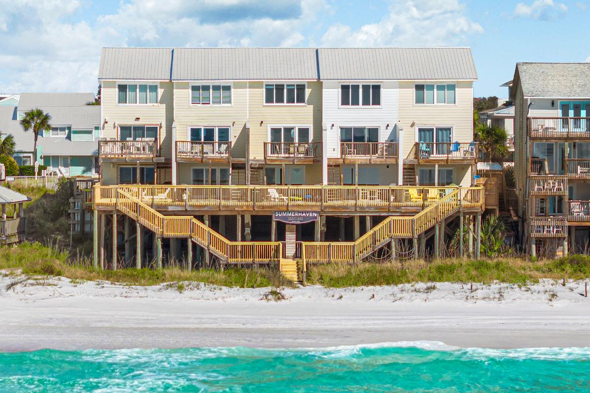 Directly on the sand along Scenic Gulf Drive in Miramar Beach, Summerhaven offers families a true beachfront townhome experience with wide decks, private balconies on multiple levels, and steps that lead straight from your door to the sugar-white shoreline. These three-story residences are designed for flexibility, with split floor plans that place bedrooms on separate levels—ideal for multigenerational Spring Break trips or two families traveling together—while spacious open living areas in between create a natural gathering space with sweeping Gulf views. Residences like Summerhaven 1 and Summerhaven 2 feature King suites, bunk nooks, dedicated bunk rooms, sleeper sofas, full kitchens, private laundry, and generous parking, making them especially well-suited for larger family groups who want comfort without sacrificing location. Parents appreciate the ability to give teens their own floor, grandparents enjoy easy main-level access, and everyone benefits from being able to walk to nearby beachfront favorites like Whale’s Tail or Royal Palm Grille. With only a limited number of townhomes in this low-density Gulf-front complex—and Spring Break weeks nearly spoken for—Summerhaven remains one of the most in-demand beachfront options in Miramar Beach for families who want to wake up to the sound of the surf and skip the high-rise crowds entirely.