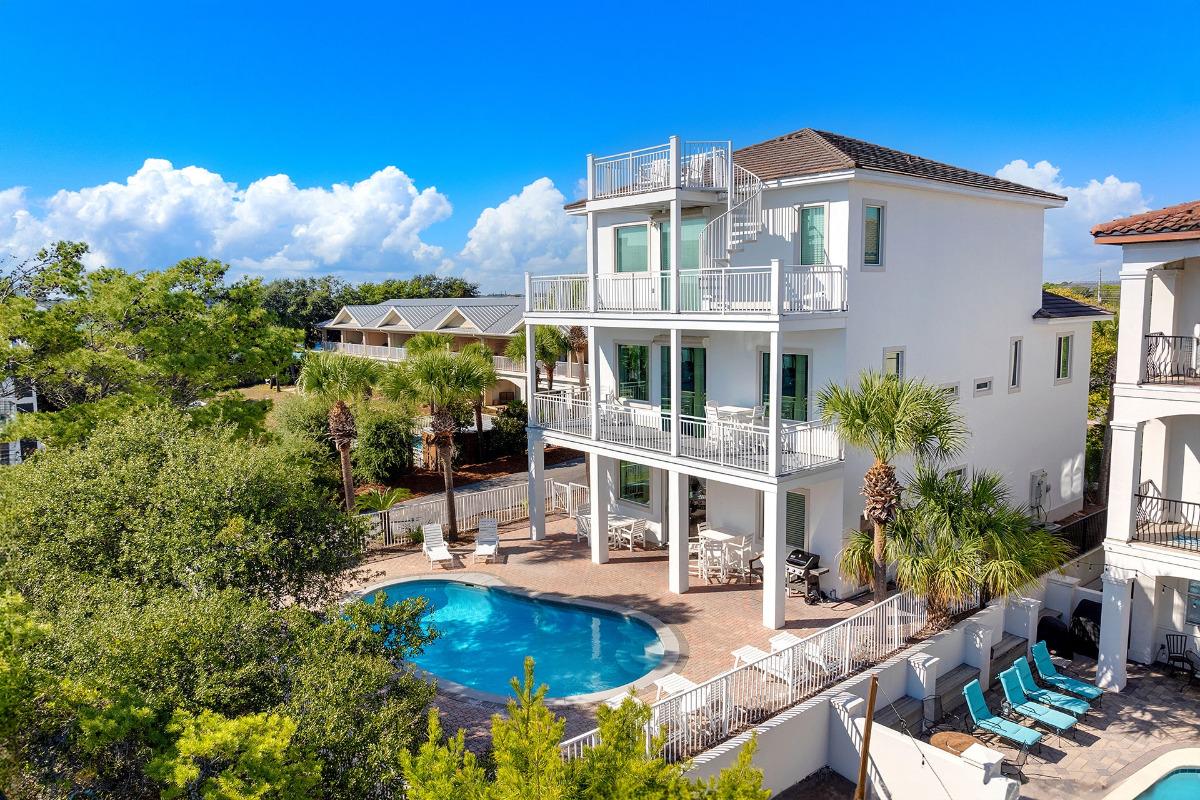 Located in the heart of Dune Allen Beach, Seven Palms combines upscale coastal living with a fun, laid-back atmosphere that’s perfect for football weekends. This four-bedroom retreat sleeps up to fifteen guests and sits close to both the shimmering Gulf shoreline and serene Stallworth Lake. Between the beach, lake, and nearby Topsail Hill Preserve State Park, you’ll have no shortage of natural beauty—but the real action is at the house. A 30' x 12' private pool with a spillover spa sets the stage for outdoor lounging, while the side yard features turf landscaping, tropical palms, and even a three-hole miniature golf course. The first-floor den makes an ideal game-day hangout with its sectional sofa, large flatscreen TV, game table, and full-sized fridge for cold drinks. Upstairs, the open living, dining, and kitchen area offers a giant flatscreen TV visible from the sofa, dining table, and wet bar, plus sliding glass doors to a wraparound balcony with pool views, a grill, and outdoor seating. With a spacious master suite, multiple guest rooms, and easy access to Gulf Place’s restaurants, bars, and live music, Seven Palms is built for beach days, big games, and everything in between.