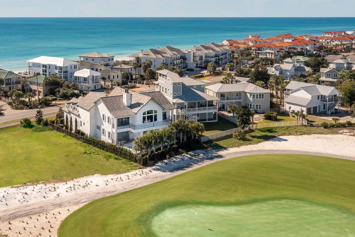 This stately Scenic 30A vacation home overlooks a pristine fairway at the acclaimed Santa Rosa Golf and Beach Club and is only a short stroll from the sugar-white shoreline. The sweeping views of manicured greens create a stunning backdrop from both the pool deck and upper balconies. Offering comfortable accommodations for up to fourteen guests, this five-bedroom retreat is a paradise for those who love the beach and the finer things in life—especially on game day. Amenities include a heated private pool, golf cart with a built-in table for golf cart tailgating, bicycles, and an in-home movie theater—complete with a high-top bar & kitchenette—perfect for watching football in style. Inside, an expansive open living area features soaring ceilings, walls of windows, and elegant coastal décor. Multiple big-screen TVs, a lavish built-in bar, and a stunning chef’s kitchen make it perfect for entertaining. Upstairs, a dedicated theater room, balcony views, and spacious guest suites add to the luxury. And for a change of scenery, stroll right across the street to Vue on 30A—where you can enjoy craft cocktails, Gulf views, and maybe catch part of the game from their bar before heading back to your private paradise.