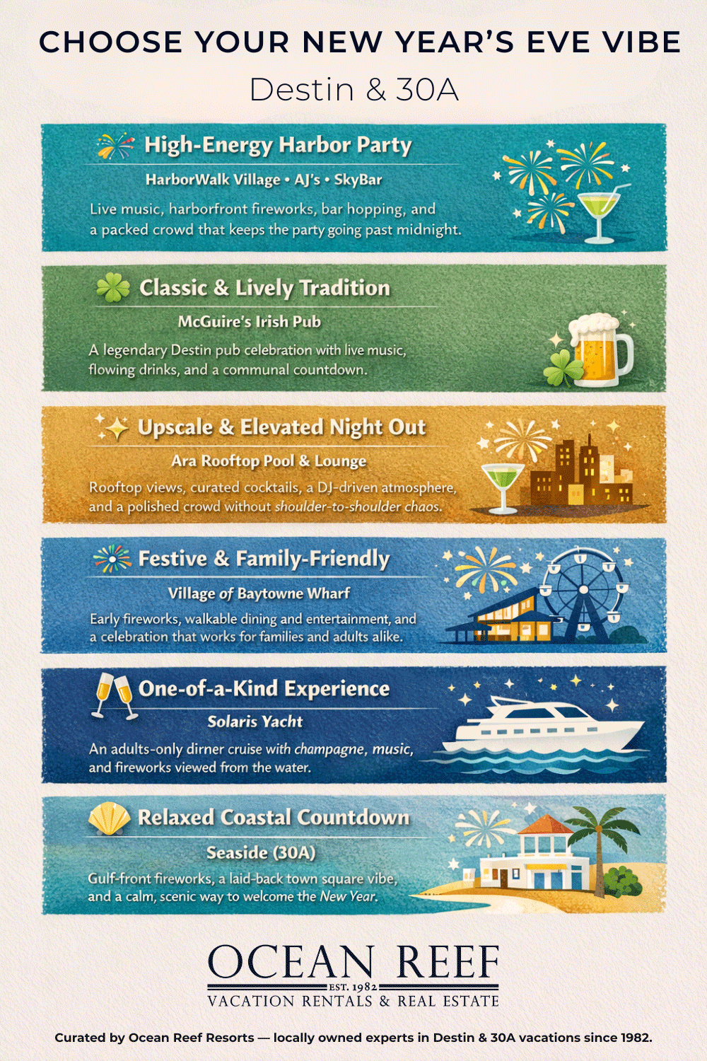 As a locally owned vacation rental company that’s spent over four decades welcoming guests to Destin, Miramar Beach, and Scenic 30A, Ocean Reef Resorts has a front-row seat to how New Year’s Eve unfolds here each year. From harborfront fireworks to polished resort celebrations, we’ve seen which spots consistently deliver unforgettable experiences—and which ones guests return to year after year. To make planning easy, we’ve organized these New Year’s Eve hot spots from west to east, following the natural flow of the coastline and highlighting the celebrations that truly define ringing in the New Year on the Emerald Coast.