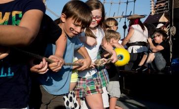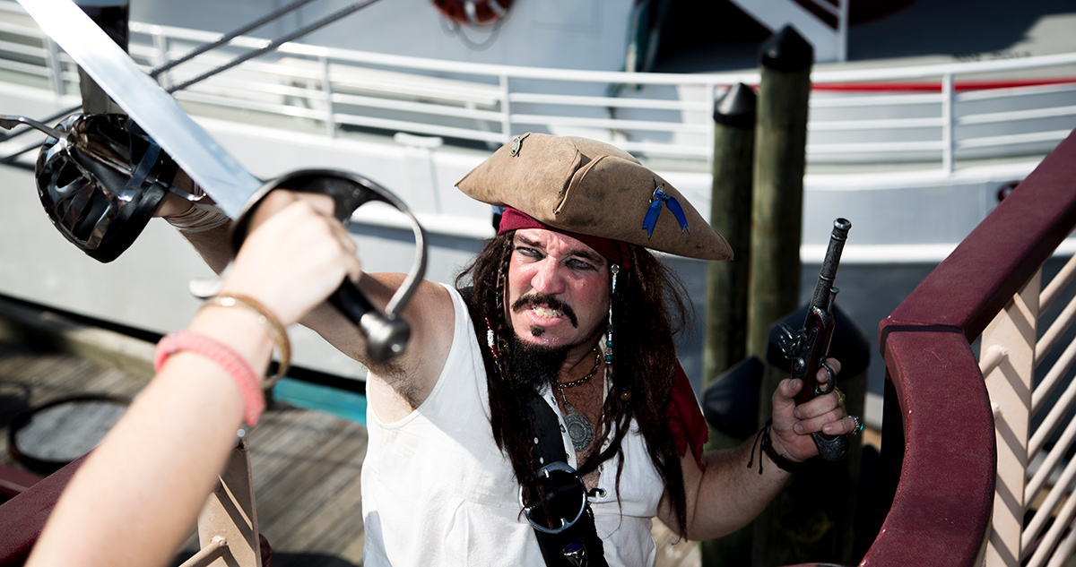 The training involves participating in "sword fights" along with shooting water guns at each other and sometimes even firing the cannon. At around 11:00, if the adventurers have proved themselves worthy of being a buccaneer, Captain Cannonball takes them into his confidence. He invites those trusted downstairs to his secret Treasure Room and told the story about the current treasure they are in search of. He promises to share part of the treasure if they do their duty and tells them how to spot it. If they are lucky, (and they always are!), treasure may be spotted soon afterward. The treasure chest is found and fellow buccaneers help hoist it on board to open it. After a lively negotiation with the captain, part of the treasure may be doled out to all the participants. Then a real celebration begins with more song, dance and another burst of cannon fire! Before sailing back to harbor with the loot all of the buccaneers have to pledge and recite the Pirate's Oath. The general message of this oath is as follows: "Unlock the treasures of your heart and let your dreams come true. You are leaders now, not followers so set a good example for your friends and family to always do good in this world whenever possible." The cannon is fired one last time and the ship returns to Destin Harbor around 11:30. After saying their goodbyes, Captain Cannonball and his crew prepare for the next treasure hunt once again with the next bunch.