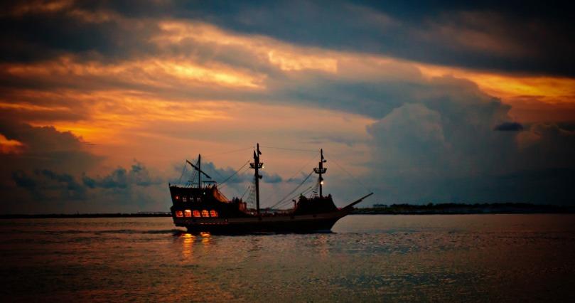 "Yo ho ho and a bottle of rum?" Well, not exactly in this case. Although these buccaneers do serve rum and some of the best margaritas around to adult adventurers on their Destin pirate cruise, it's more about the treasured adventure they provide to families. The SS Buccaneer is a custom designed pirate ship anchored in the Destin Harbor that is 103 feet long and is modeled to look like a 16th century Spanish galleon but with all the 21st century amenities. It was commissioned in 2011 by Steve Wilson who owns the popular dolphin cruise boat known as the Southern Star. He collaborated with boat designer Travis Carter to bring his own vision to fruition and after fifteen months it was completed in 2012. This impressive vessel includes two sets of double spiral staircases, a "Treasure Room", multiple viewing decks, a full galley as well as a state of the arts engine room with twin high powered 550hp engines. The Buccaneer first set sail on July 2, 2012 with Captain Cannonball, (aka local native Cliff Atwell), at the helm. During the summer season Captain Cannonball and his pirate crew take family and fellow adventurers on a treasure hunt four times a day at 9:30 as well as 12:30, 3:30 and 6:30 pm. Pirate treasure hunt cruises are also conducted throughout almost all the rest of the year as well but on a different schedule. The Buccaneer always sets sail to where ever they think a treasure chest may be found in the open gulf or in Choctawhatchee Bay. Usually this location is synonymous with how calm the winds are for the day since the crew wants everyone to experience a fun smooth cruise.