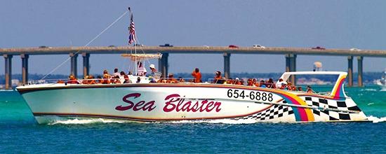 One of the best in Destin is aboard The Sea Blaster which was the first to begin doing dolphin cruises aboard this kind of boat. The Sea Blaster has been in operation since 1995 with experienced Captain Larry at the helm. This amazing vessel is seventy-three feet in length and is U.S. Coast Guard approved to carry up to 132 passengers on its open deck. It also happens to be one of the largest and fastest speedboats on the Gulf in Destin. Due to their popular success, they also have another boat called "Sea Blaster II" which carries up to 119 passengers. They are docked at the marina in Harborwalk Village. If you are a regular visitor to the Emerald Coast you have probably spotted this big boat packed with happy passengers zipping by some of the beaches along Holiday Isle and Scenic Gulf Drive. Often times they blast their horn as a "hello" to beachgoers as they pass by. TripAdvisor reviewers give their numerous dolphin cruises a 4.5 Star Rating and it was also ranked on the list of the Top Ten Things to do in Destin.