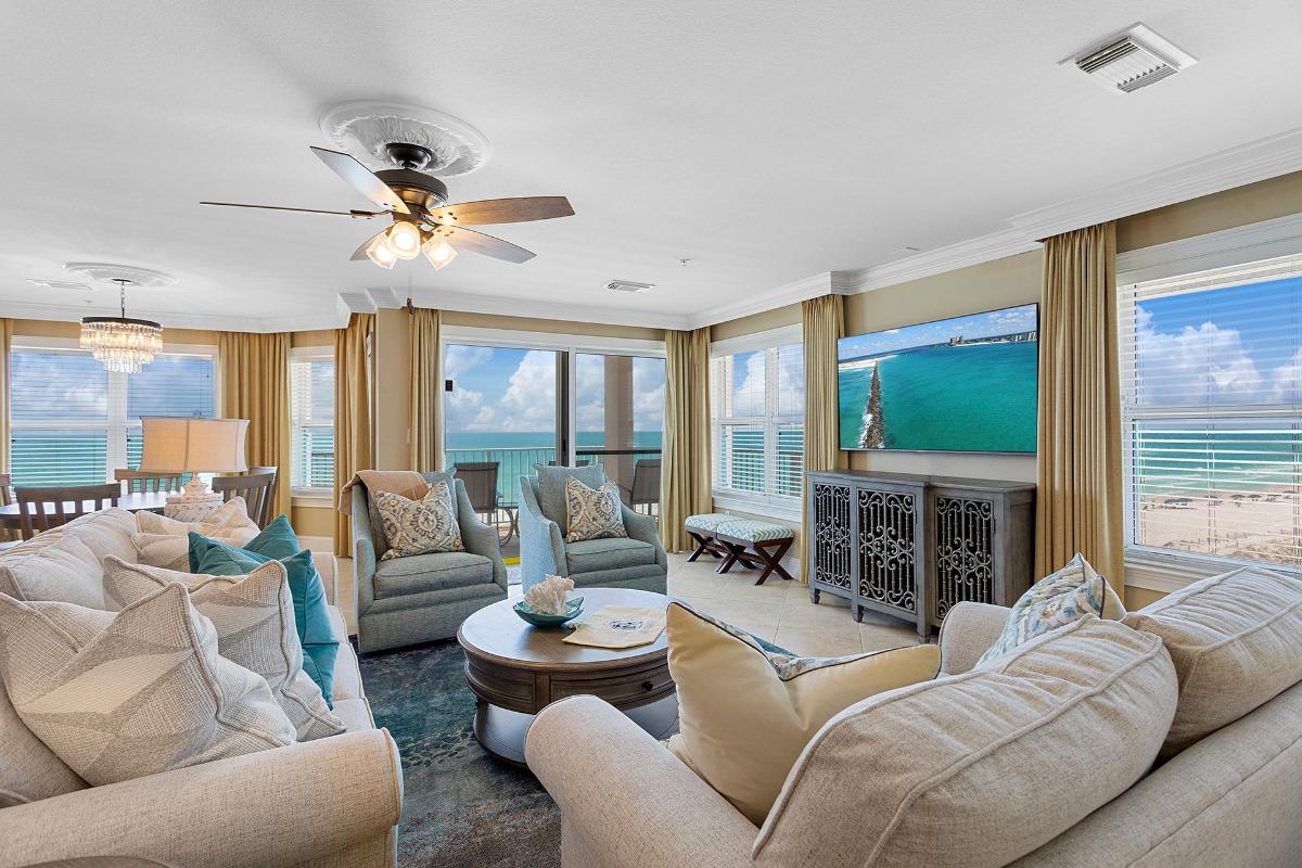 A guest favorite with a loyal following, Crystal Dunes 504 is a beautifully updated Gulf-front retreat designed for effortless coastal living. This three-bedroom residence showcases sweeping emerald-water views, stylish modern finishes, and a layout that comfortably accommodates up to nine guests. The open-concept living area features plush seating, a mounted flatscreen TV, and floor-to-ceiling glass doors that frame the shoreline and lead to a spacious beachfront balcony ideal for morning coffee or sunset cocktails. The remodeled kitchen shines with quartz countertops, crisp white cabinetry, stainless steel appliances, and a vibrant blue tile backsplash, while the breakfast bar and separate dining area create inviting spaces for shared meals and evening conversations. The King Primary suite features Gulf views and a beautifully tiled walk-in shower, while two additional king bedrooms—one with an added twin for flexible sleeping—provide comfort and privacy for families or couples traveling together. With its strong repeat following and thoughtful updates throughout, Crystal Dunes 504 remains one of the most requested residences in the building.