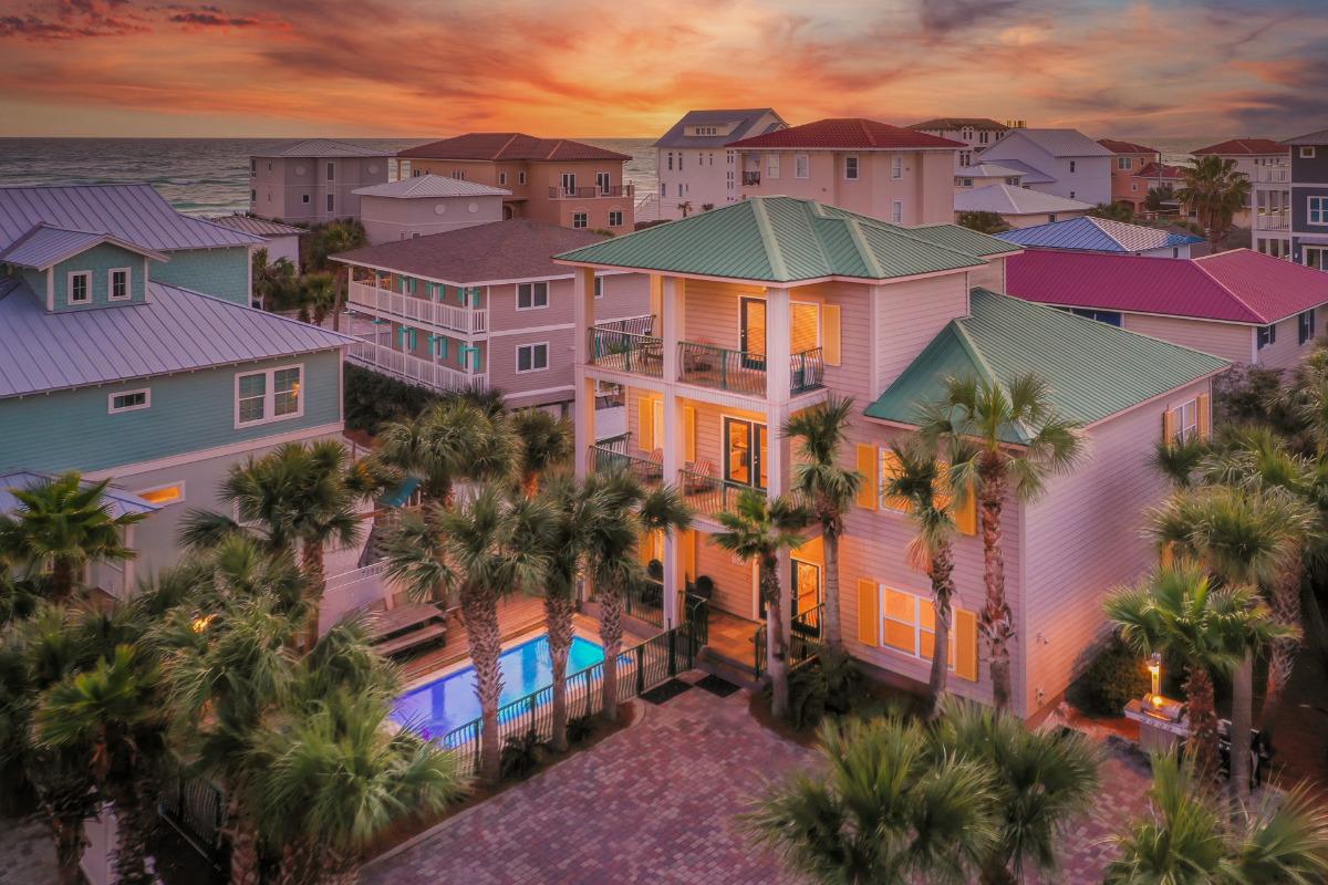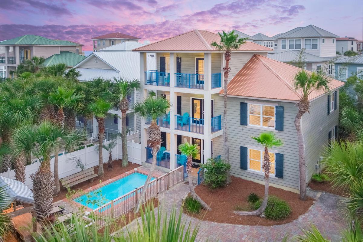 When your group getaway calls for space to connect without feeling crowded, Serenity By The Sea offers the ideal setting — this seven-bedroom vacation home in Miramar Beach comfortably accommodates up to 24 guests with a layout designed for both gathering and privacy. Just a short stroll from the beach, the home features multiple king suites with private baths, open-concept living areas filled with natural light, and a private pool surrounded by palm trees that creates a relaxed backdrop for conversations and shared meals. Separate den spaces and three thoughtfully arranged levels make it especially well-suited for corporate retreats, women’s getaways, church groups, or multi-family stays where balanced bedroom distribution matters. For those seeking large vacation homes in Miramar Beach that blend proximity to the Gulf with refined, functional design, Serenity By The Sea lives up to its name.