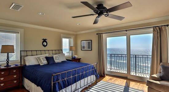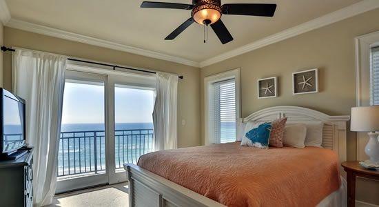 The second Master Bedroom Suite encompasses the entire fifth floor of this spacious home. Each suite has glass doors that allow you to see the wonderful watery vistas even while still in bed as well as wide flat screen TVs conveniently located for that late night movie. Each room is individually decorated with upscale, sophisticated and very tasteful furnishings. Due to the glass doors and windows that look out onto the balconies, you will notice immediately that you have vivid views of the glistening gulf from every bedroom. You won't want to stay in them very long however, because the wide open balconies welcome you to enjoy the sparkling day or dreamy evenings from comfortable, cushioned wicker chairs that look out upon this spectacular scene. Enjoy reviewing the multiple photos of this sumptuous beach side home and you will know why it is called a Five Star!