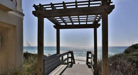 The first floor includes the main entry as well as a convenient outdoor shower where you can wash the sand off your toes. A stairway with a decorative arbor leads down from top of the dune to your own private, sparkling beach below. Sometimes you can see dolphin frolicking in the distance so be sure to bring your binoculars so that you can watch them play up close.