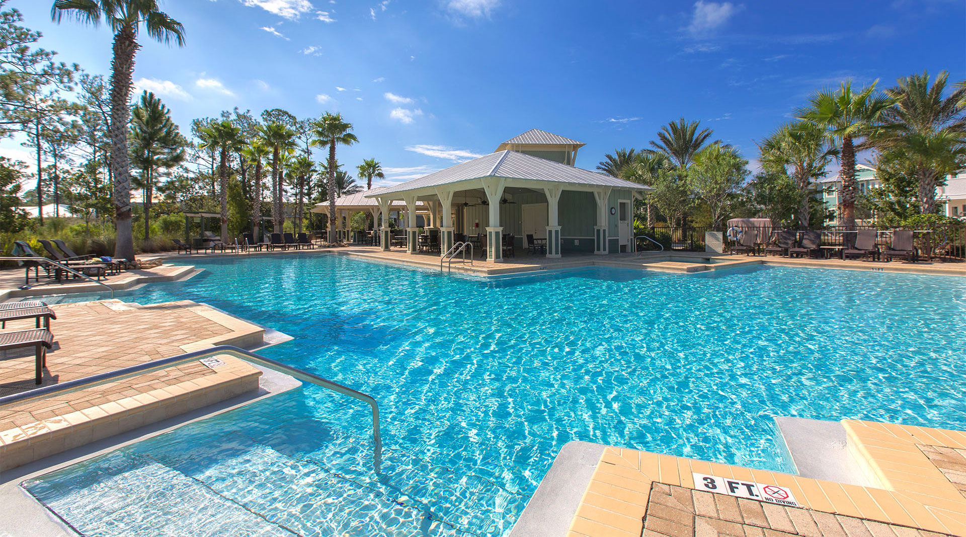 A covered bridge marks the entrance into NatureWalk at Seagrove, which was designed as a charming residential enclave to include Americana styled home designs that evoke a warm feeling of bygone golden years. Paver stones are used for walkways and drives that lead up to homes with verandas that span their width. The center of NatureWalk is called "The Gathering Place" and features a large refreshing swimming pool with multiple angles and a bubbling hot tub. There is also a splash pool and a long lap pool available for avid swimmers. A spacious patio beside the pool is adorned with tropical palm trees that rustle serenely in the breeze. A large pavilion nearby has an entertainment bar where folks gather to enjoy their own favorite tropical drinks. The patio includes tables, chairs, and gas grills so that families may enjoy having their poolside cookout with close friends. A "Tot Lot" provides a fun playground for kids while their parents may enjoy a grassy Putting Green nearby. NatureWalk's awesome location is a short bike ride away from the sparkling crystalline white beach and jewel toned waters of the gulf.