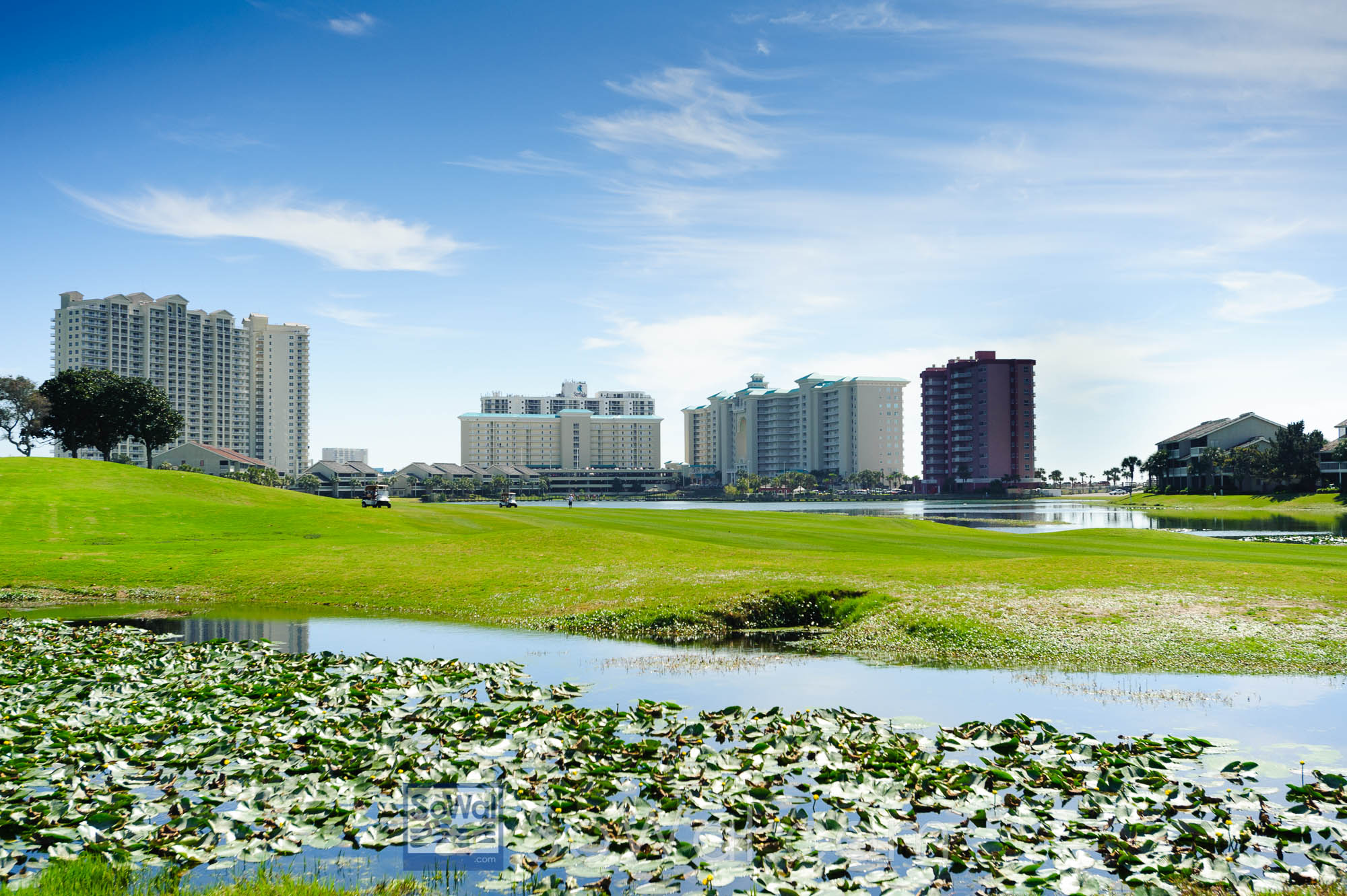 The sensational Seascape Resort sits next to sugar white sand beaches on the shimmering emerald colored waters of the Gulf of Mexico in Miramar Beach. Spread out over 300 acres of landscaped aqua dotted forest, the resort grounds extend from the beach all the way back to Emerald Coast Parkway (US Highway 98). Near the shore, Seascape encompasses the luxury high rise condo towers of Aerial Dunes I, Ariel Dunes II and The Majestic Sun where Ocean Reef offers a number of fine private vacation rental accommodations. Aerial Dunes looks like something you might see in Vegas or Miami Beach with wrap around pools and decorative, columned temple porticoes which are unlighted at night. The swimming pool in front of Ariel Dunes I extends almost the entire length of the building giving the illusion that it is sitting on watery mirror that reflects its own beauty. The Majestic Sun sits up front and center, facing the beach with unobstructed spectacular gulf views that extend as far as you can see across the jewel toned waters towards southern horizon. A spectacular "see through" arch rises eight stories tall in the middle of the building above a heated indoor swimming pool with cathedral ceilings and a wall of glass that looks out onto the gulf. This flows to an outdoor pool with tow hot tubs and sundeck that is nearly beachfront. A newly completed promenade with palm trees and multiple walkovers parallels the 2,000 linear feet of the powder white beach. Here you may soar through the skies on a parasail, kayak or experience heart pounding wave runner action. (Discounts are available for all of our Ocean Reef guests at La Dolce Vita Water Sports, a family run operation that provides these wonderful diversions at this location.) At the western end of the beach is The Whale's Tail which has a covered and open deck right on the water to watch the frequent volleyball games that are played there. Icy cold beverages, snacks and sandwiches are served there in a very casual, swim suit friendly setting.