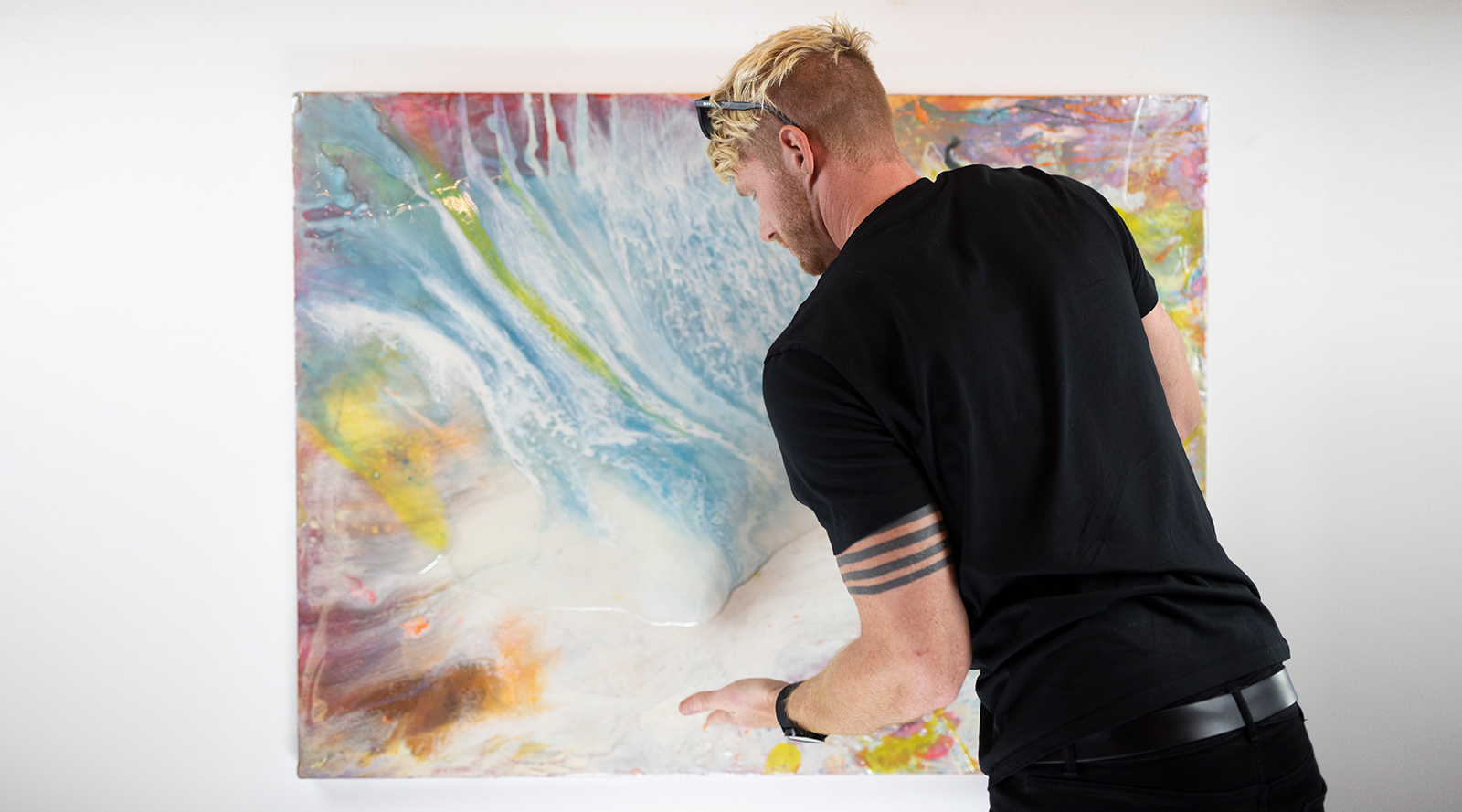 Rather than going out to celebrate his 21st birthday, Brendan got to work and re-focused his creative mindset on a blank canvas. Just as he had with music, he taught himself to paint. It turns out, this was a great decision! With his natural talent and motivation to succeed, he has grown into the mixed-media artist he is today. While his initial paintings were experimental with various mediums and styles, they have since evolved. Now, Brendan primarily works with epoxy resins, creating abstract paintings that are unique, dynamic, and expressive.