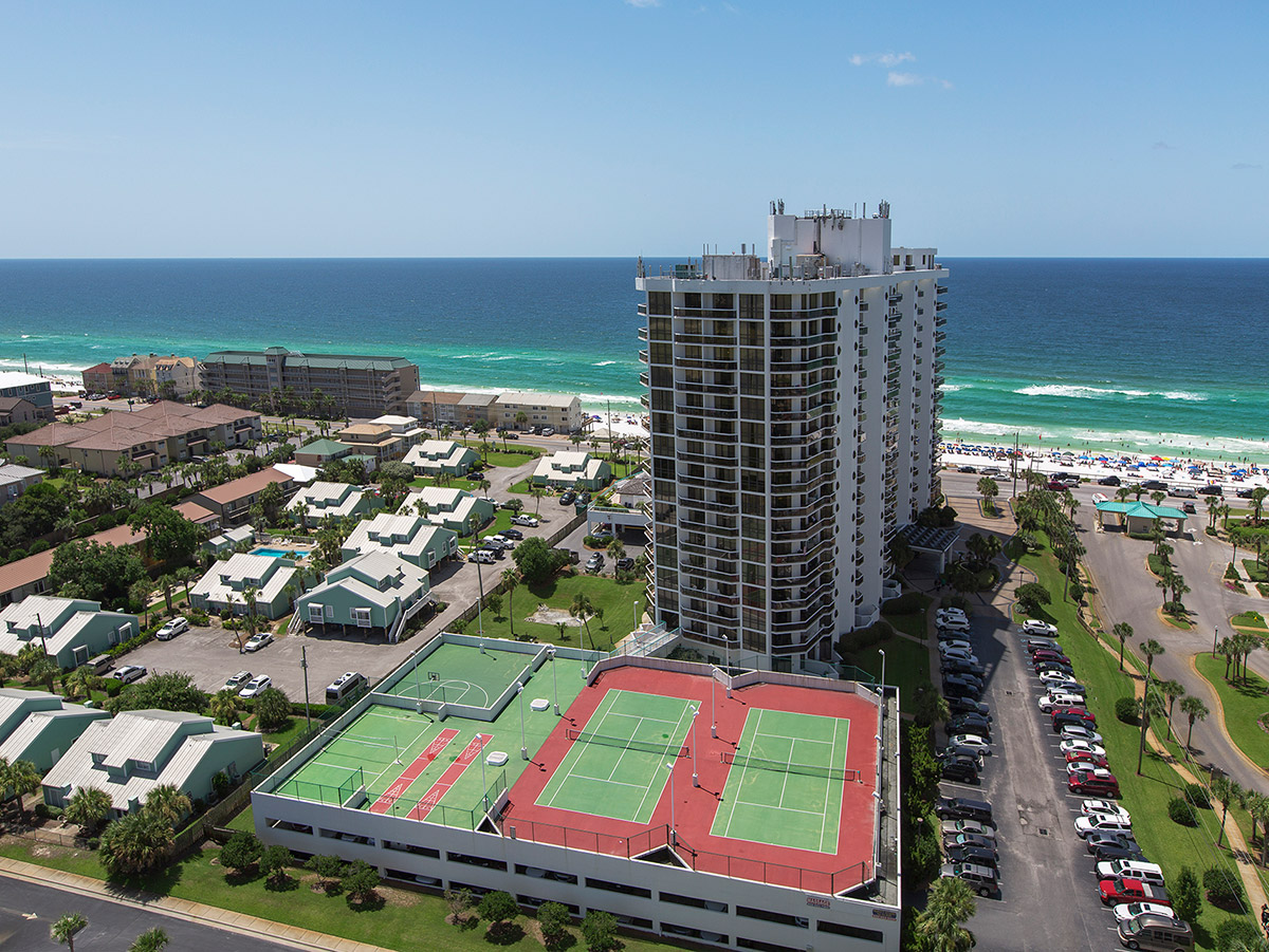 If you are seeking sensational surf side accommodations along The Emerald Coast in Miramar Beach then you should stay at a place synonymous to its name at the wonderful Surfside Resort. Located right on Scenic Gulf Drive, this Destin area high rise condominium building is a spectacular work of architecture that suits its lovely location overlooking the green jewel toned waters of the gorgeous gulf. Rising up to sixteen stories tall, the views are captivating here with spacious balconies and signature port hole windows on each level. In fact, every condo has access to connecting balconies from the living area and all bedrooms. This gulf-view resort has private beach access via a tall pedestrian bridge that spans the drive and provides a scenic walkway to the water's edge. This connects to an expansive, breezy sun deck with a swimming pool and two hot tubs. You can literally sit pool side and enjoy sparkling water views of the gulf all the way to the sunny southern horizon as you enjoy sipping on your favorite frozen beverage.