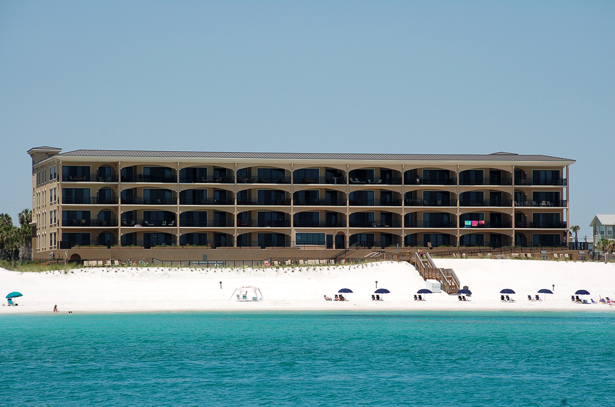 From Scenic Gulf Drive Villa Coyaba Destin is quite striking with old world, European styled architecture decorating this low rise, four story tall building. This exclusively private complex sits on over two and one half acres. Limestone balustrades compliment rounded, bowed balconies from the street side that sit below soaring arches above. Convenient covered parking is self contained underneath the building.