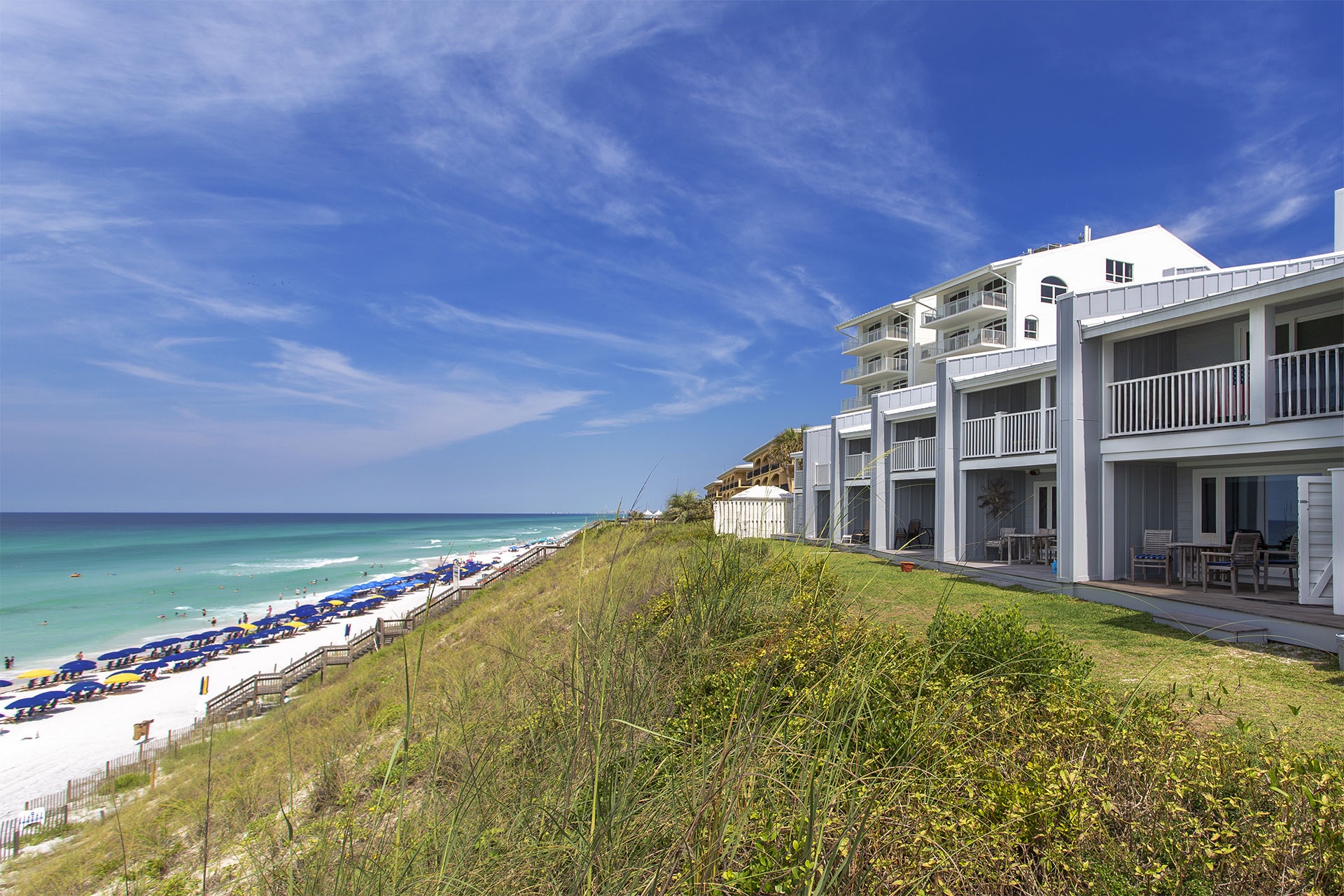 Sea Bluff has a fantastic sugary dune top location in the beautiful enchanting Blue Mountain Beach residential coastal village along Scenic 30A. Blue Mountain Beach was named by early offshore Spanish explorers who were mapping the area and thought the "Blue" Lupine flower-covered hills were actually "mountains" rising above a "beach" on each side. The name stuck, and today it is acclaimed for having the highest elevation on the entire Gulf of Mexico.