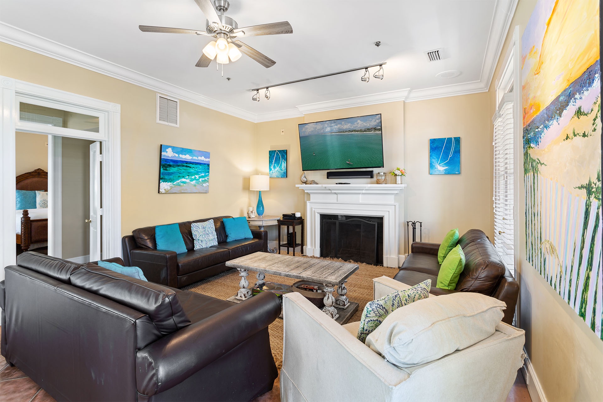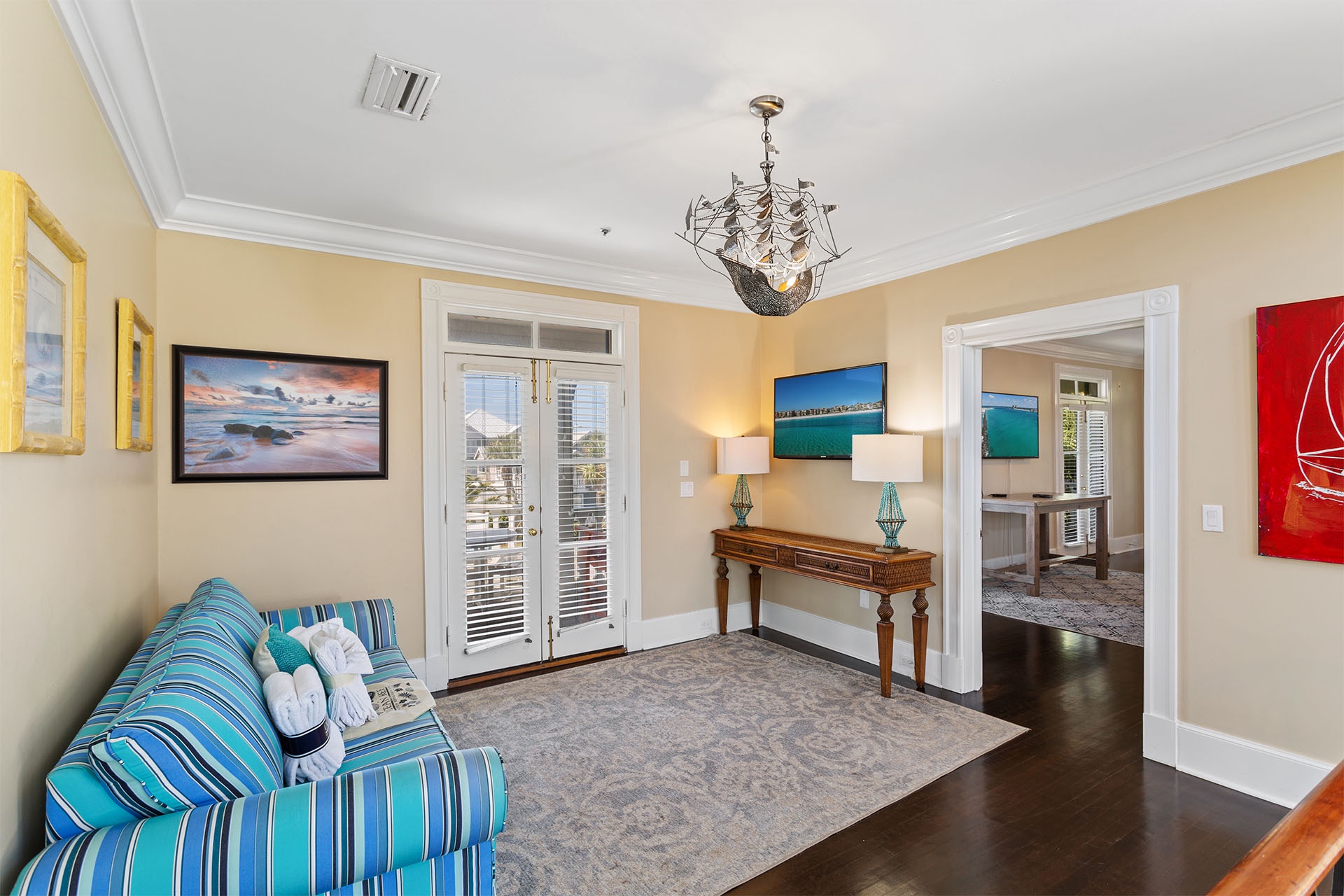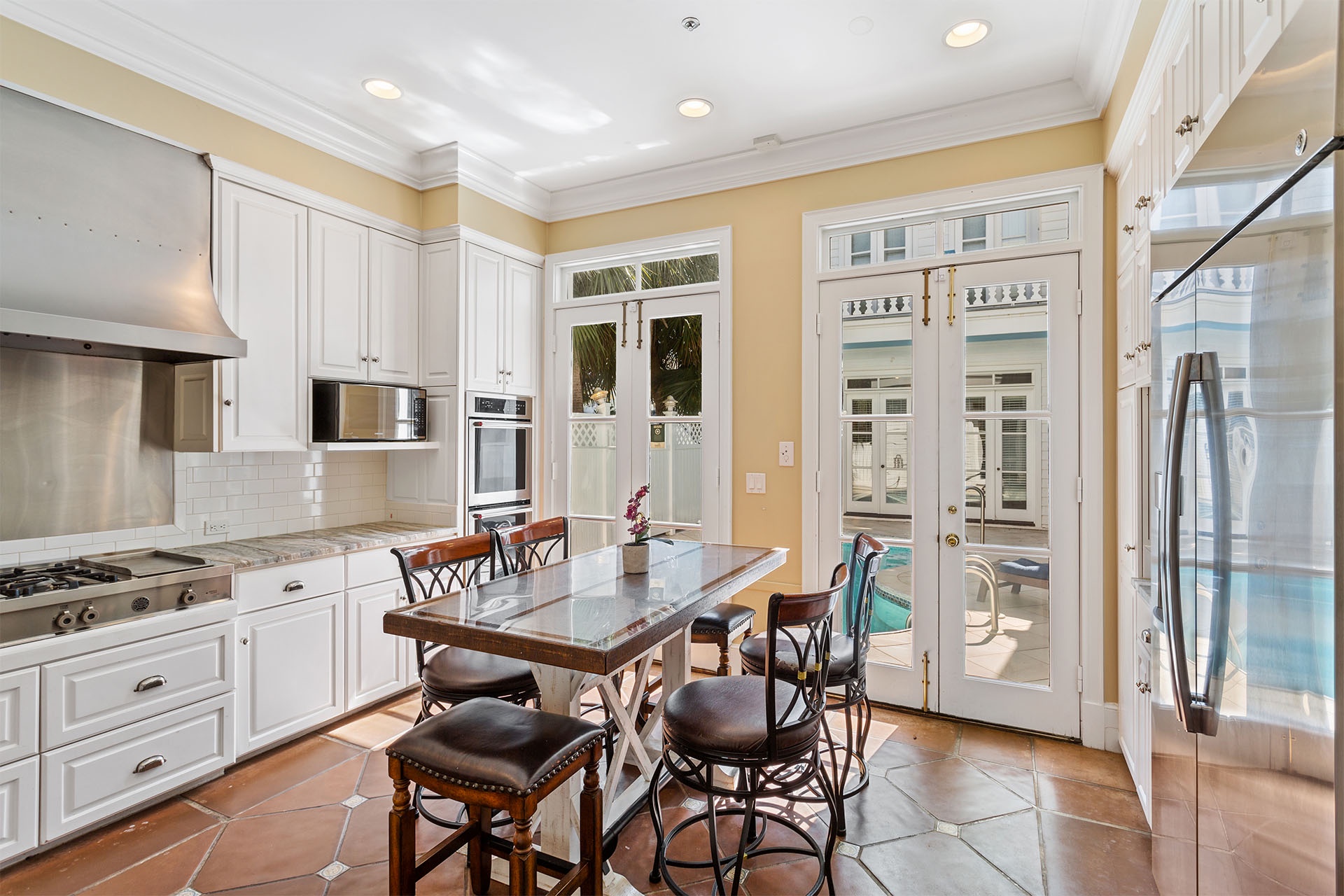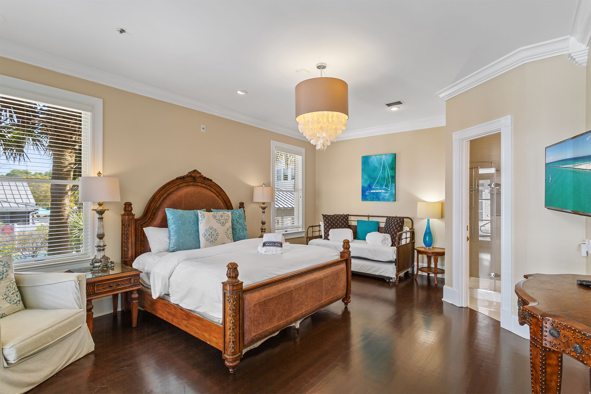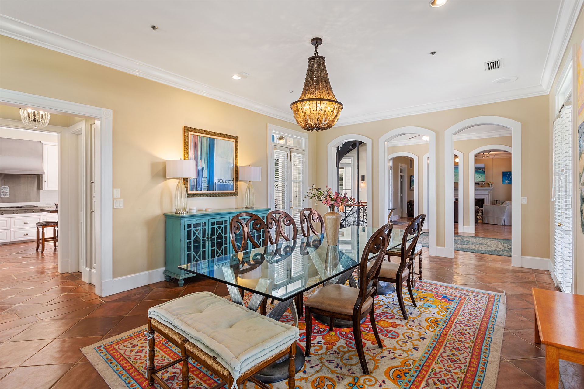 The interiors of Bare Feet Retreat are filled with an eclectic mix of comfortable furnishings and chic décor. The open living, dining, and kitchen area provide access to the covered porch and pool patio. Three dark leather couches and a cream-colored accent chair face a large flatscreen TV mounted above a regal fireplace mantle for entertainment. Richly tanned oversized tile flooring throughout accentuates a Mediterranean coastal-styled look. A large formal dining area features a long rectangular glass-topped table with a unique swirled metal base on a colorful decorative rug beneath a vintage chandelier. Elegant, richly scrolled chairs sit on the sides, while two white cushioned-topped hardwood benches sit on each end. The spacious kitchen features white custom cabinetry, upscale stainless steel appliances, and a dark hardwood table with rich, handsome raised seating. On this level, one of the guest bedrooms has a king-sized bed, a twin day bed, and a twin trundle bed. It features a private bath with a walk-in shower and access to the patio. A convenient half bath near the kitchen serves as a powder room.