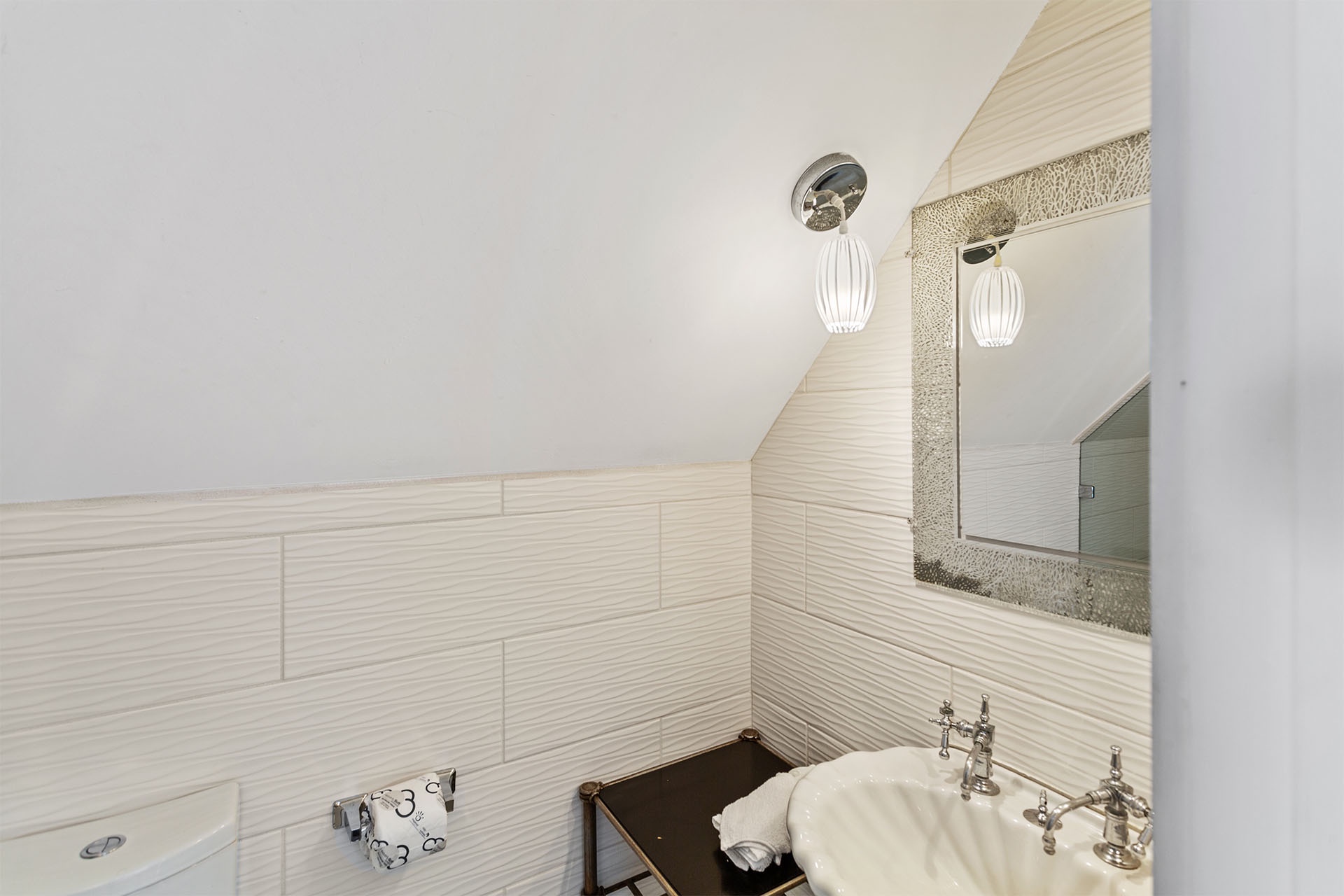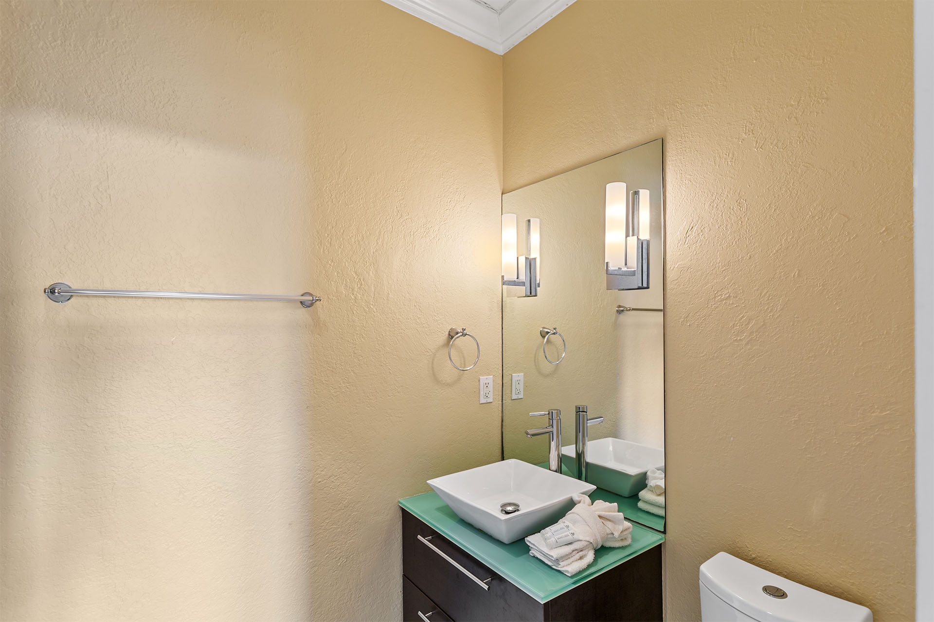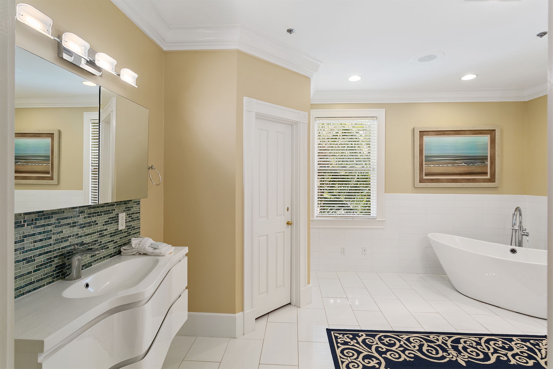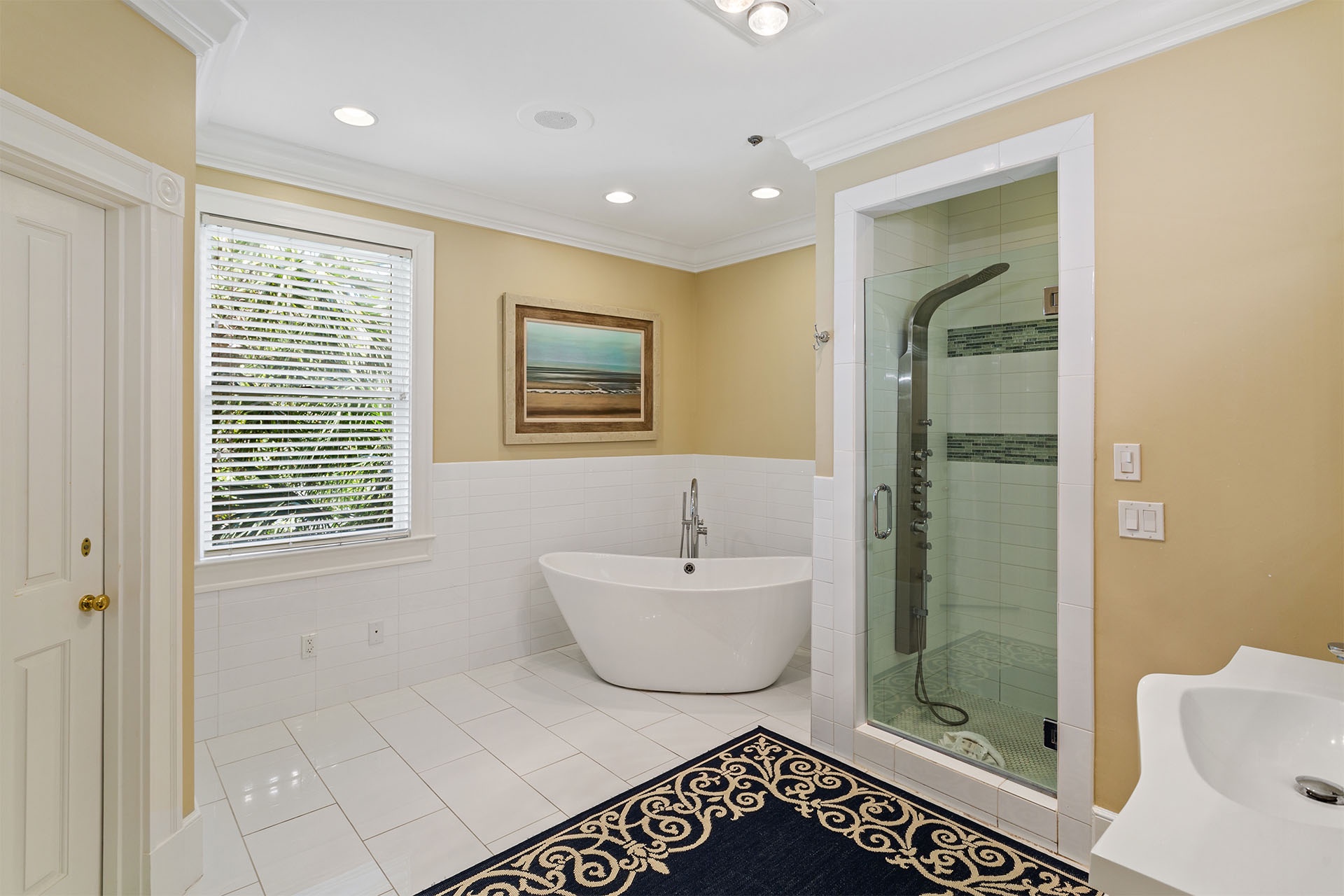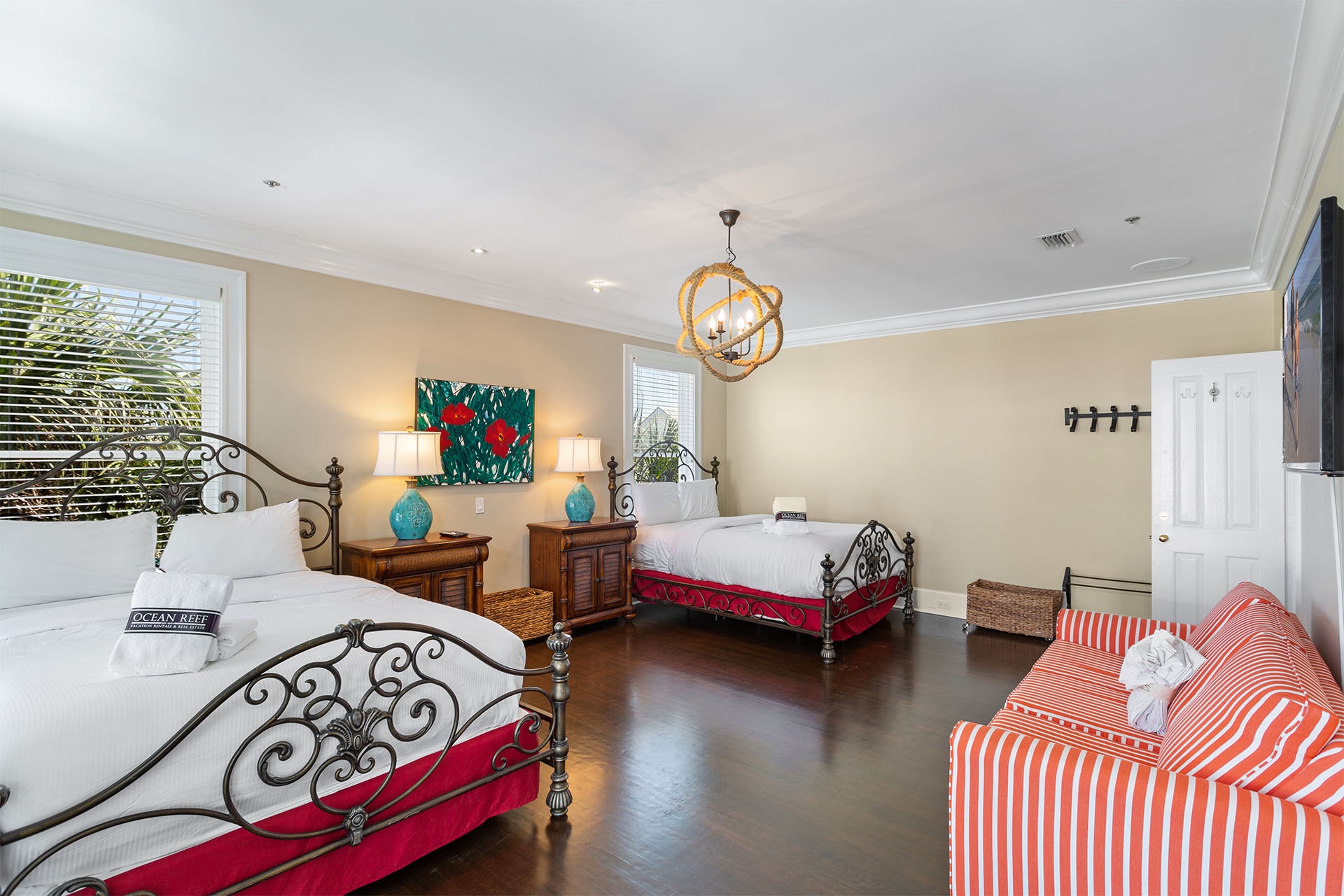 The interiors of Bare Feet Retreat are filled with an eclectic mix of comfortable furnishings and chic décor. The open living, dining, and kitchen area provide access to the covered porch and pool patio. Three dark leather couches and a cream-colored accent chair face a large flatscreen TV mounted above a regal fireplace mantle for entertainment. Richly tanned oversized tile flooring throughout accentuates a Mediterranean coastal-styled look. A large formal dining area features a long rectangular glass-topped table with a unique swirled metal base on a colorful decorative rug beneath a vintage chandelier. Elegant, richly scrolled chairs sit on the sides, while two white cushioned-topped hardwood benches sit on each end. The spacious kitchen features white custom cabinetry, upscale stainless steel appliances, and a dark hardwood table with rich, handsome raised seating. On this level, one of the guest bedrooms has a king-sized bed, a twin day bed, and a twin trundle bed. It features a private bath with a walk-in shower and access to the patio. A convenient half bath near the kitchen serves as a powder room.