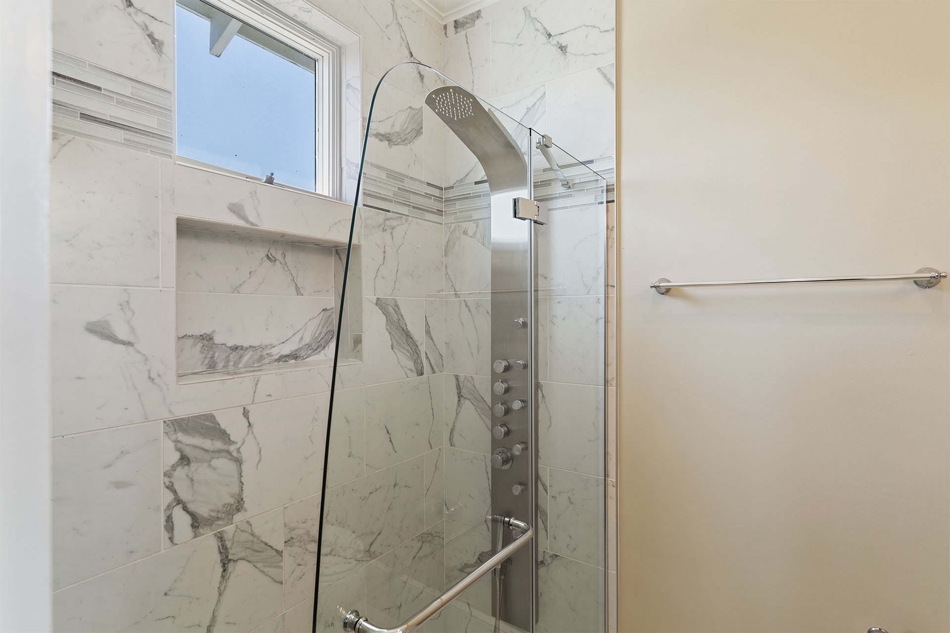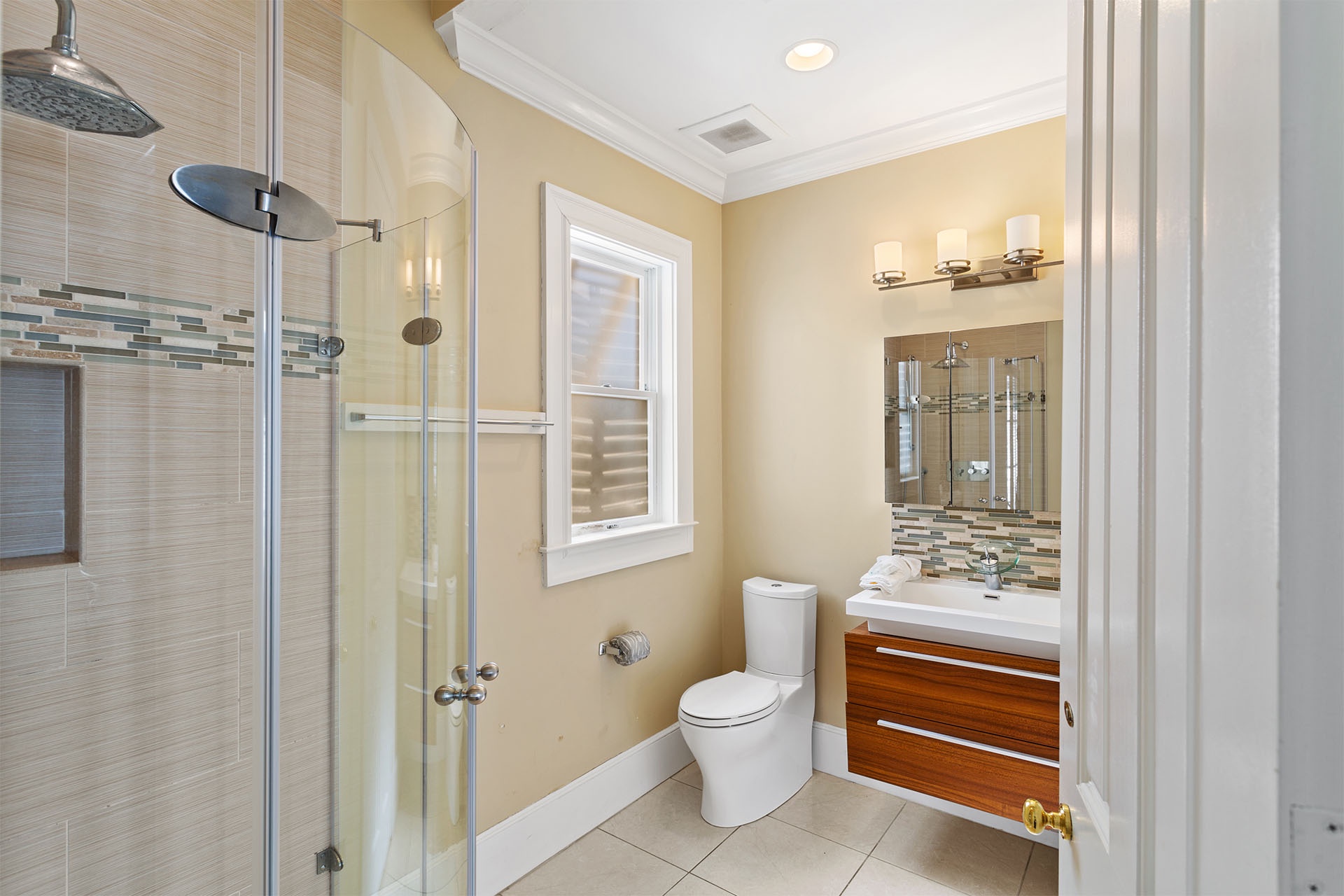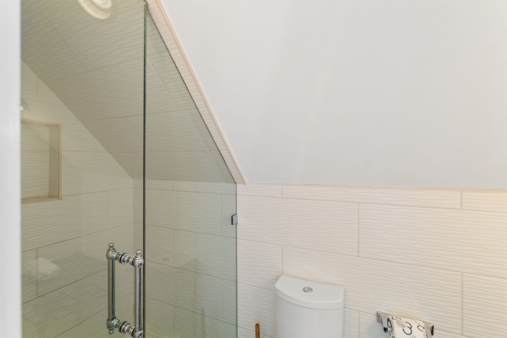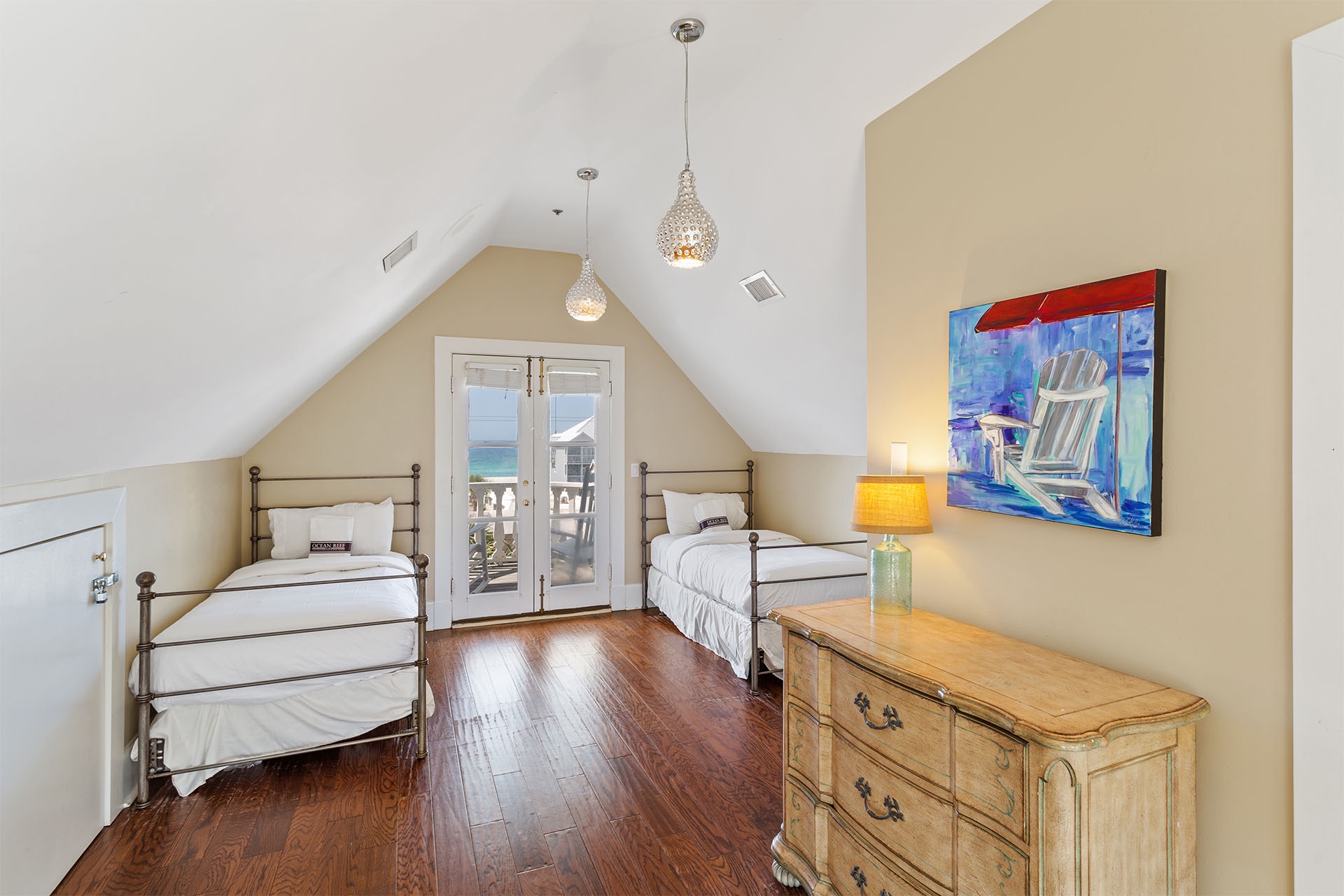 Fourth Floor: Bedroom with Two Twin Beds and Walk-In Shower + Balcony Access.