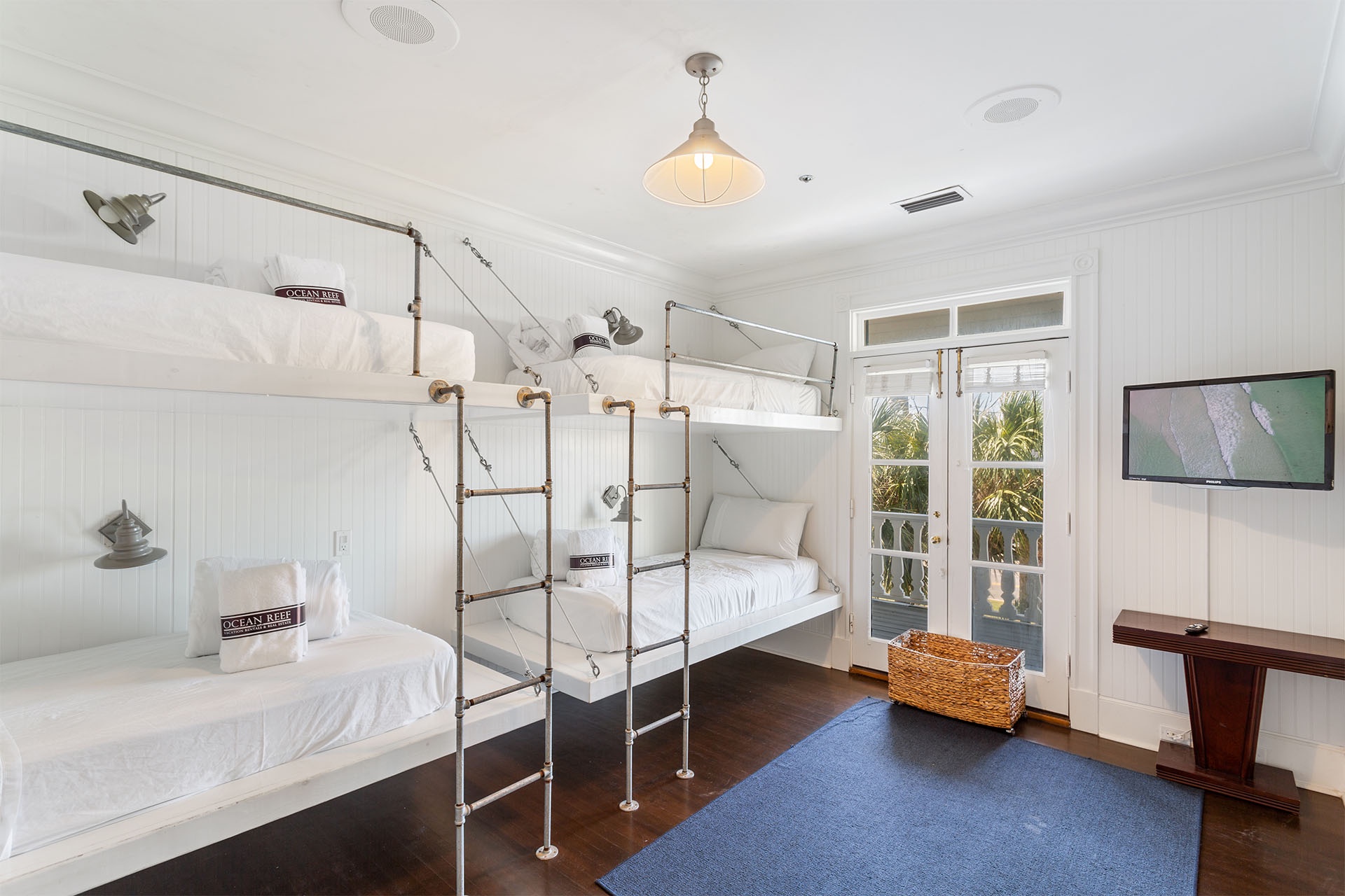 Second Floor (Main Entry): Living Room with Queen Sleeper Sofa and Patio Access, Kitchen, Dining, King Bedroom with Twin Day Bed and Twin Trundle + Walk-In Shower and Patio Access, Powder Room.