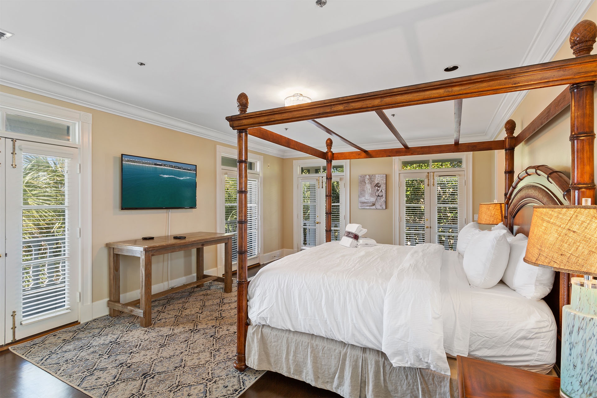 The beautifully appointed master bedroom and three more guest bedrooms are on the upper floor. Each room includes an ensuite luxury bath and individual access to the wraparound balcony. The master bedroom has a palatial four-poster king-sized bed with a richly carved headboard facing an extra-large flatscreen TV mounted above a wide rustic side table. The luxurious ensuite bath features double vanity sinks, a deep soaking tub, and a walk-in shower. One guest bedroom has a full-sized bed, while another has two queen beds with decorative metal frames. A bunk room includes four ship-like twin beds. All bedrooms have access to a stylishly furnished den with a couch and a large flatscreen TV. The top floor includes a bonus guest quarters with two twin beds, an ensuite bath with a walk-in shower, and access to an intimate gulf view balcony.