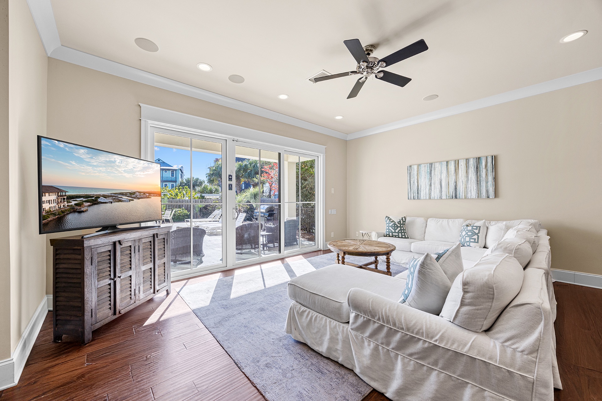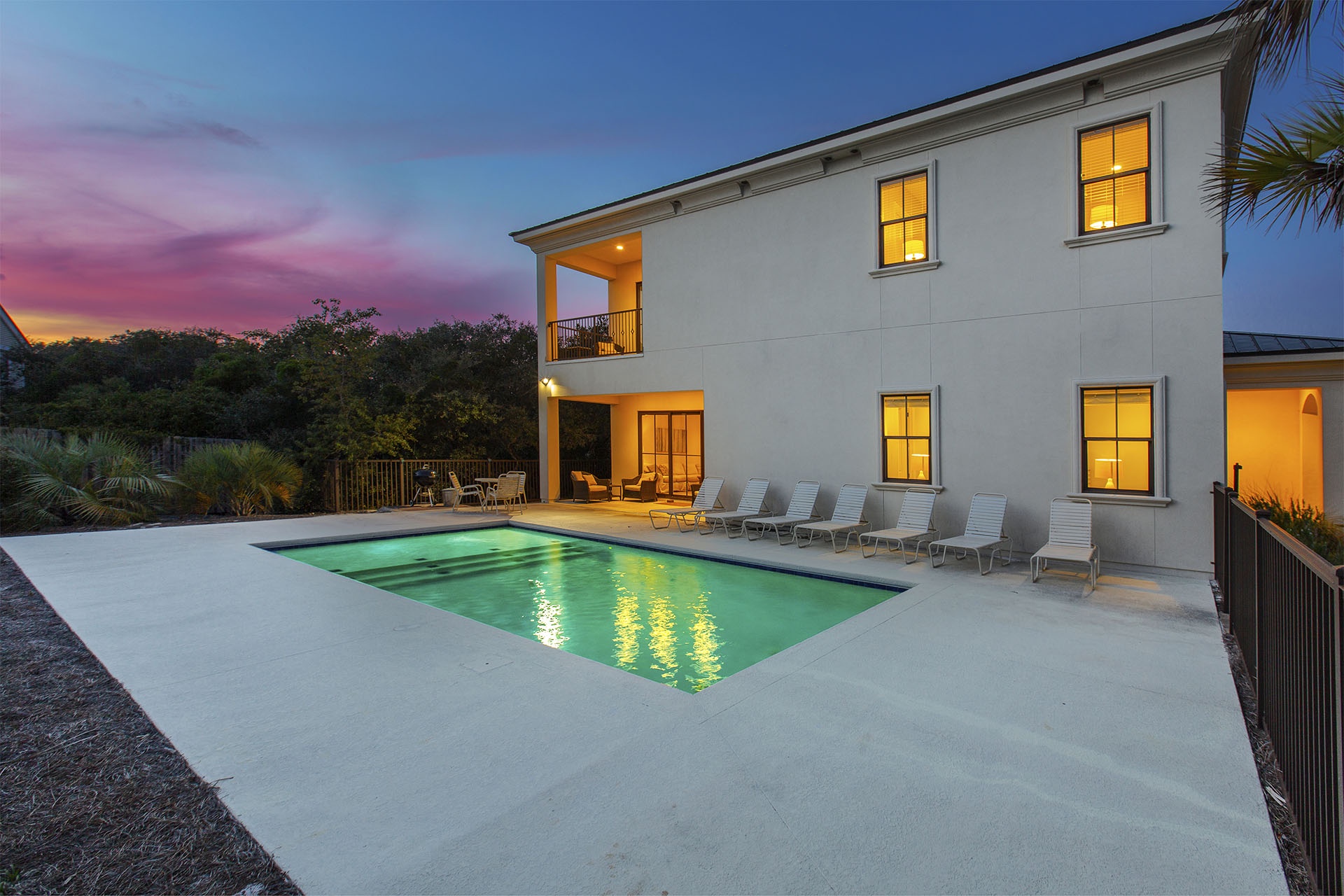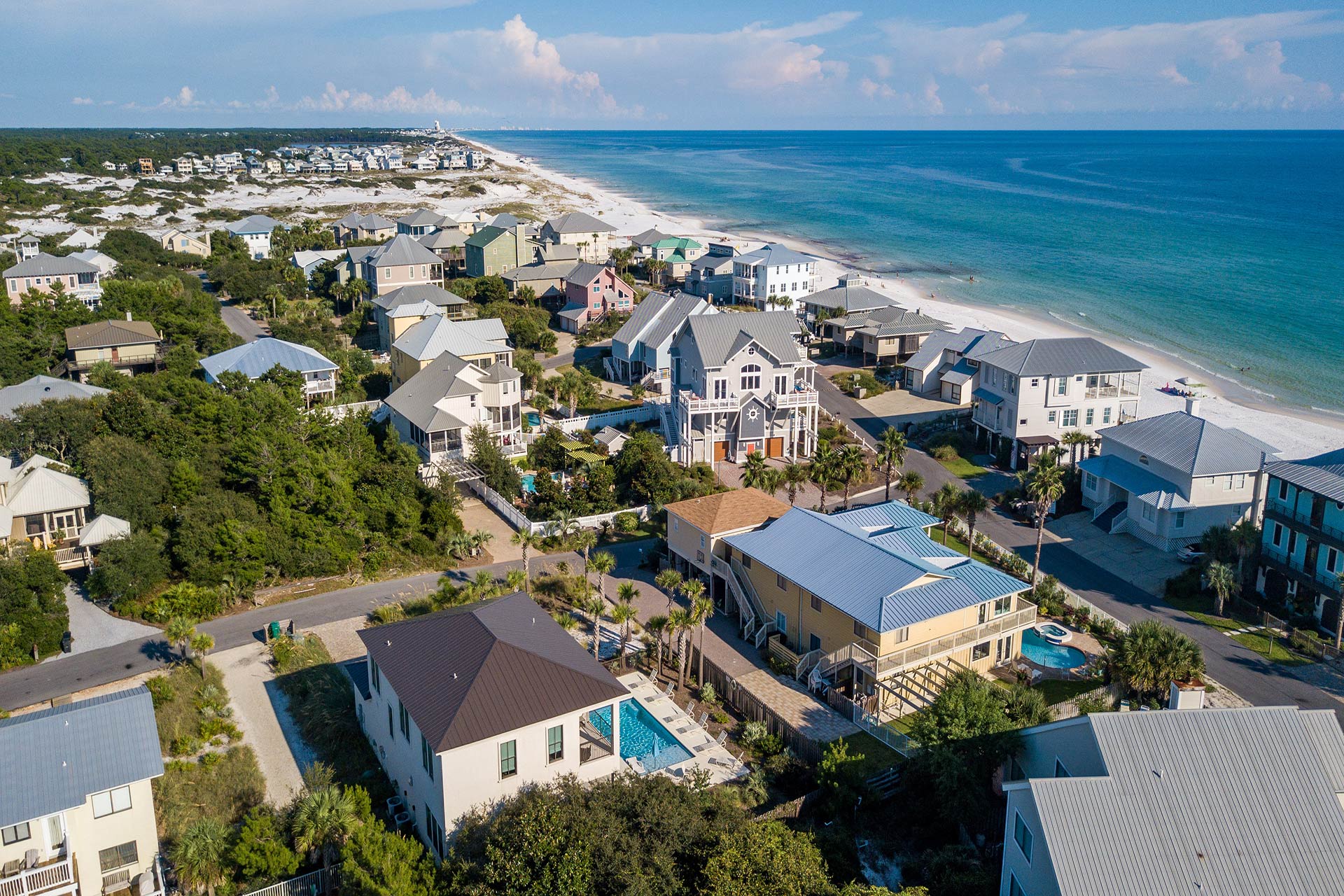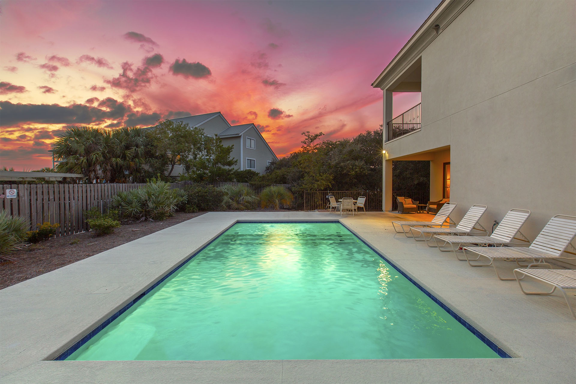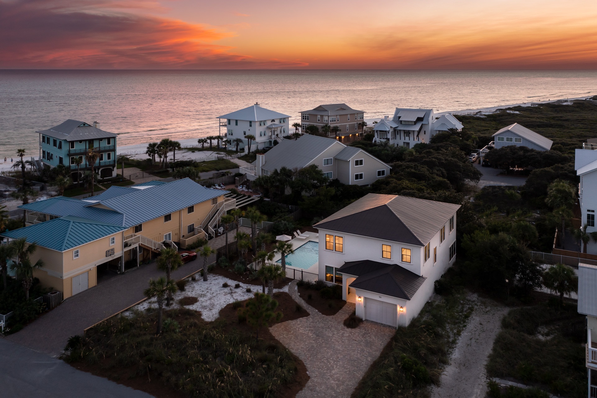 This hospitable home is situated just steps away from the sugary shore and emerald-hued waters of the glowing gulf. A rare coastal dune lake is right down the beach. This additional body of water is scarce and found in only a few other places in the world. This lake has a magical composition created when the dunes periodically open a freshwater estuary connection to the Gulf's salt water. Besides splashing around in the surf, you may want to catch some fish or go paddle boarding on this serene lake. You also have the option of taking a refreshing pool plunge right out back. This gracious home has its own 38' x 16' private saltwater swimming pool. It features colorful LED lights for a magical evening effect and an expansive patio studded with tropical palms that's perfect for lounging around and having fun.