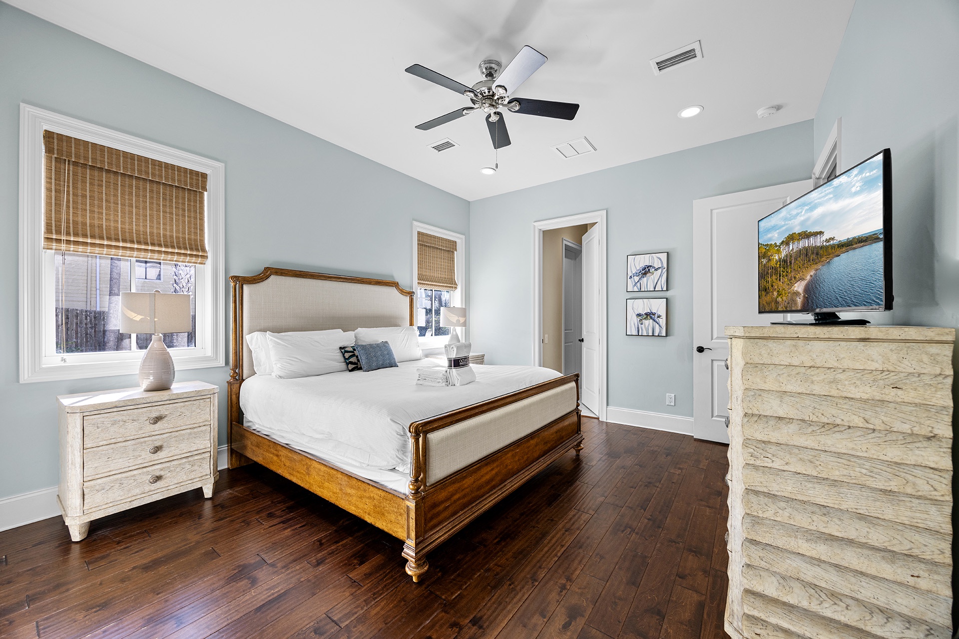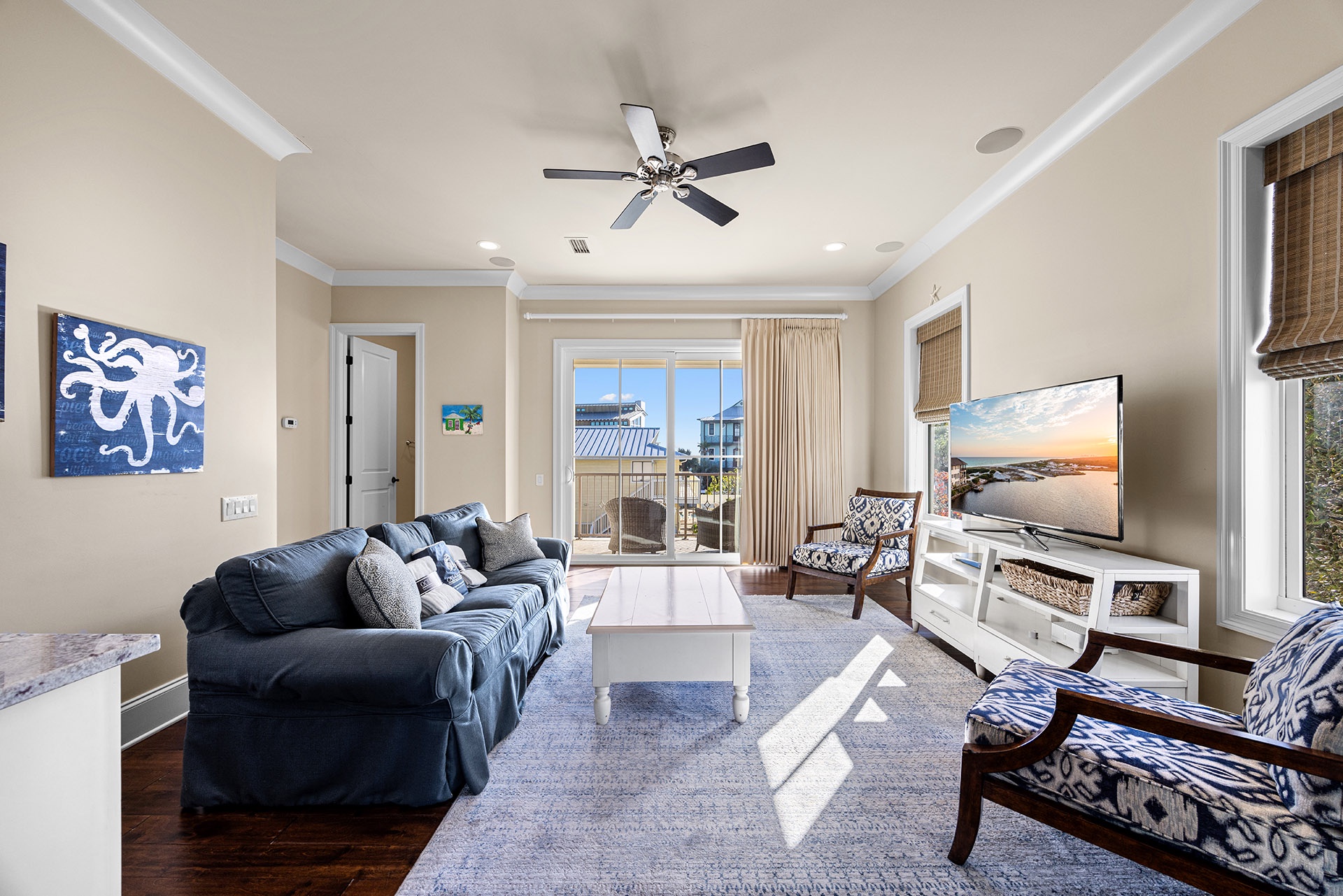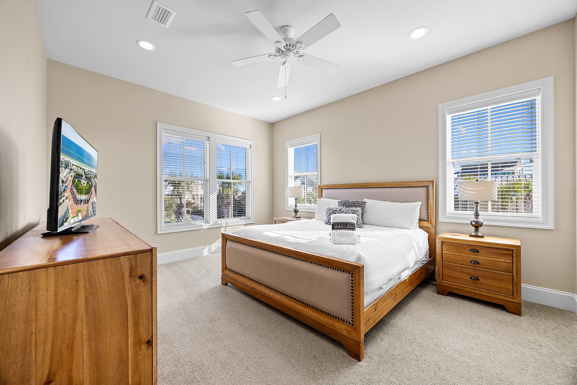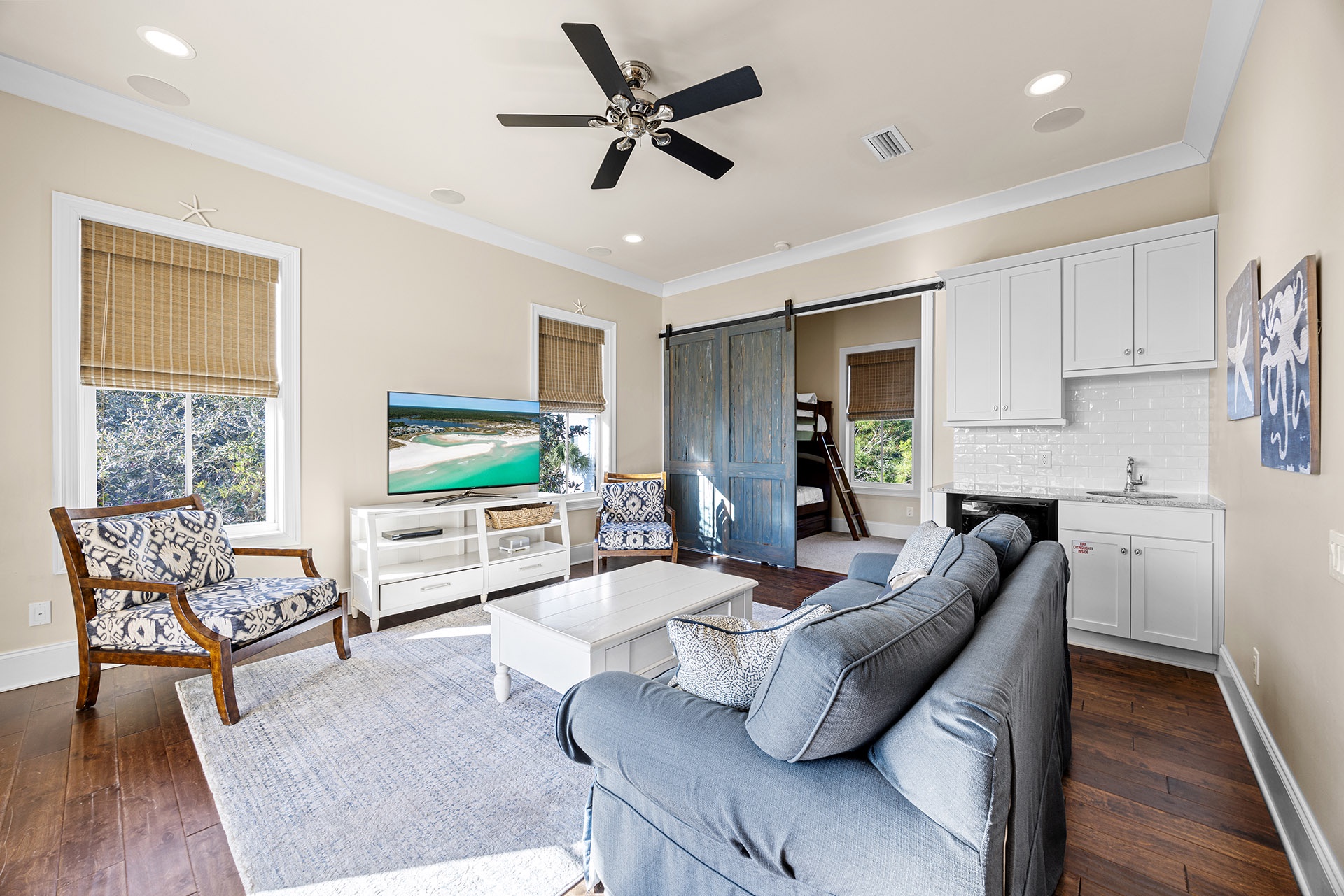 The first floor showcases a Master Bedroom with a king-sized bed beside windows that look out upon the pool patio. A private en-suite bath includes a glass-walled walk-in shower. A half bathroom off the hallway serves as a convenient powder room. The cottage-styled Guest Quarters are upstairs with access to a large nautically attired den with a queen-sized sleeper sofa, a big TV, a Wet Bar with a wine cooler, and glass doors leading to a furnished covered balcony overlooking the pool. One Guest Bedroom has a king-sized bed and en-suite bath. Two full hall baths serve the other Guest Rooms with queen beds in two and double twin bunks in the other.