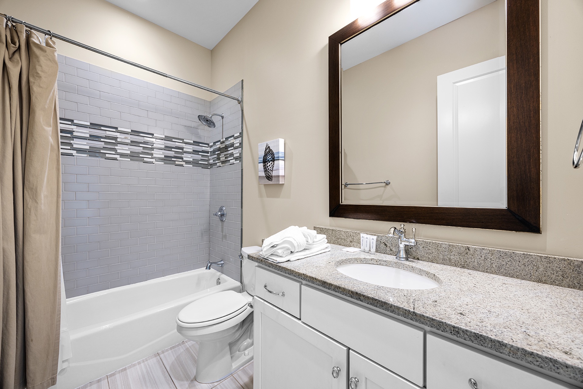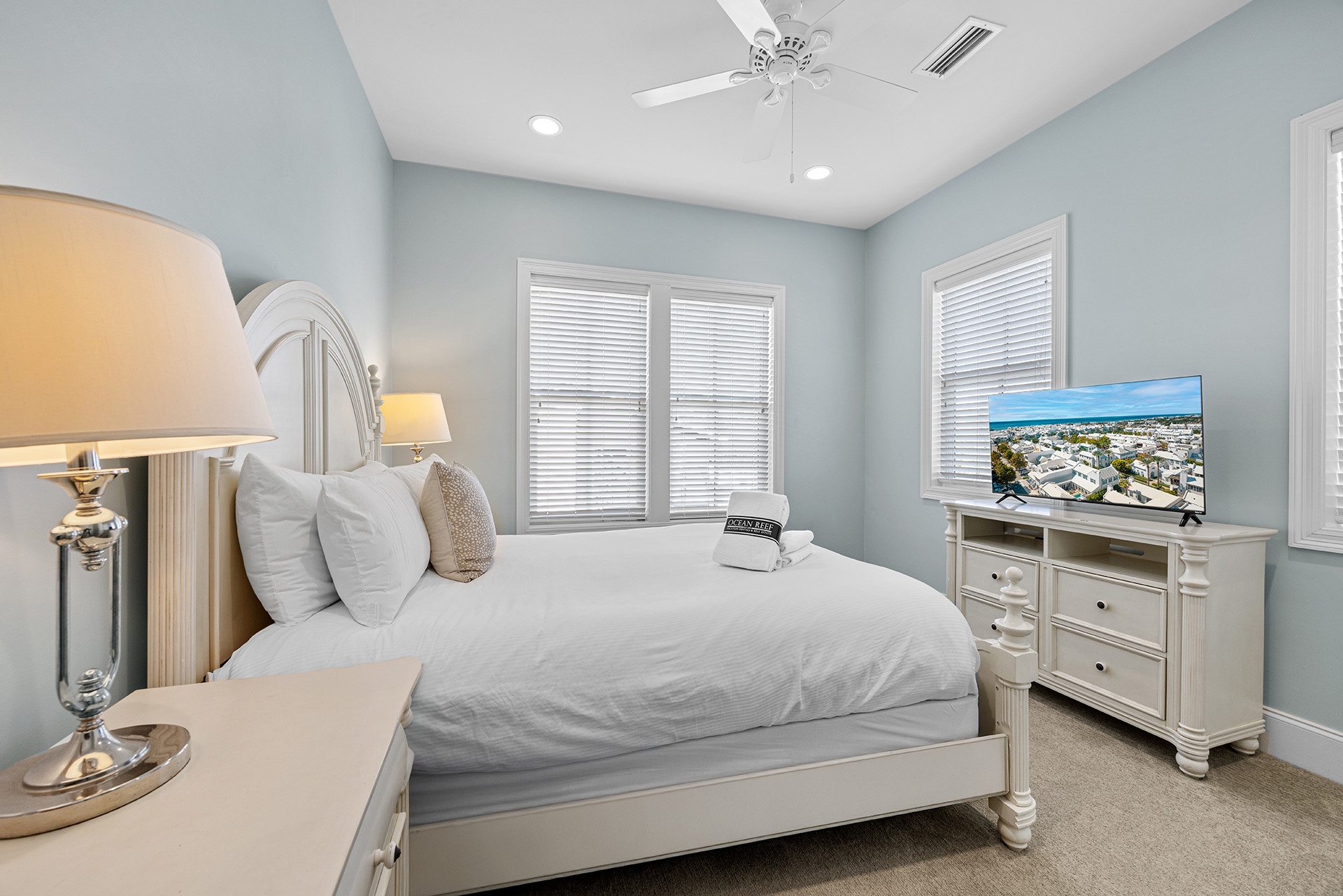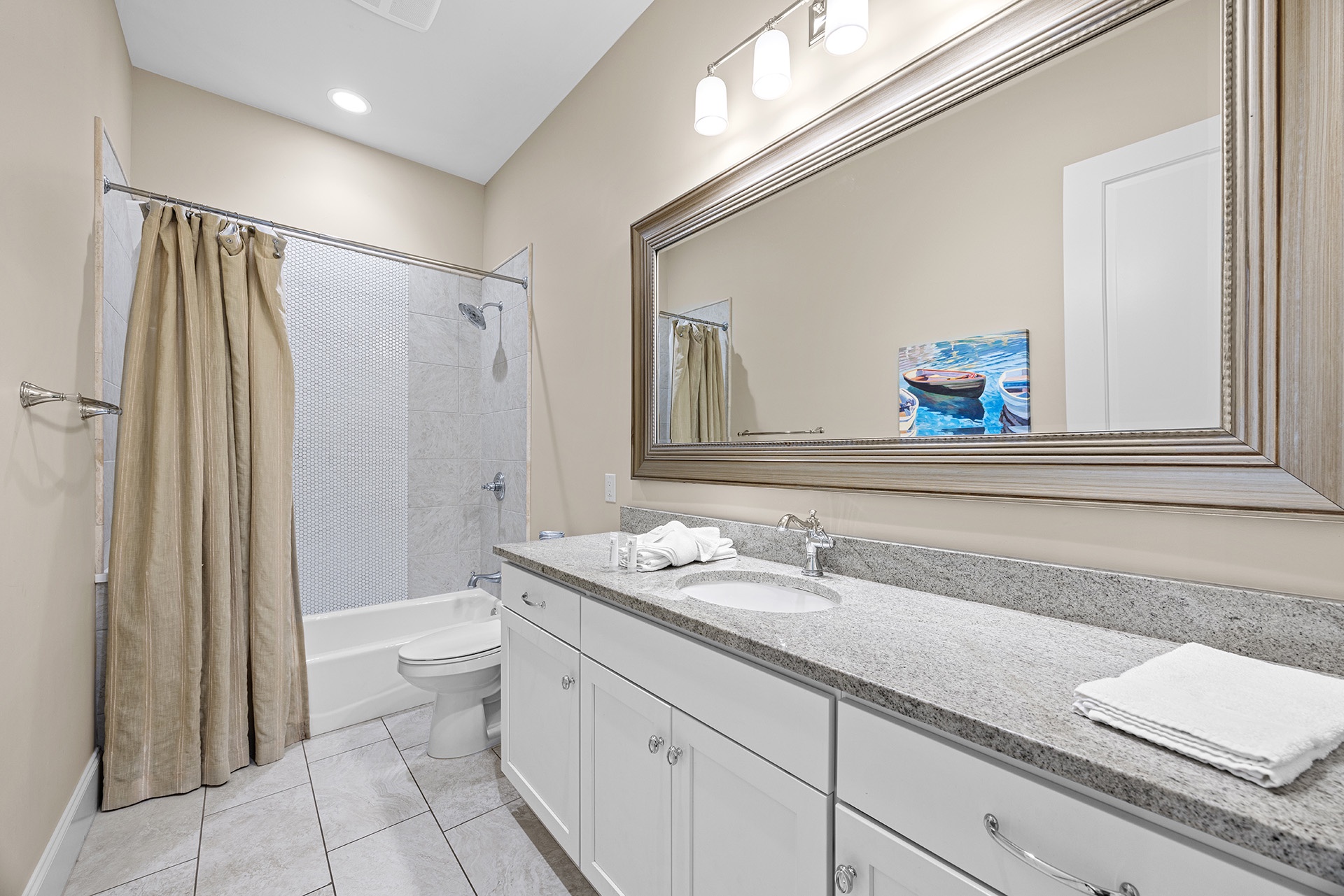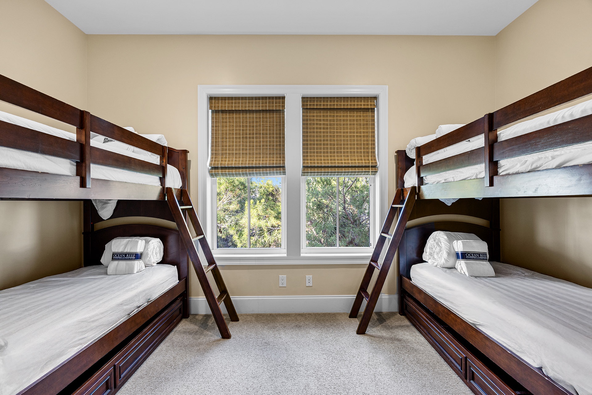 The first floor showcases a Master Bedroom with a king-sized bed beside windows that look out upon the pool patio. A private en-suite bath includes a glass-walled walk-in shower. A half bathroom off the hallway serves as a convenient powder room. The cottage-styled Guest Quarters are upstairs with access to a large nautically attired den with a queen-sized sleeper sofa, a big TV, a Wet Bar with a wine cooler, and glass doors leading to a furnished covered balcony overlooking the pool. One Guest Bedroom has a king-sized bed and en-suite bath. Two full hall baths serve the other Guest Rooms with queen beds in two and double twin bunks in the other.