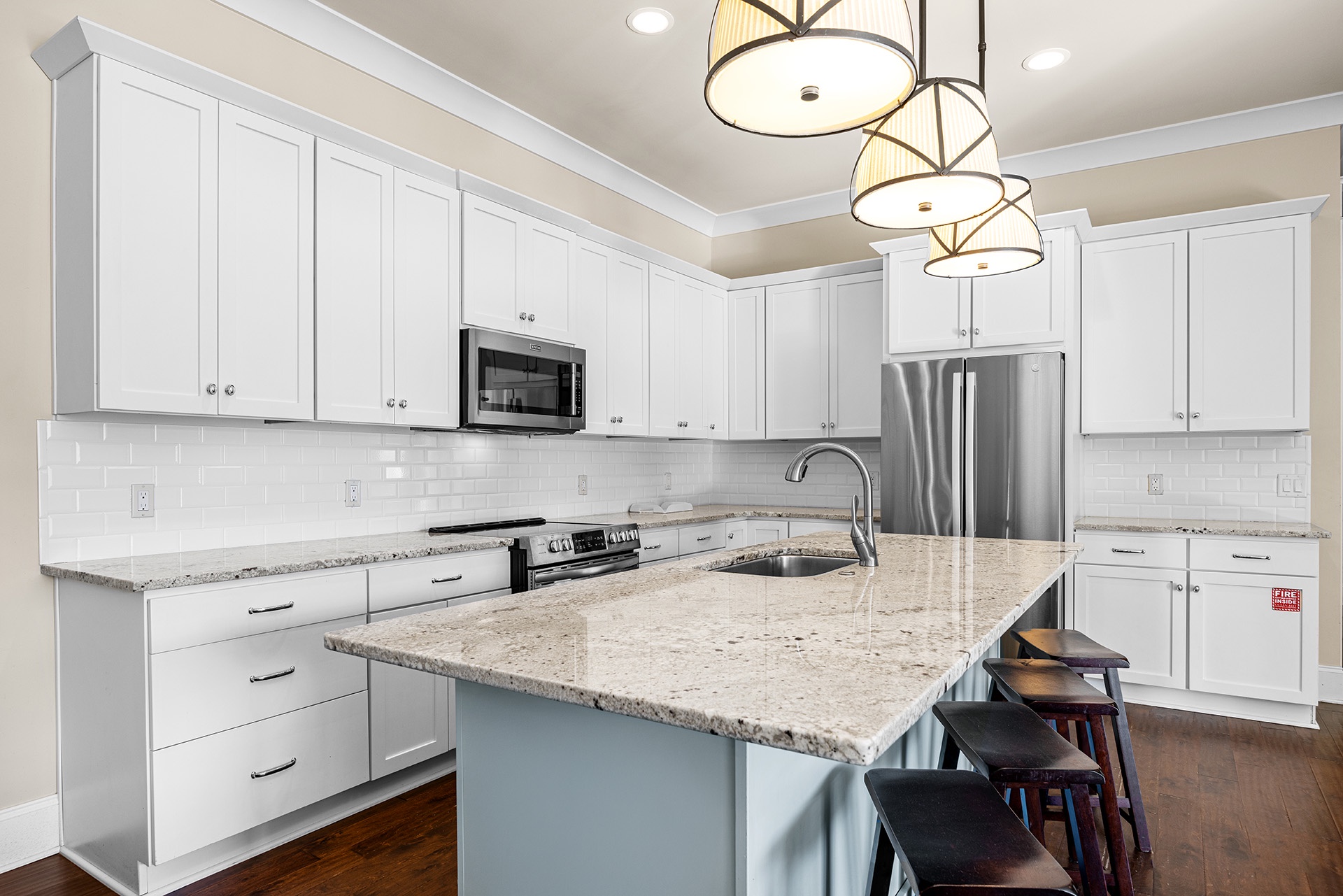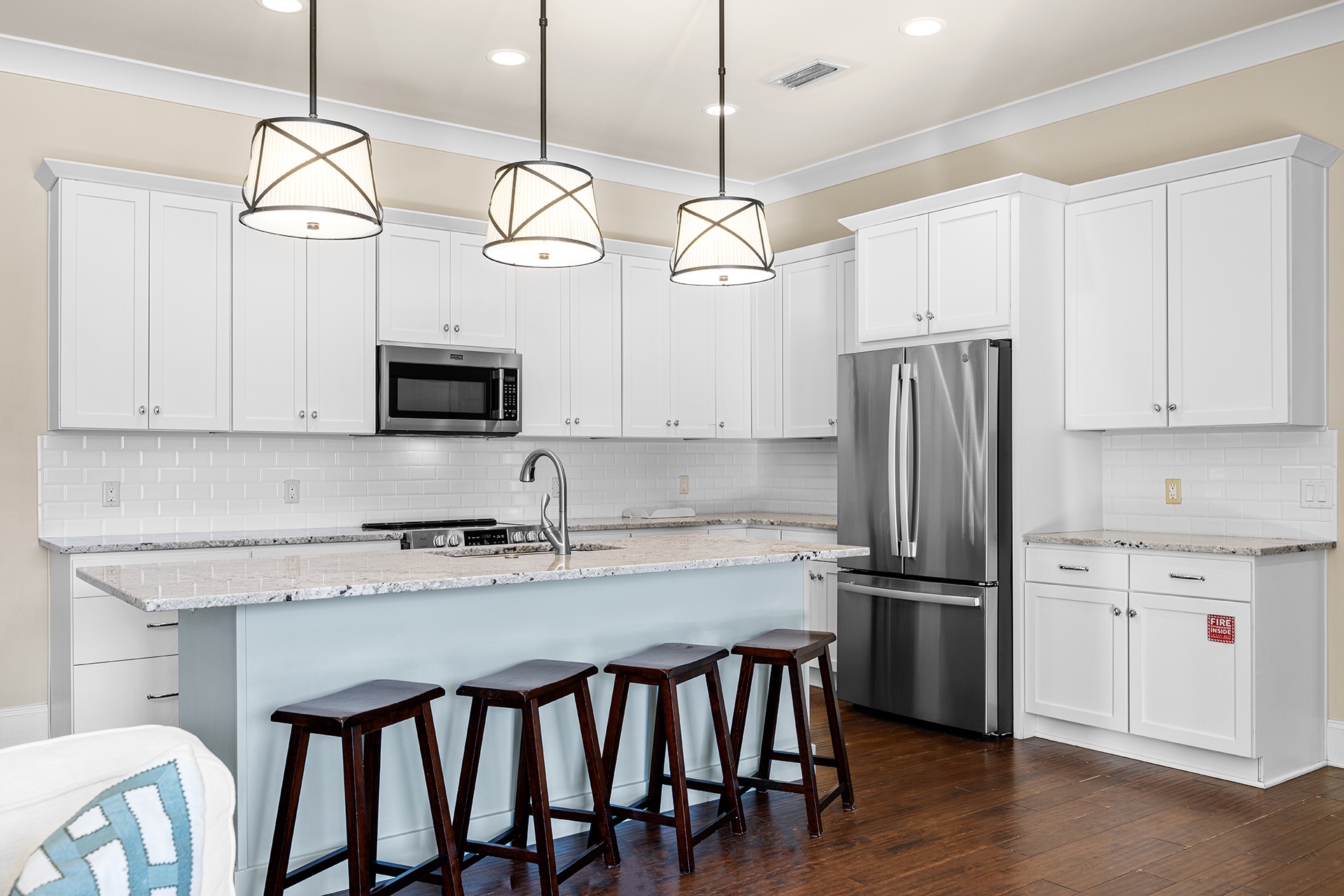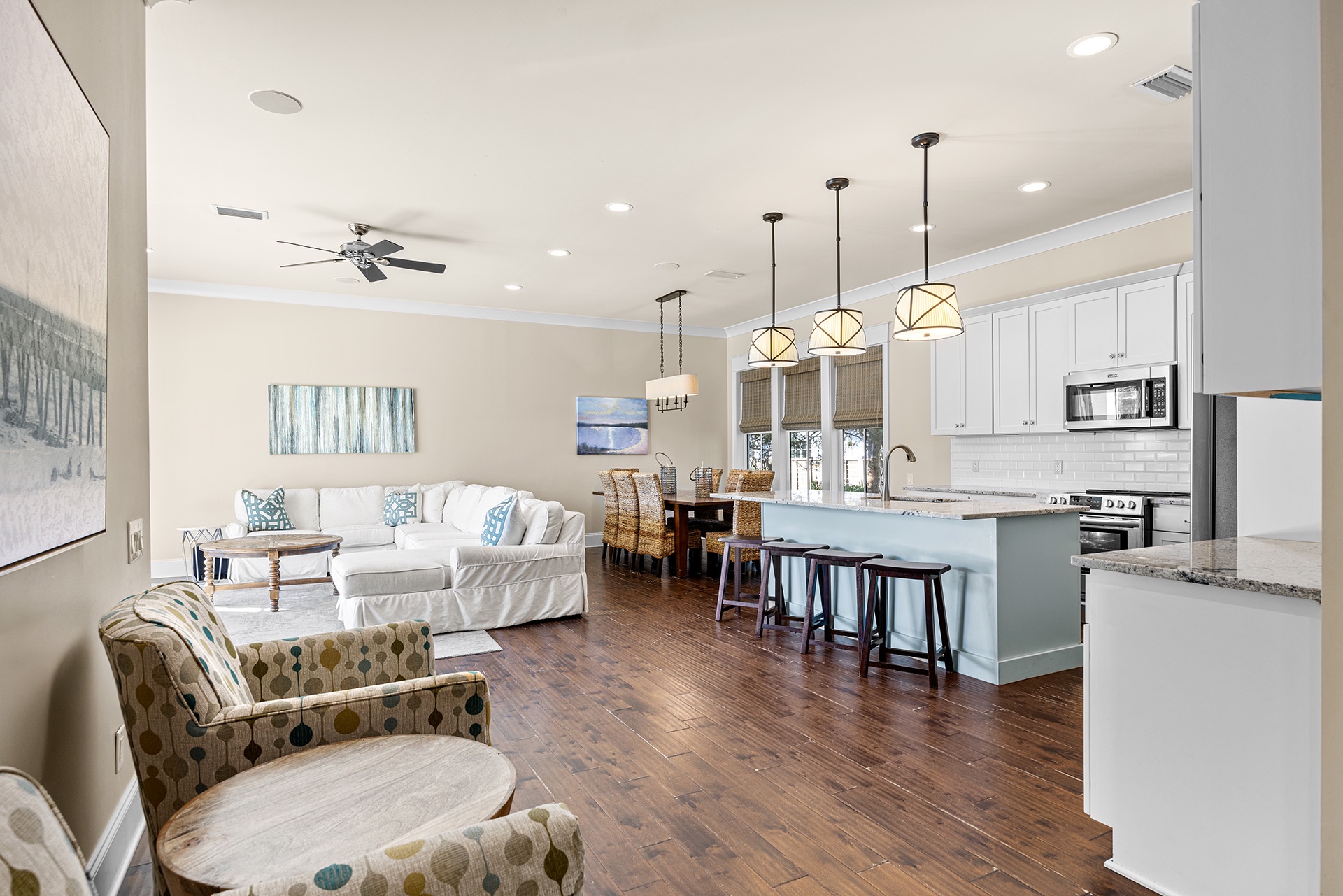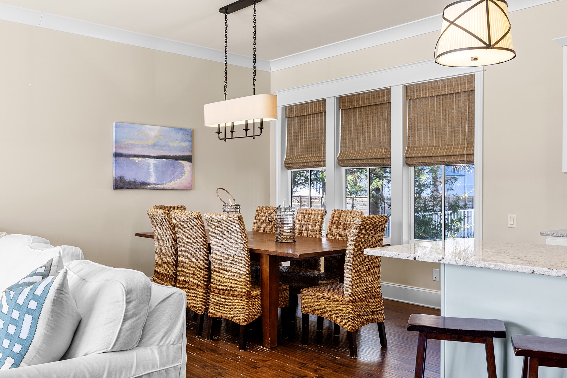 The open living and dining area has a triple panel of windows that look out onto the pool with a glass door for easy access. A white wrap-around couch faces these views, along with a large TV for entertainment. A rectangular hardwood dining table with eight high-backed straw woven chairs has a tropical look and inspires family feasts. The open kitchen has everything you need to make this happen. It also has a granite-topped bar with saddle-topped stools where drinks and appetizers may be served.