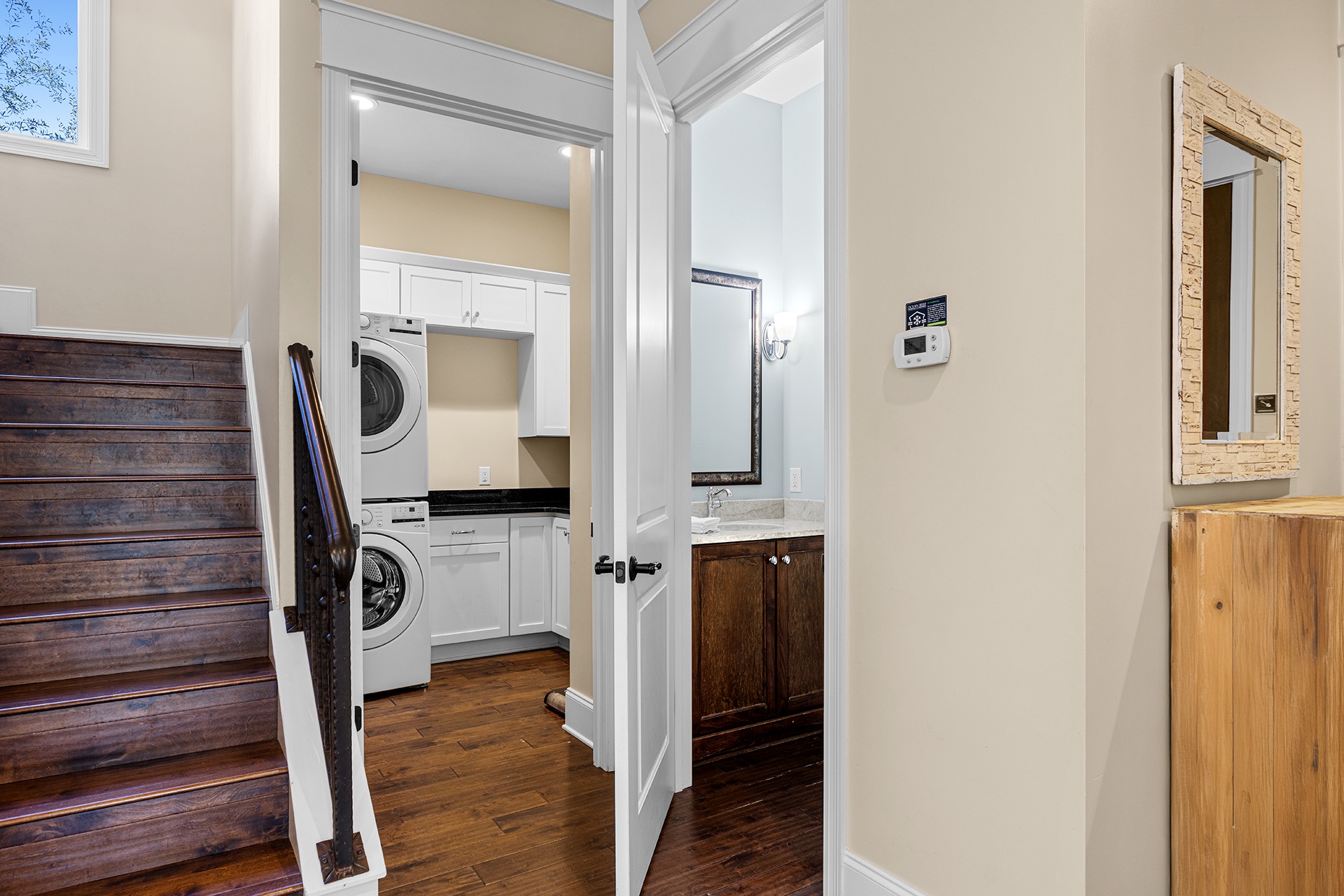 First Floor: Living Room with Patio Access, Dining, Kitchen, King Bedroom with Walk-In Shower and Patio Access, Powder Room, Laundry.