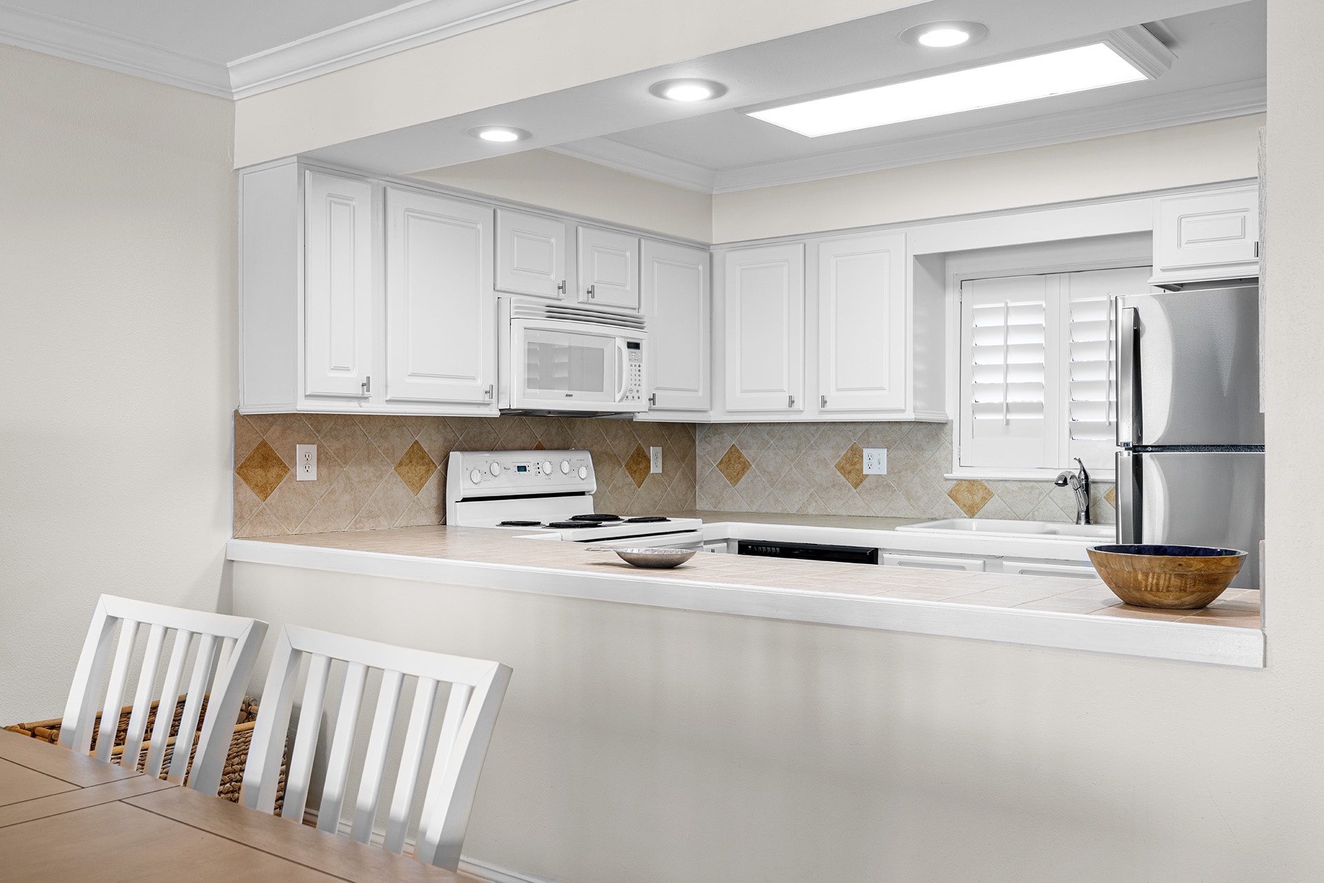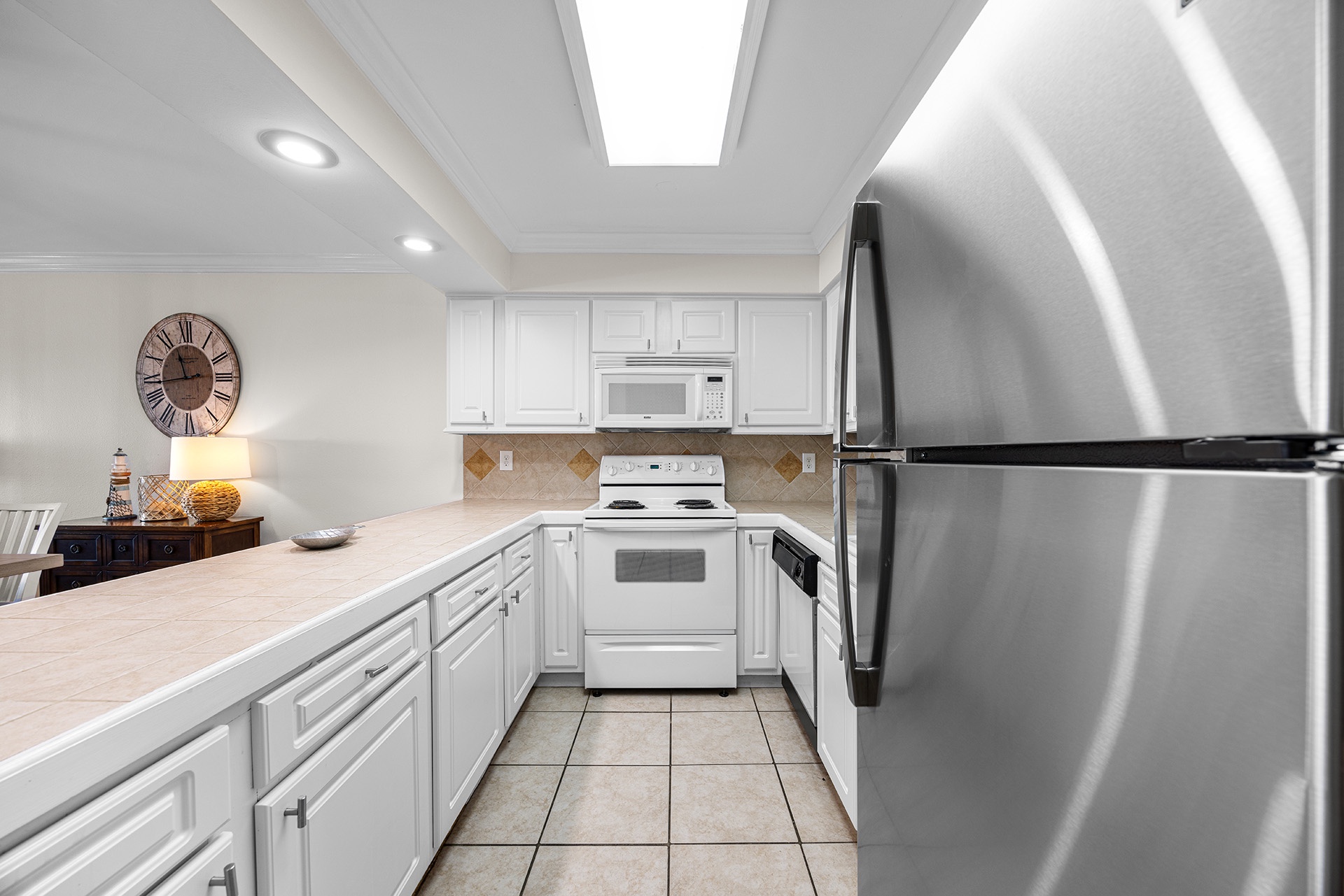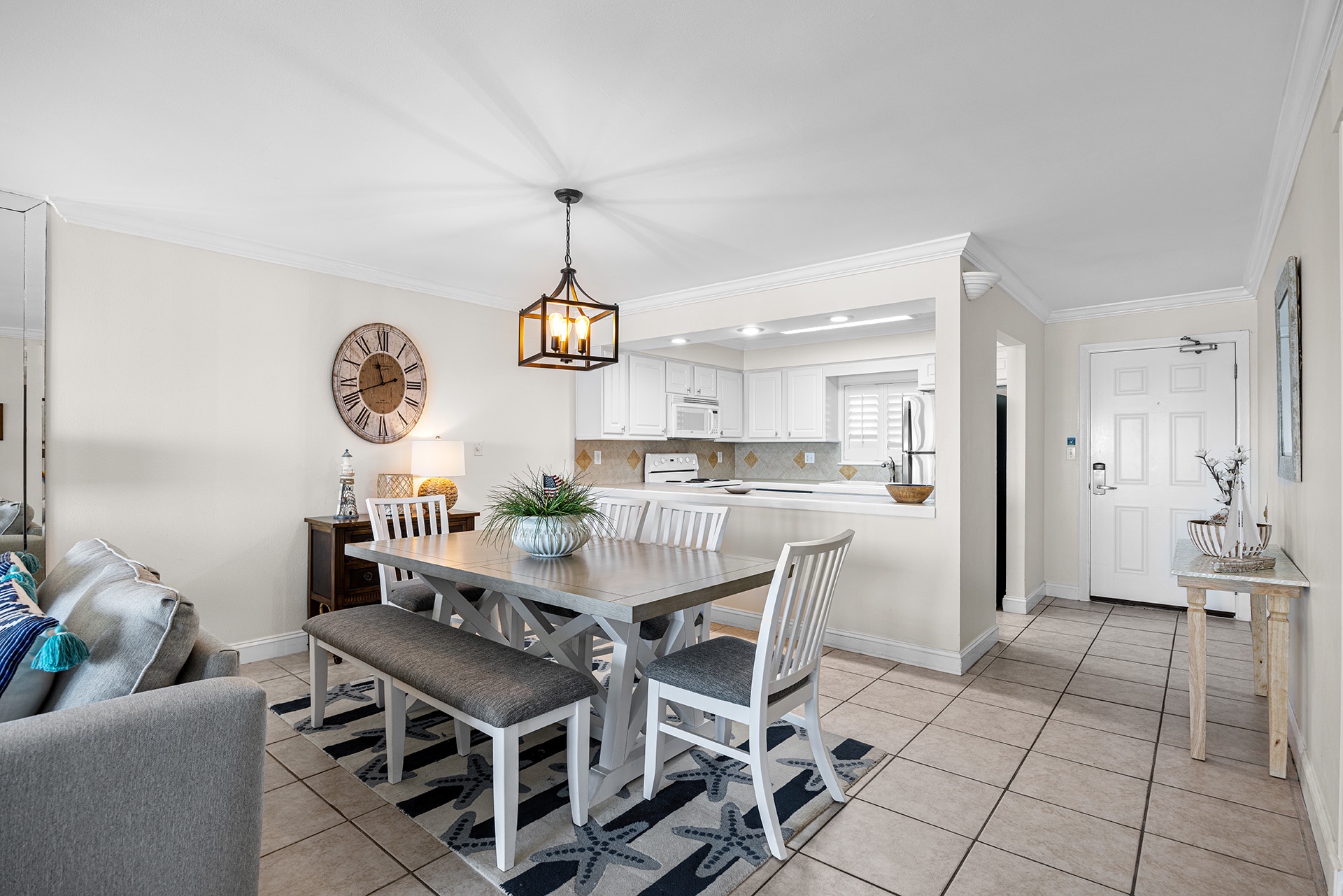 Huntington By The Sea 302 is a spacious third-floor condo with light parchment-colored tile, a mirrored wall, and sliding glass doors that frame views of the sensational seascape. The beachfront balcony has a premier placement, providing glorious views of the Gulf and swimming pool below. It spans the condo's entire width with direct access from the living room and primary bedroom. The open living area has a plush couch, which doubles as a queen-sized sleeper sofa, plus a matching loves seat and chair that ensembles around a dark wood cocktail table. It faces a large flatscreen TV on a handsome hardwood console table and Gulf views highlighted by sliding glass balcony doors. A rectangle wood-topped table nearby sits beneath an elegant chandelier with four stylish high-backed chairs and a bench for charmed dining. The bright kitchen has white custom cabinetry with matching appliances to fulfill all culinary needs. A wide buffet-style bar is perfect for serving up tasty appetizers and treats.