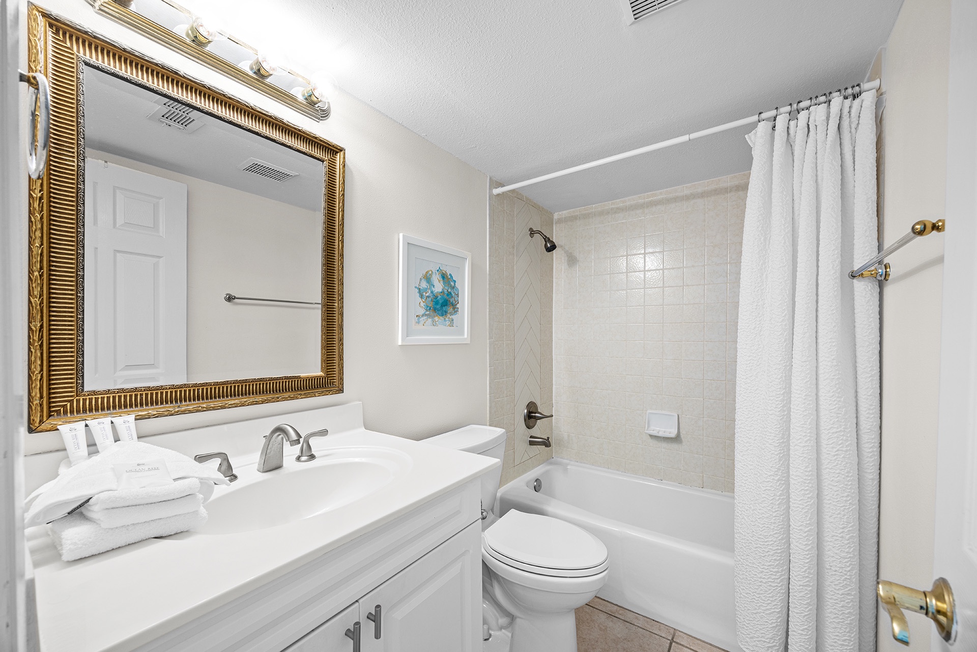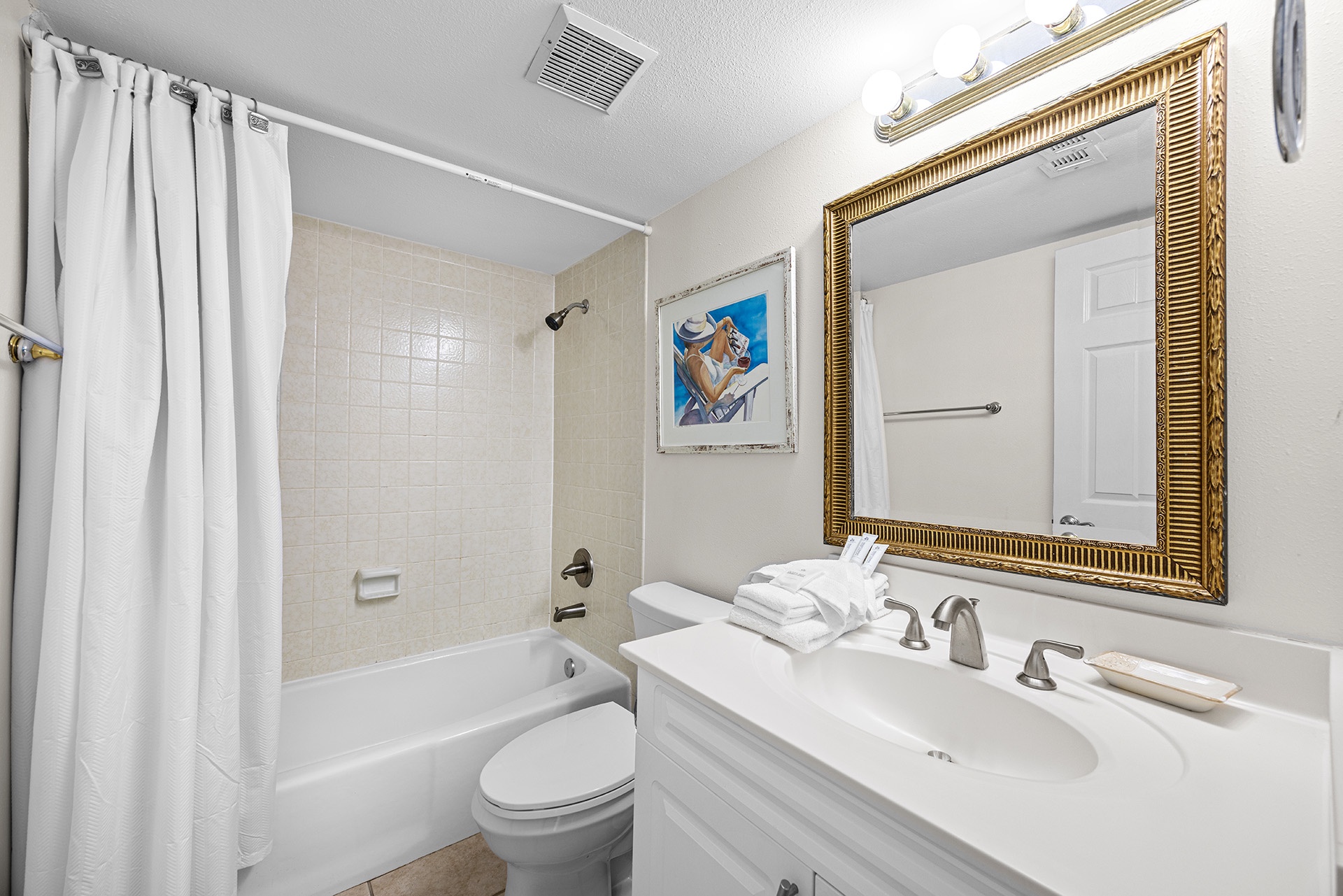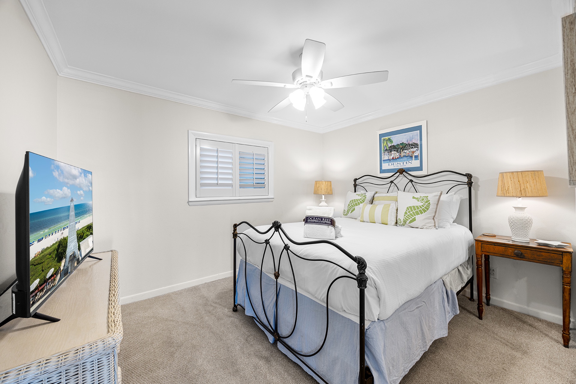 The primary bedroom has a king-sized bed with an ornate upscale driftwood-inspired bedroom set beside an entire wall of sliding glass balcony doors featuring glorious Gulf views. A large flatscreen TV sits on a hardwood dresser at the foot of the bed for nighttime viewing pleasure. A convenient ensuite bath includes a tiled tub-shower combination. The sunny guest bedroom has a clean, crisp look with a queen-size bed flanked by two antique side tables with lamps and has access to a full hall bath with a tub-shower combination.