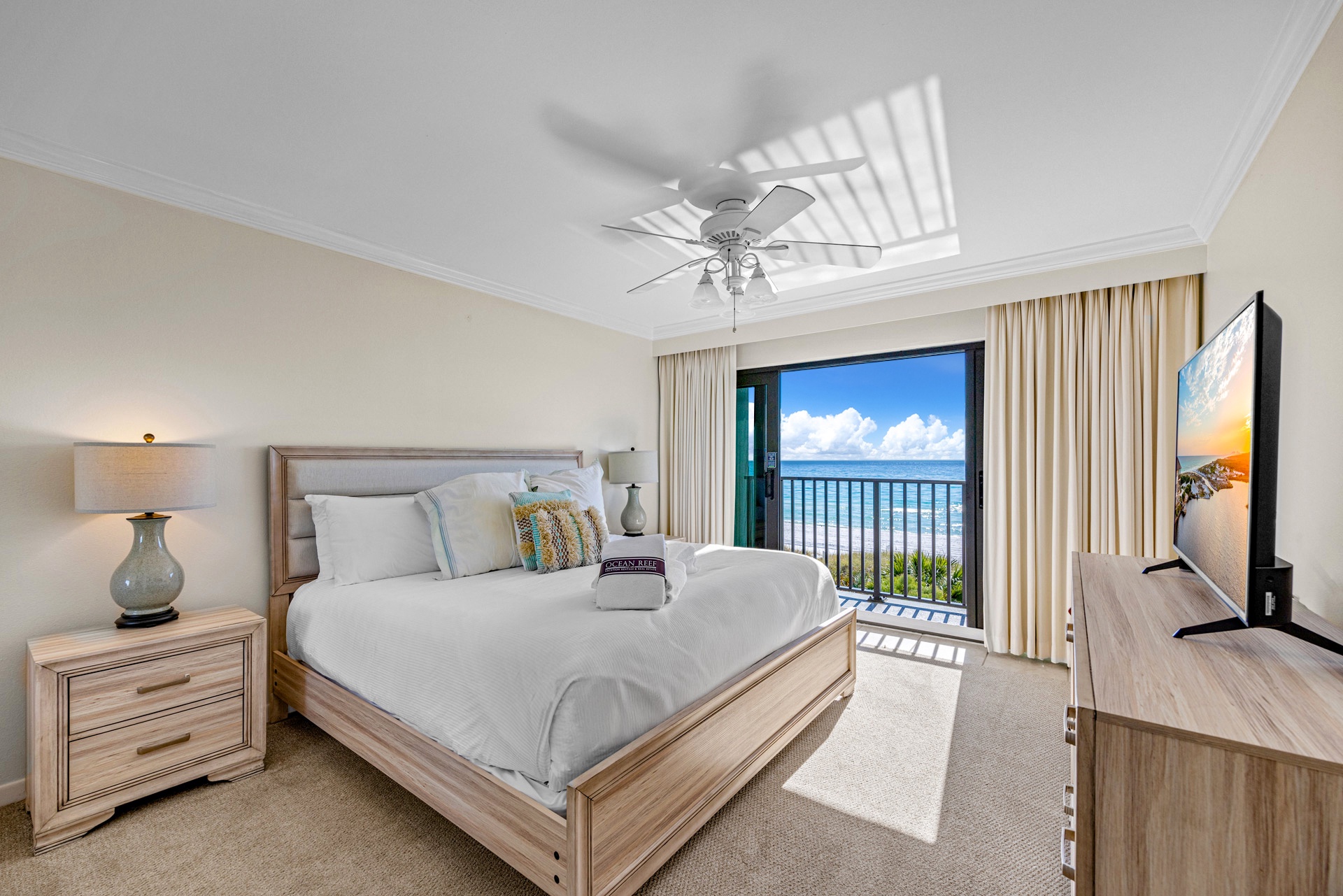 All One Level: Living Room with Queen Sleeper Sofa and Balcony Access, Kitchen, Dining, King Primary Bedroom with Tub/Shower Combo and Balcony Access, Queen Bedroom, Hall Bath with Tub/Shower Combo.