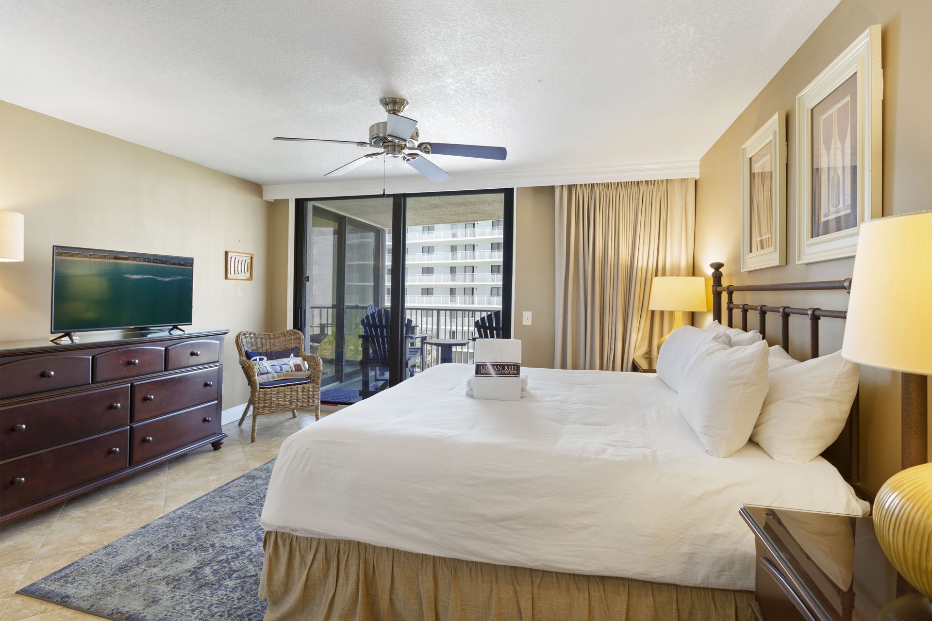 All One Level: Living Room with Queen Sleeper Sofa and Balcony Access, Kitchen, Dining, King Master Bedroom with Walk-In Shower and Balcony Access, Queen Bedroom with Shared Tub/Shower Combo, Laundry.