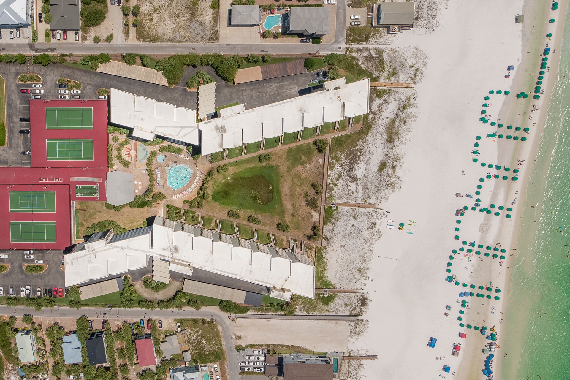 The fantastic amenities at Mainsail include a large swimming pool centered between two buildings near the beach. It is adorned with tropical plantings around an expansive sun patio, a big bubbling hot tub, and a wading pool for children. A colorful playground nearby with a unique mini waterfall invites kids to frolic around in delight as it cascades down upon them. A walkway leads across a lush lawn to the resort's bright shimmering shoreline, which features a complimentary beach service. Besides the beautiful beach and gulf view swimming pool, another pool is available for use across the grounds on the resort's north side. Two grilling stations are provided for fun outdoor barbeques with family and friends. A fitness center overlooks the pool and includes showers and a dressing room. Four tennis courts and shuffleboard are nearby that are lighted at night for cooler play.