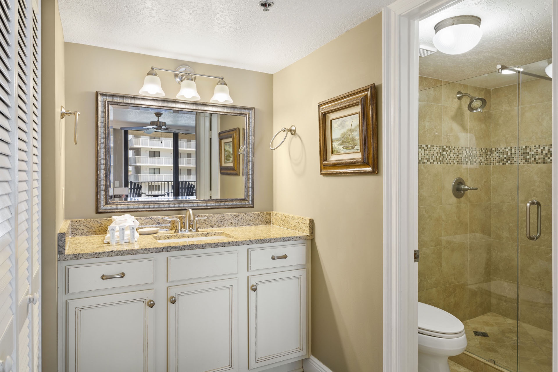 The handsome master bedroom has a king-sized bed with a black decorative metal headboard next to sliding glass doors with direct access to the balcony. Rich dark chocolate hardwood furnishings include a dresser with a flatscreen TV for nighttime viewing pleasure and two bedside tables. The private bath includes a mottled granite-topped vanity and a walk-in shower. The charming cottage-style guest bedroom has a sunny window, a queen-sized bed, a flatscreen TV, and access to a full hall bath that doubles as a powder room.