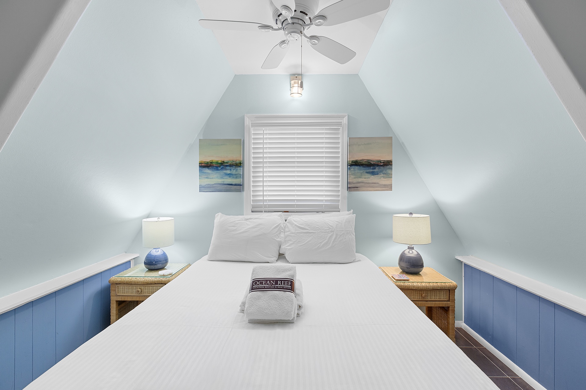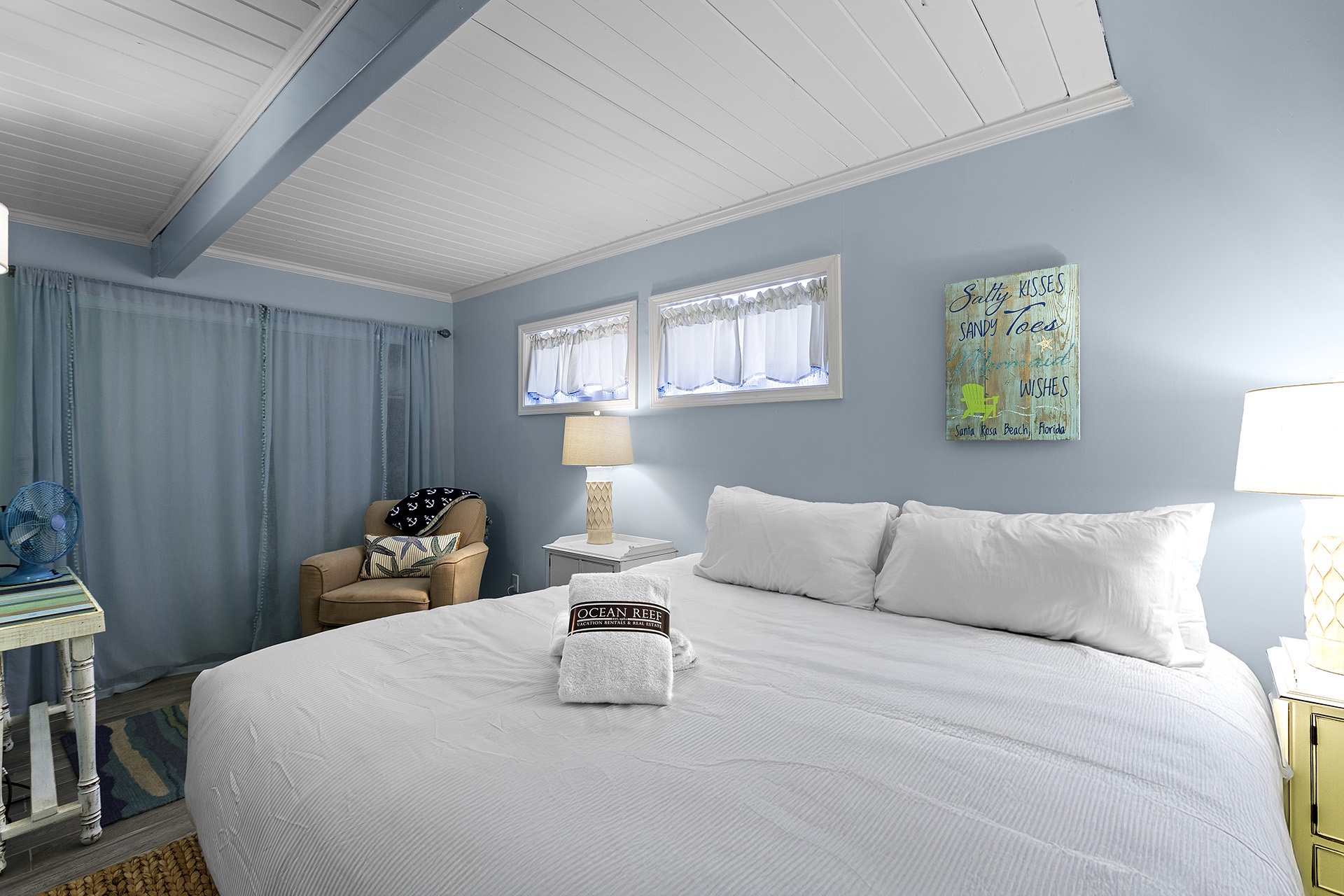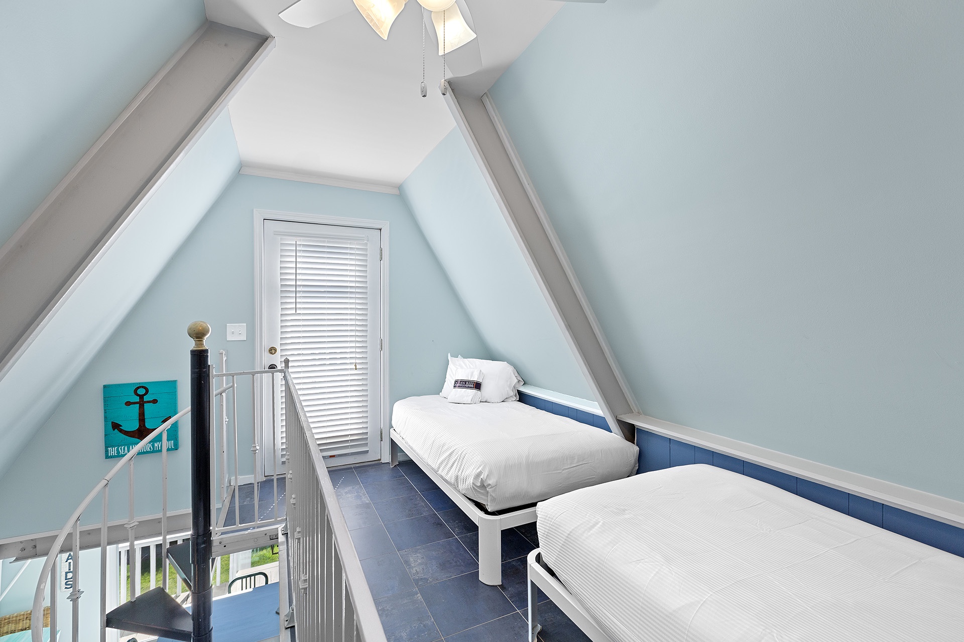 A second-floor guest bedroom includes a king-sized bed and charming cottage-style furnishings, with access to a beautiful hall bath with a walk-in shower. Another spiral staircase leads to the third-floor loft, featuring two twin beds and the primary bedroom. The primary retreat boasts a king-sized bed, an ensuite bathroom with a walk-in shower, and access to a rooftop sundeck overlooking the pool.