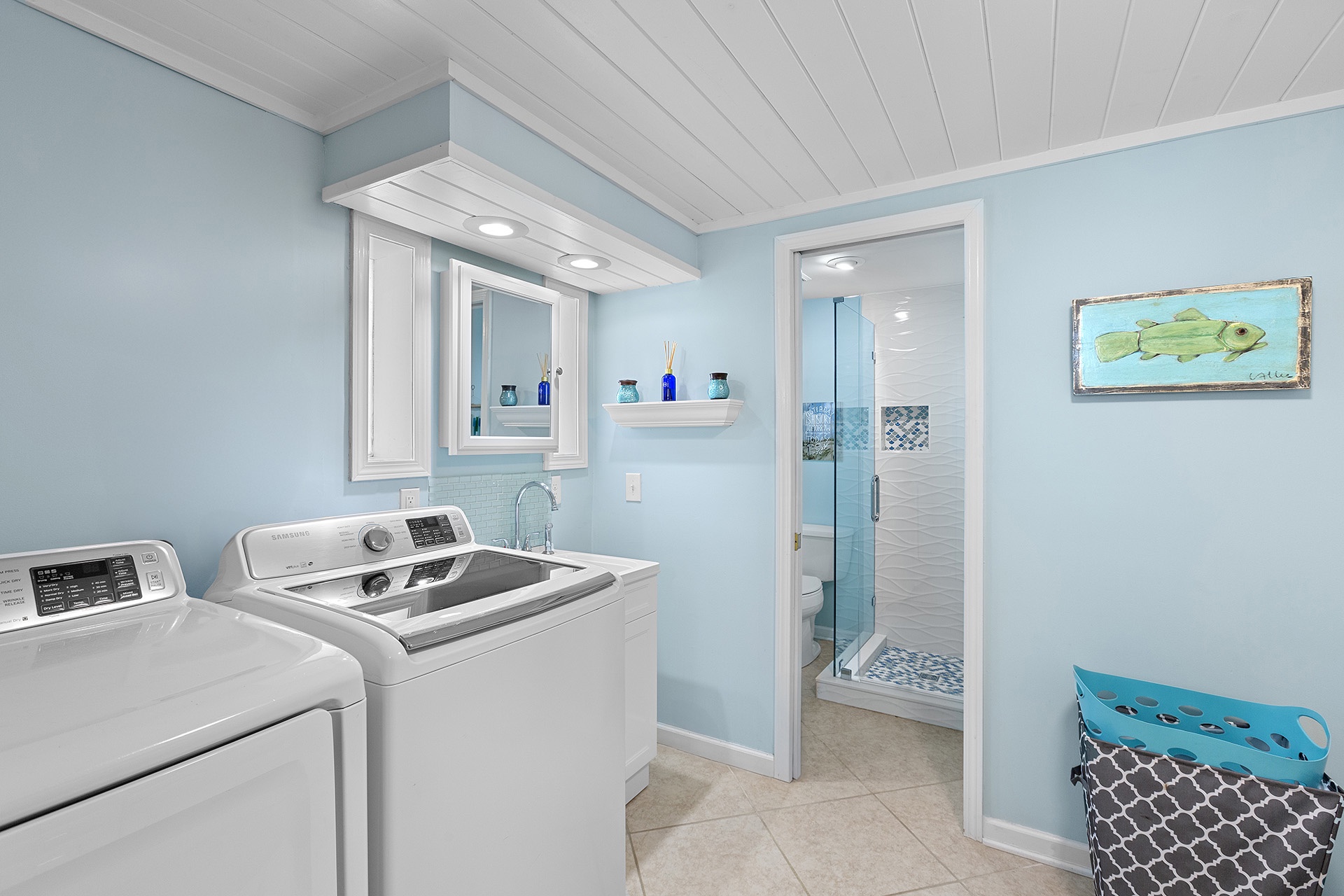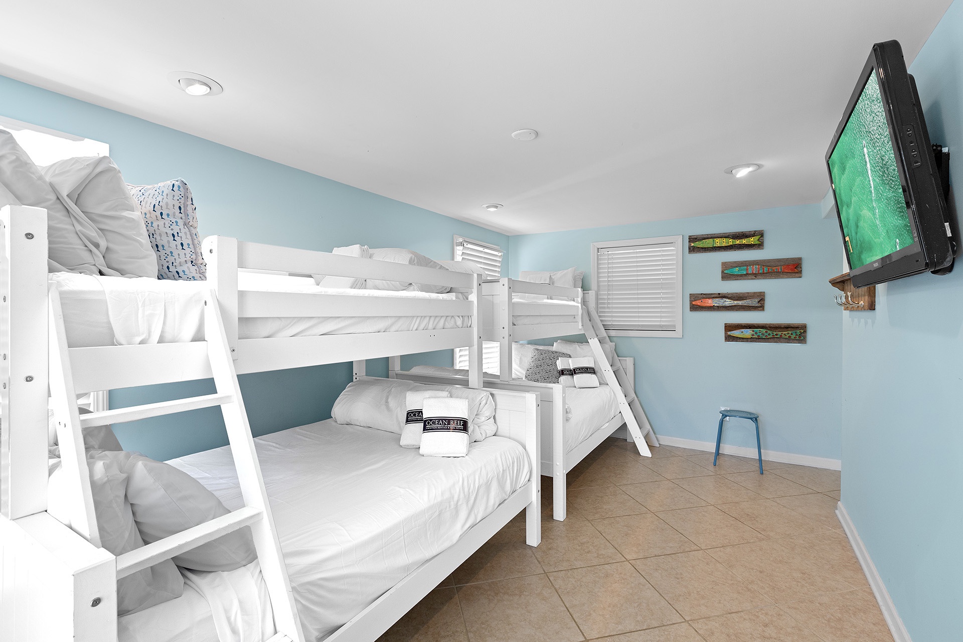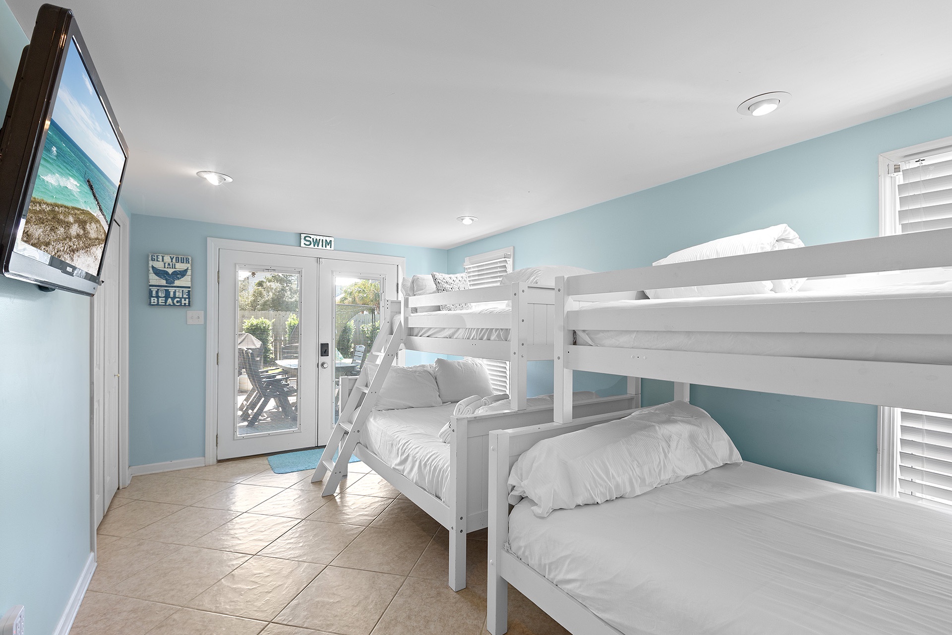 Inside, the first floor offers a bunk room with two queen/twin bunks, sleeping six guests in total. This bright, inviting space opens directly onto the pool patio and includes a wall-mounted flat-screen TV. You'll also find a bathroom with a walk-in shower, conveniently located next to the laundry room, which doubles as a poolside powder room.
