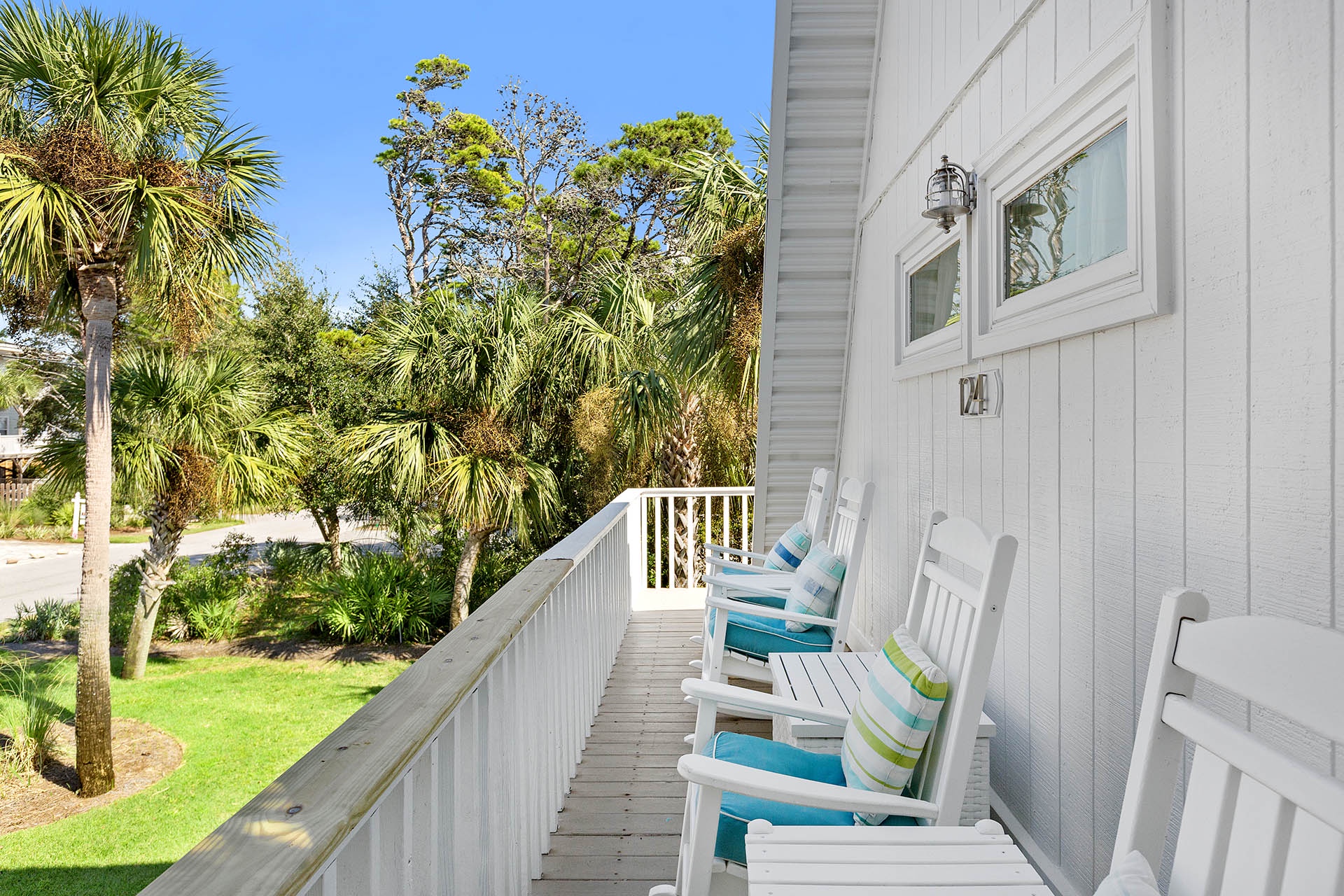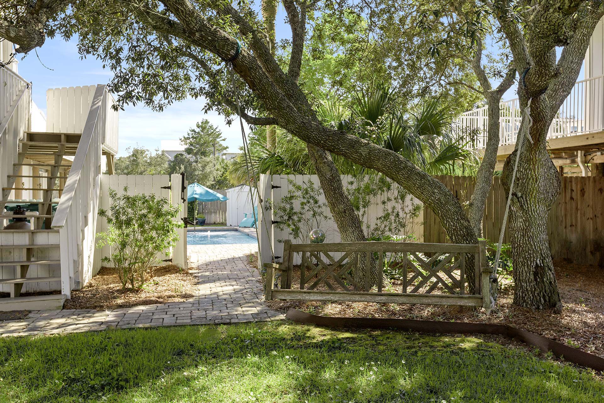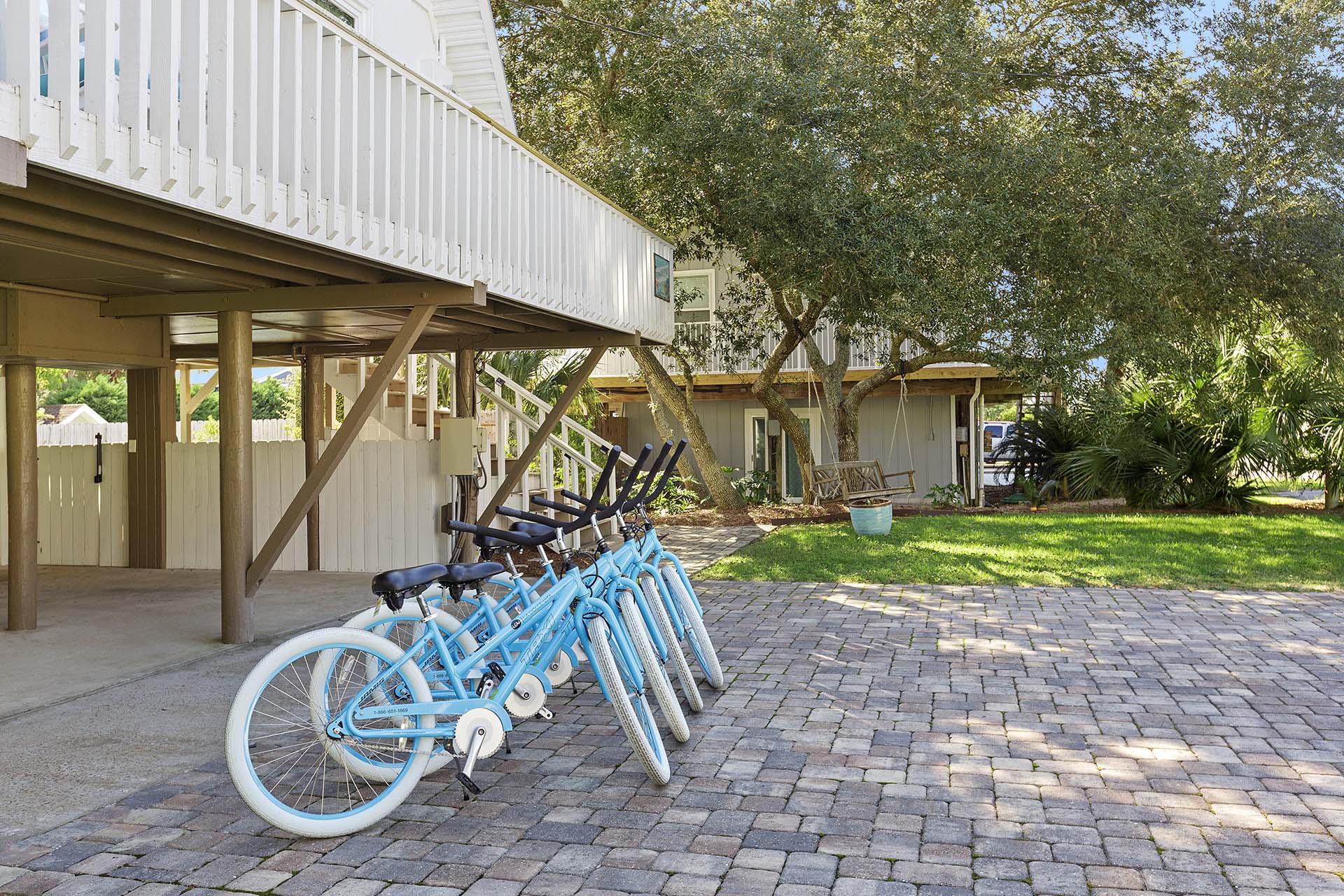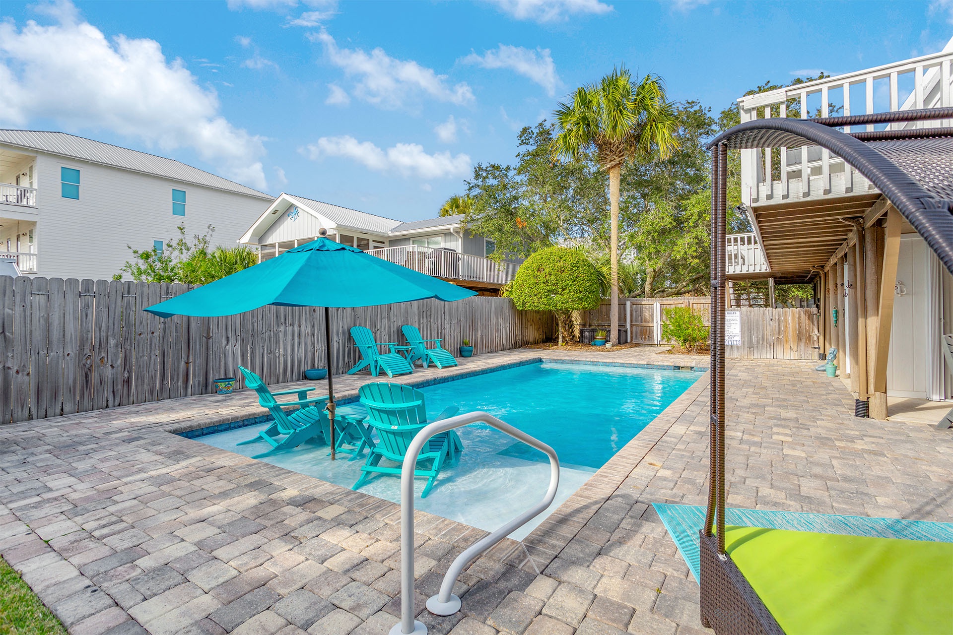 The home's crisp white A-frame design welcomes you with an open wraparound balcony, complete with cushioned rocking chairs where you can sip your favorite tropical drinks and enjoy the coastal breeze. Down below, a wood bench swing hangs from a majestic Live Oak, offering a peaceful spot to unwind. Out back, a beautiful paver patio surrounds a large pool, and a special set of chairs sits right in the water, inviting you to soak up the sun in style.