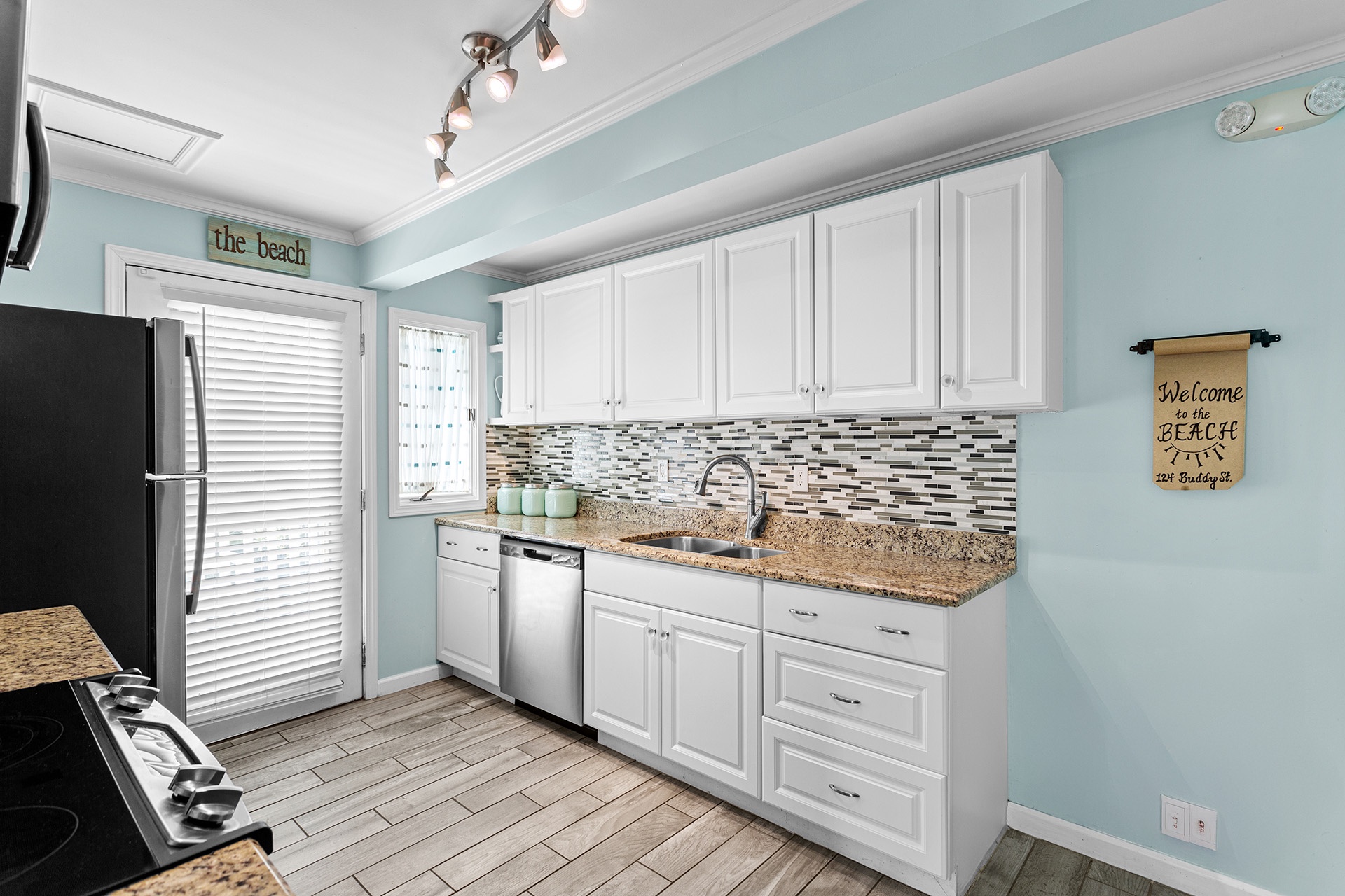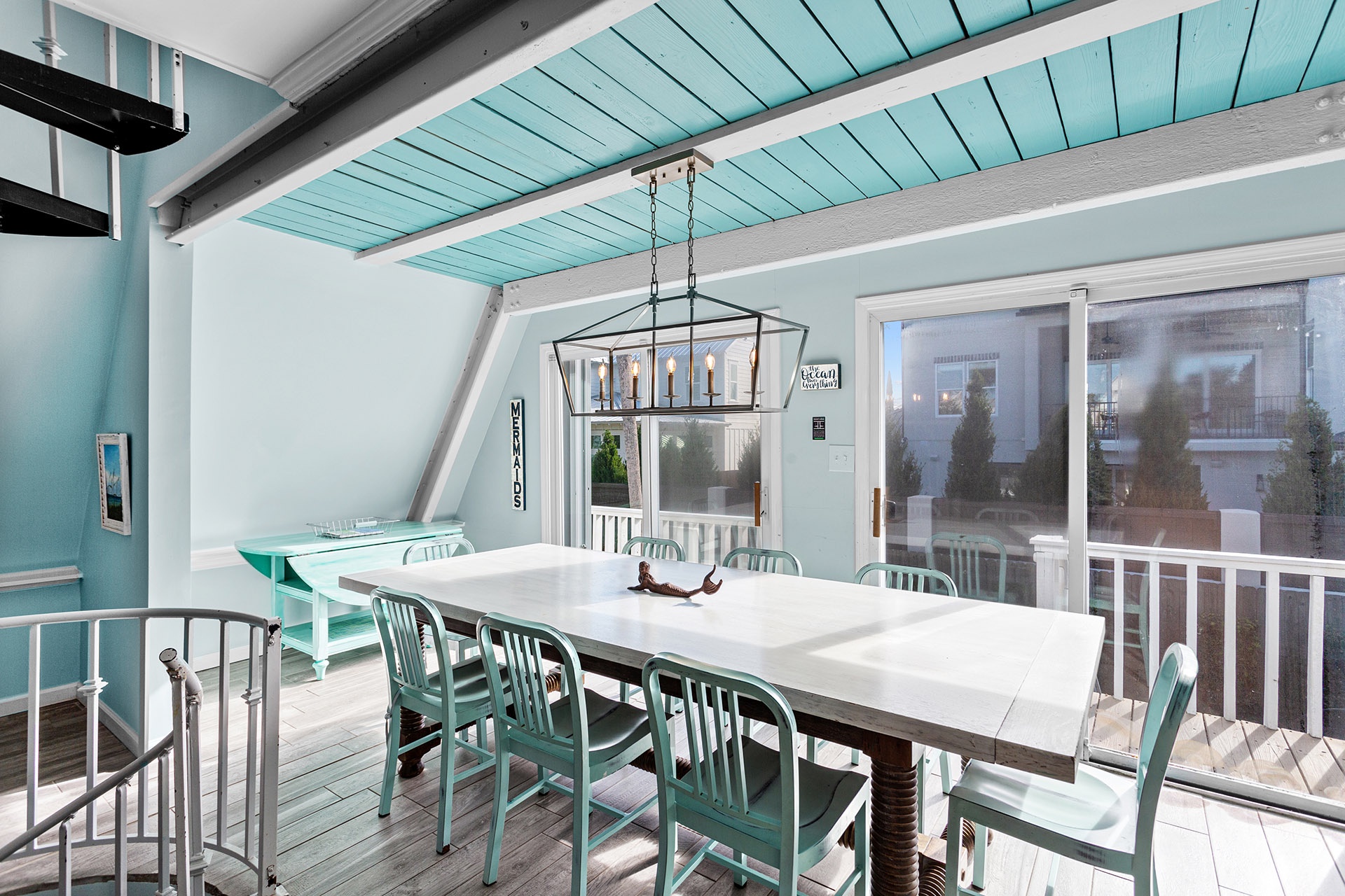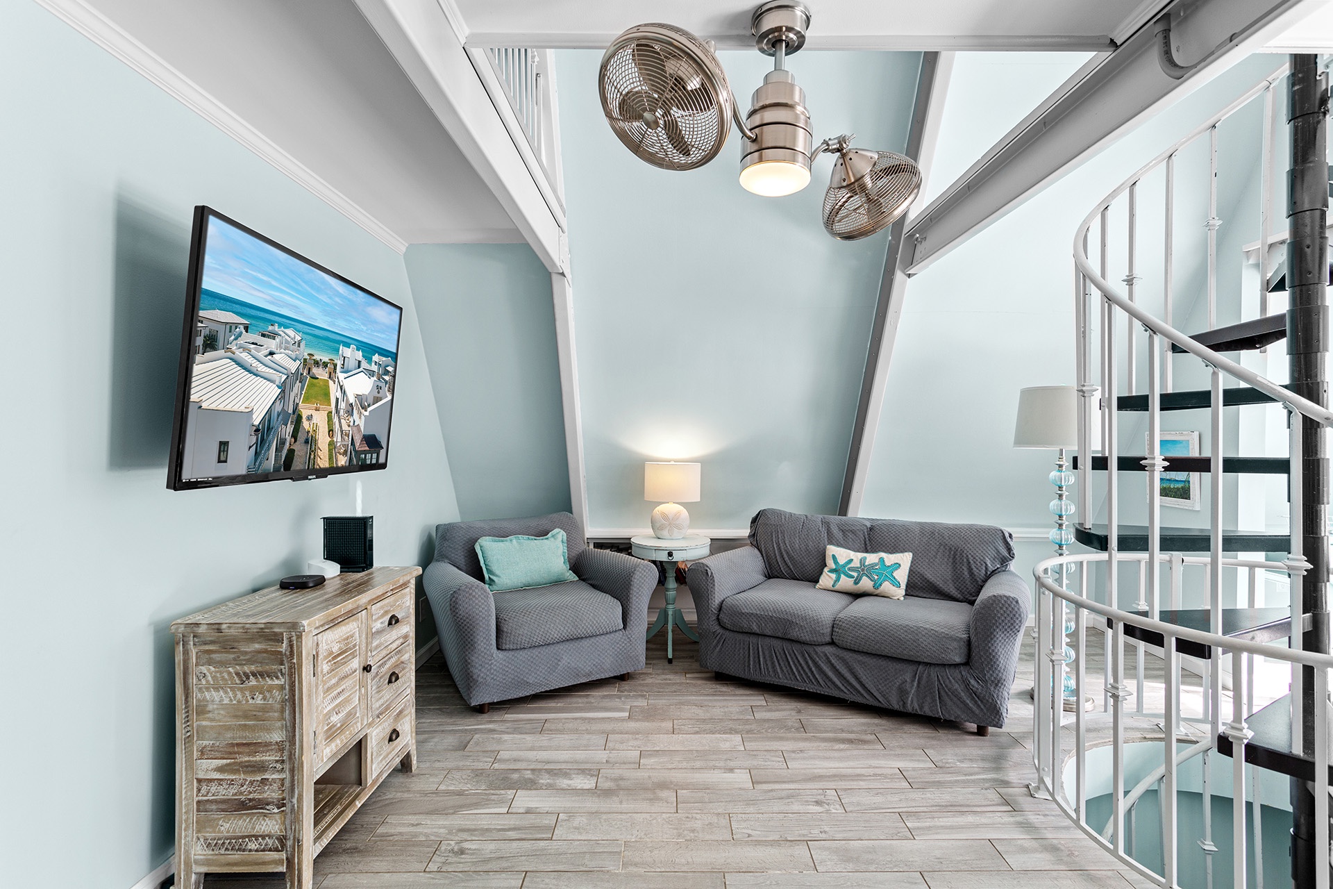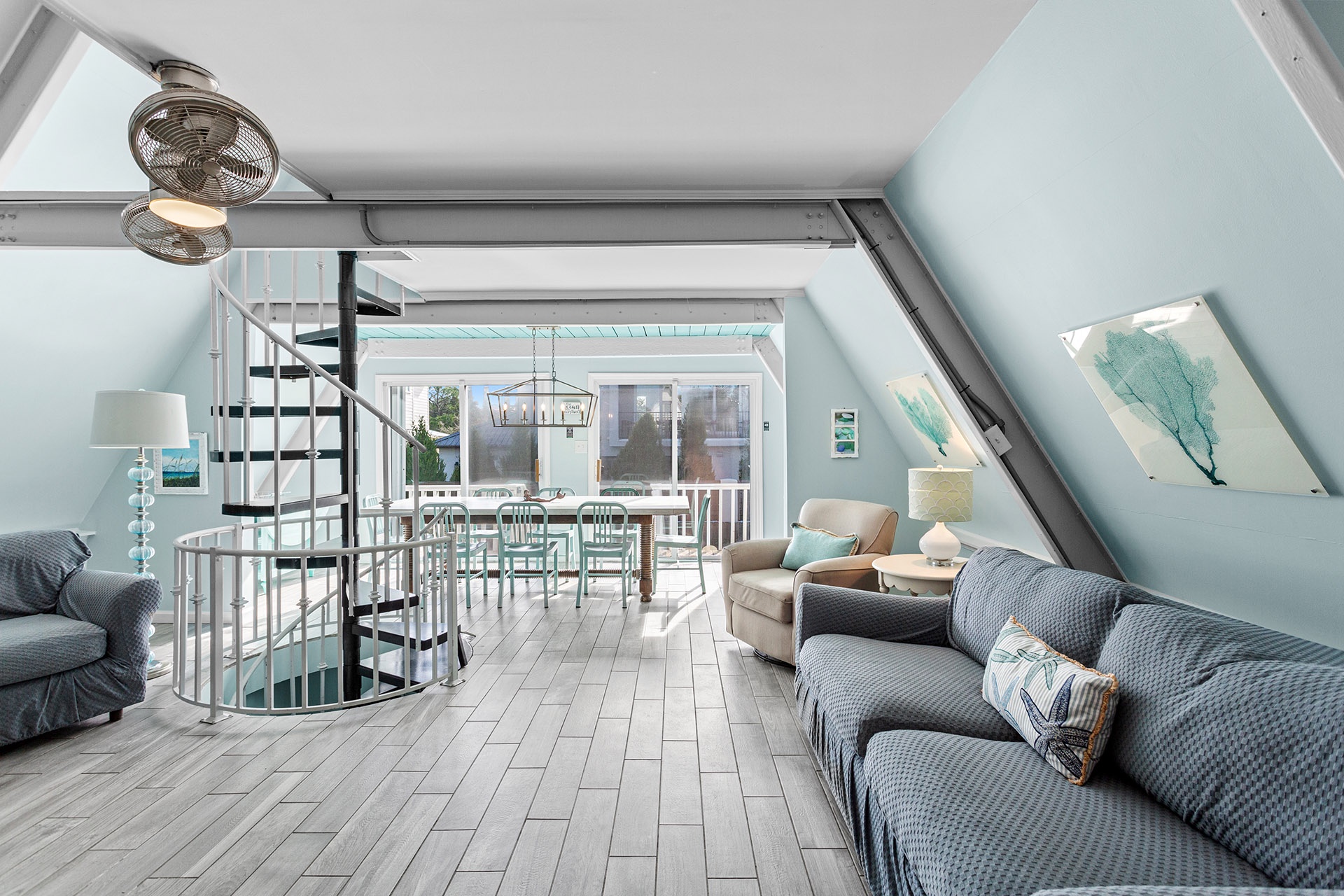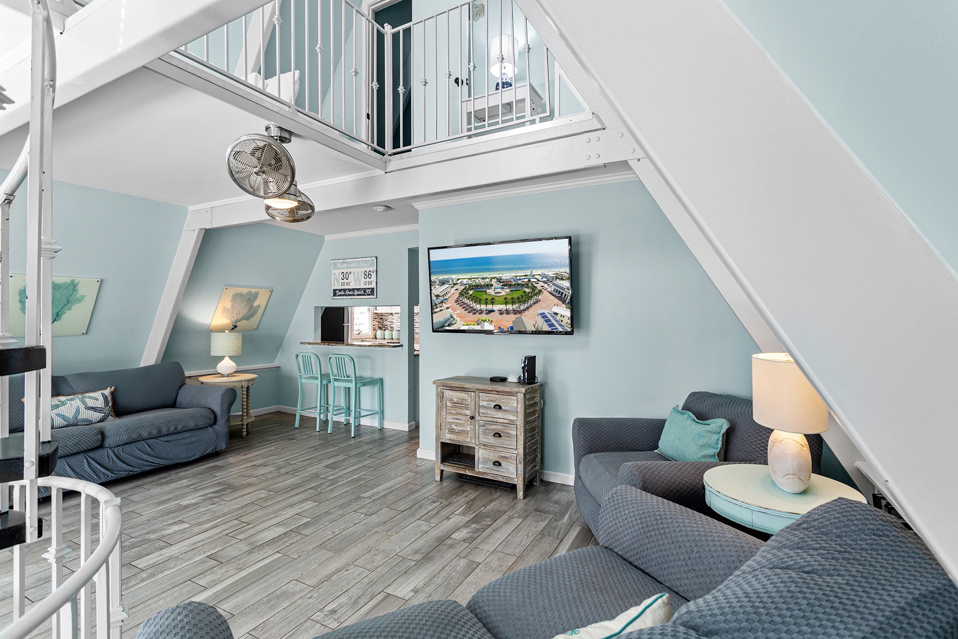 Take the spiral staircase up to the second-floor living area, where a vaulted ceiling and beach-washed hardwood tile flooring create a spacious, breezy vibe. The open living, dining, and kitchen area is perfect for family gatherings, with a rustic hardwood dining table seating eight, and a cozy living area with a creamy white sofa set around a large flat-screen TV. The kitchen features sleek stainless steel appliances, a granite pass-thru bar, and bright white cabinetry, inspiring you to cook up memorable family meals.