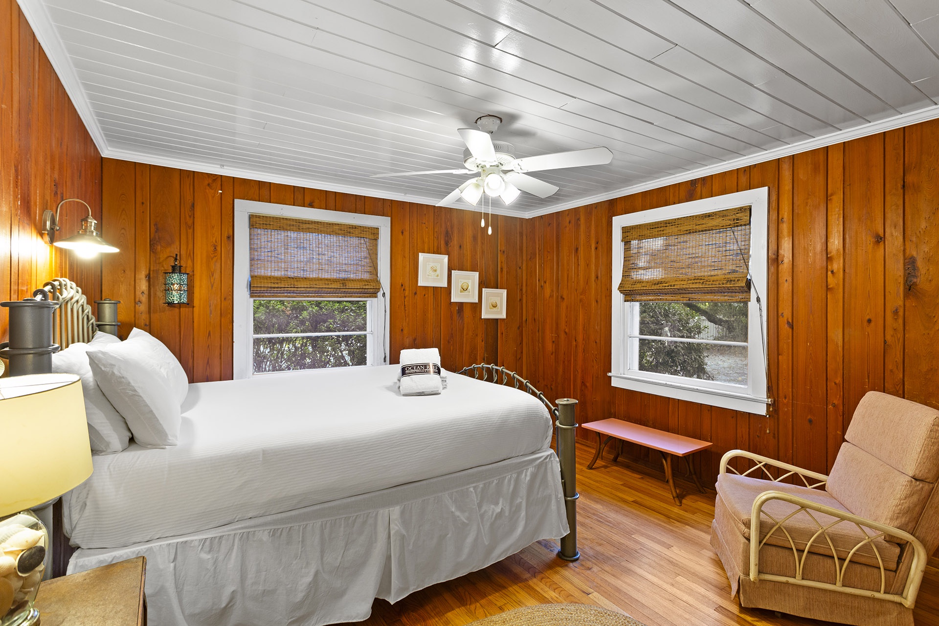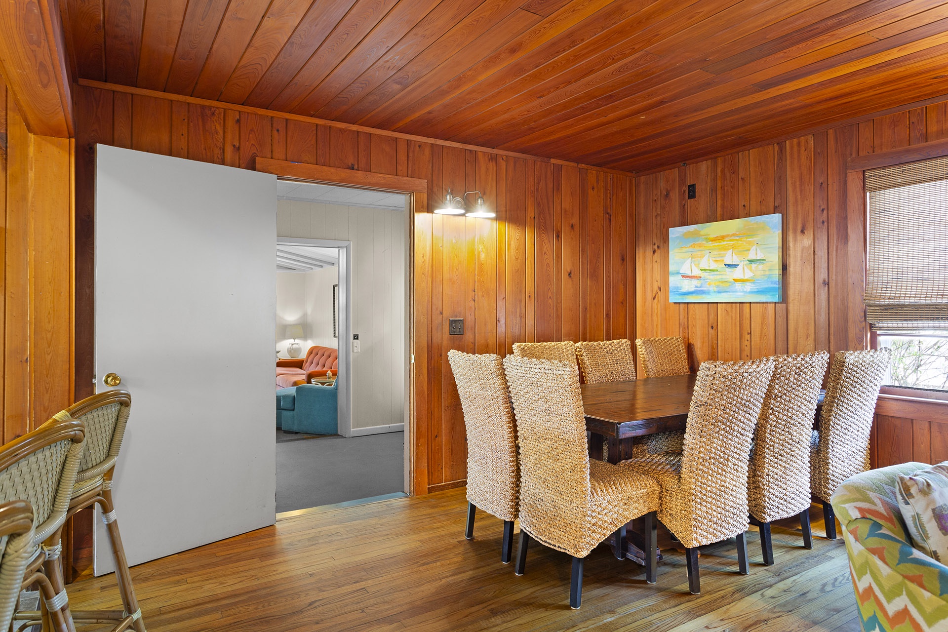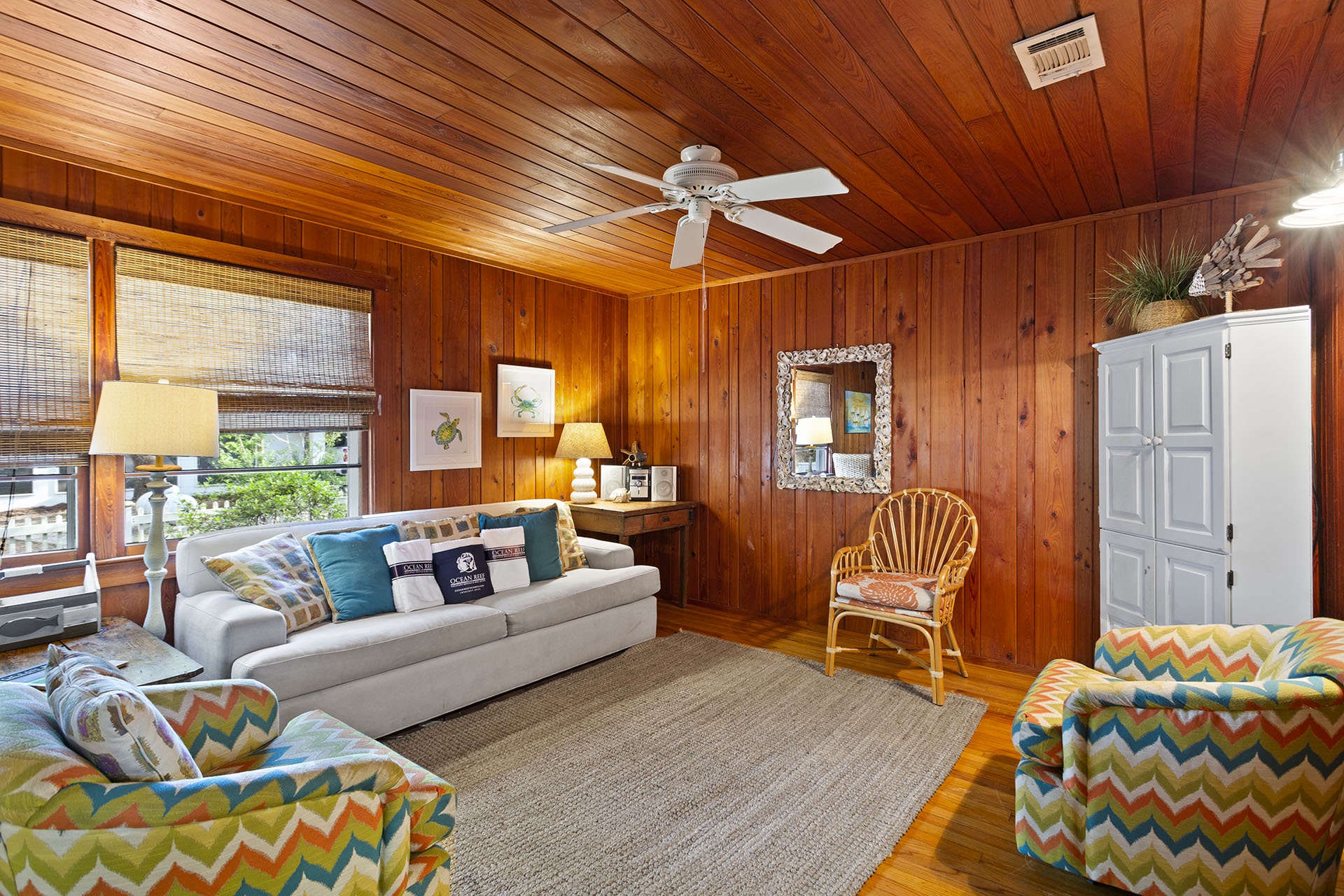 The other side of the house has a warm cabin-like Family Room with molasses toned walls and a matching ceiling that are highlighted by light hardwood flooring. A country dining table has eight high backed woven chairs for a tropical look. The open cottage styled kitchen has white cabinetry, a glass topped range oven and a counter with four raised bent cane bar chairs. The living area has a cream-colored couch, a cane armchair and two bucket chairs with colorful zigzag patterns. Down the hall past a full shared bath are two charming cottage styled Guest Bedrooms with molasses toned walls and white wood ceilings. One of these rooms has two twin sized bed while the other has a queen sized bed with a decorative metal frame.