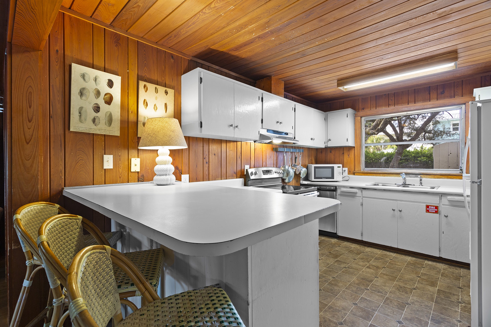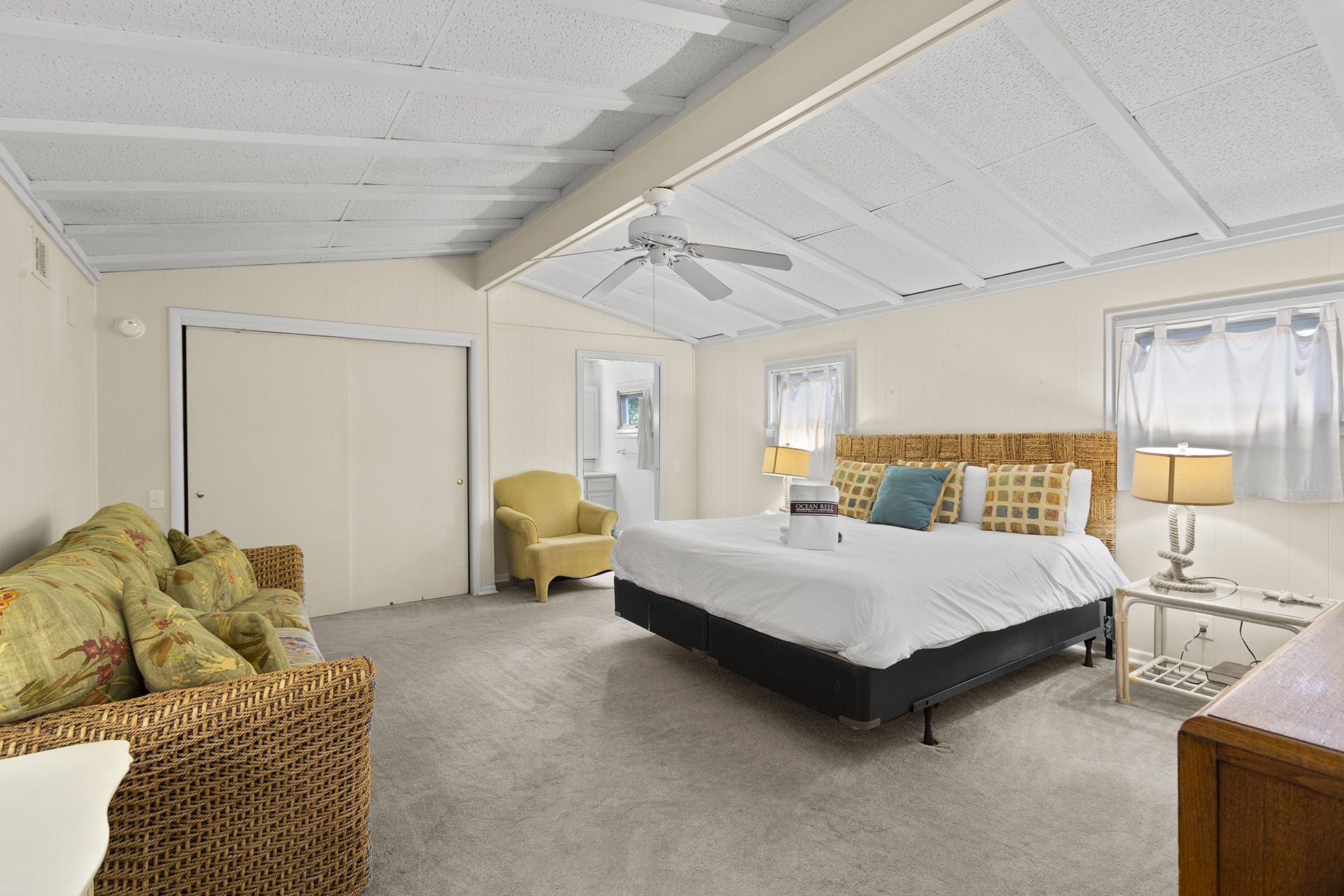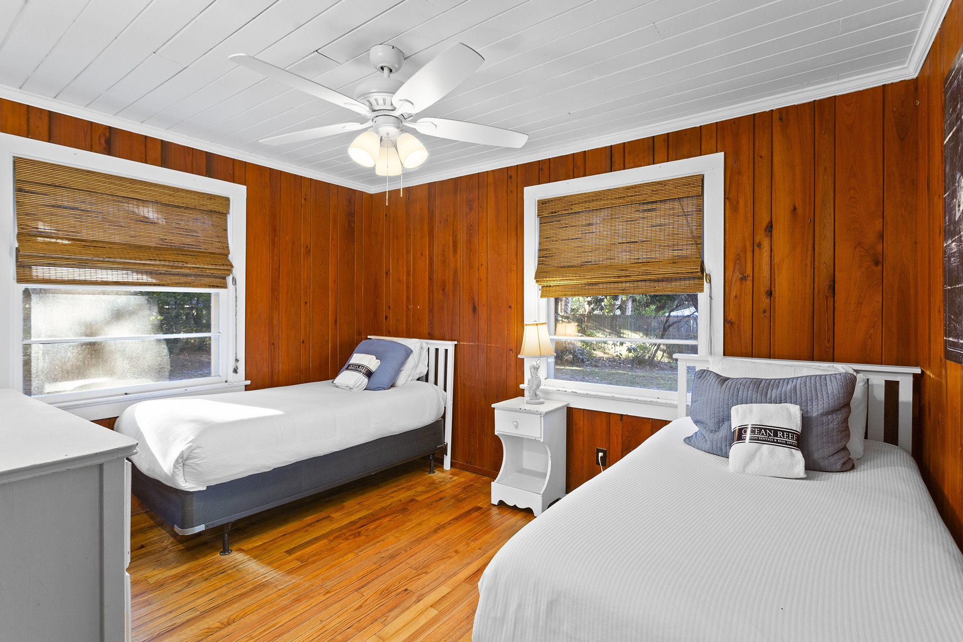 The other side of the house has a warm cabin-like Family Room with molasses toned walls and a matching ceiling that are highlighted by light hardwood flooring. A country dining table has eight high backed woven chairs for a tropical look. The open cottage styled kitchen has white cabinetry, a glass topped range oven and a counter with four raised bent cane bar chairs. The living area has a cream-colored couch, a cane armchair and two bucket chairs with colorful zigzag patterns. Down the hall past a full shared bath are two charming cottage styled Guest Bedrooms with molasses toned walls and white wood ceilings. One of these rooms has two twin sized bed while the other has a queen sized bed with a decorative metal frame.