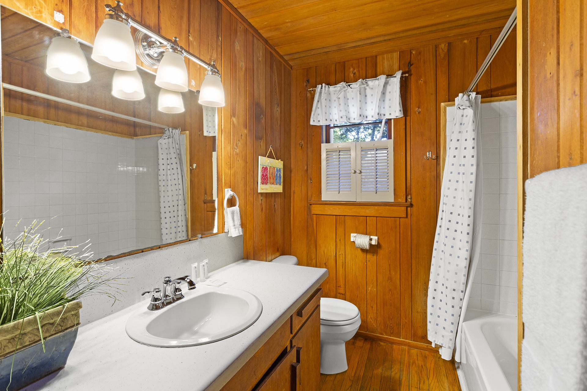 Salty Dawg is located near the village center of Grayton Beach and a short distance away from the beautiful white sand shore. This gracious rental home sits on a large wooded lot nestled by magnolias and soaring live oak trees that wind their way up to the sky. An open deck wraps around the side of the house and over to the front entry where you may enjoy the woodsy views and have a cookout with the grill. Towards the right of the entry foyer is the Great Room with a white beamed vaulted ceiling and an entire end wall of windows that go to the top of a towering truss. A royal blue armchair accents two plush salmon colored couches and a matching love seat with an ottoman. They face the wall of windows that are centered with a tall hardwood armoire that houses a TV for entertainment. The roomy Master Bedroom off this room also has a vaulted ceiling, a king-sized bed, a sitting area with a plush armchair, a wicker frame cushioned couch and a private bath with a walk-in tiled shower.