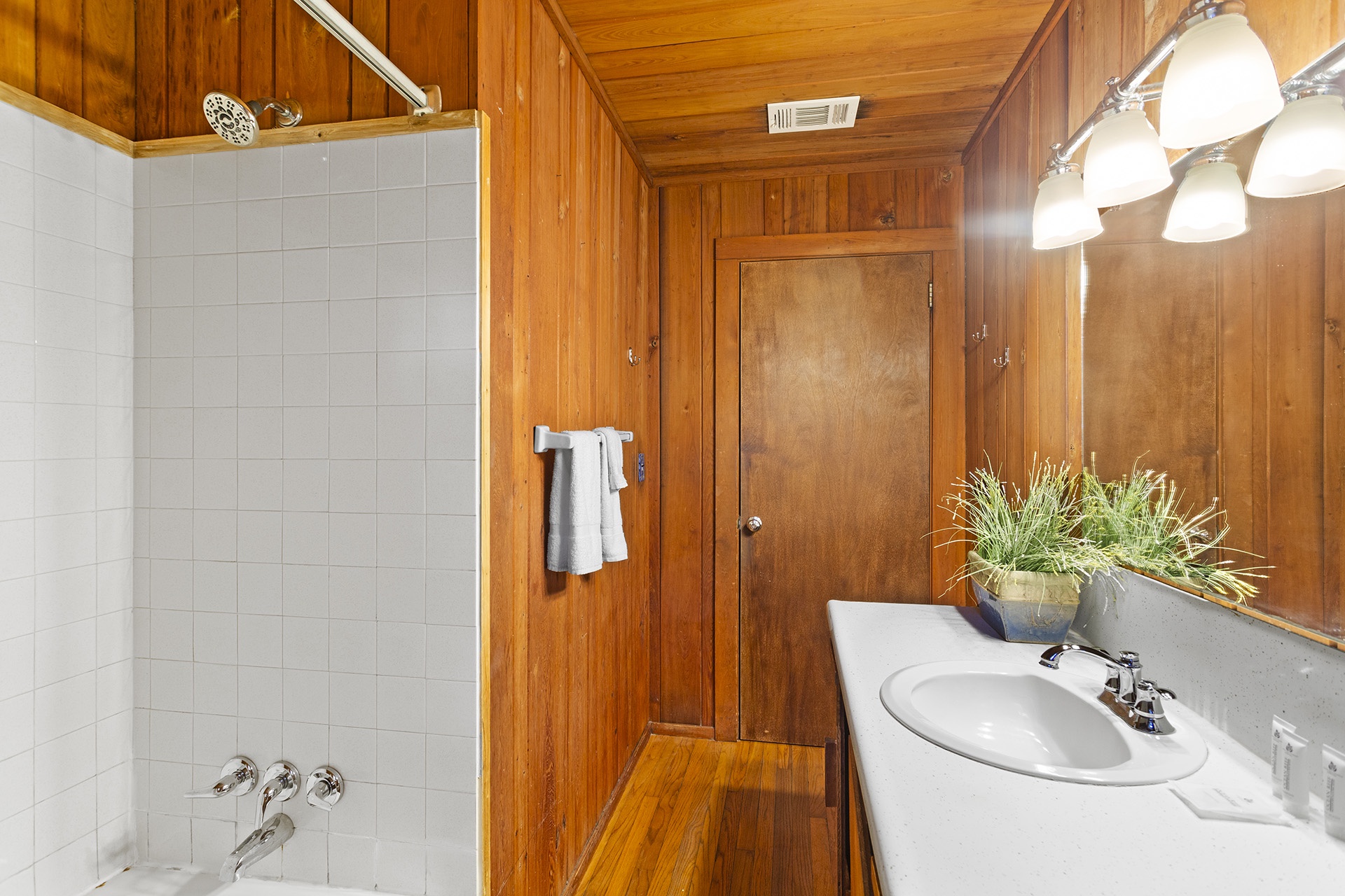 This classic vacation home has a fashionable Mid Century Modern design replete with multiple living spaces. A family room with a dining area next to an open kitchen is on one side of the home with a wonderful Great Room on the other side. It also has a split bedroom plan with a Master Suite off the Great Room and two Guest Bedrooms on the other side off of the family room.