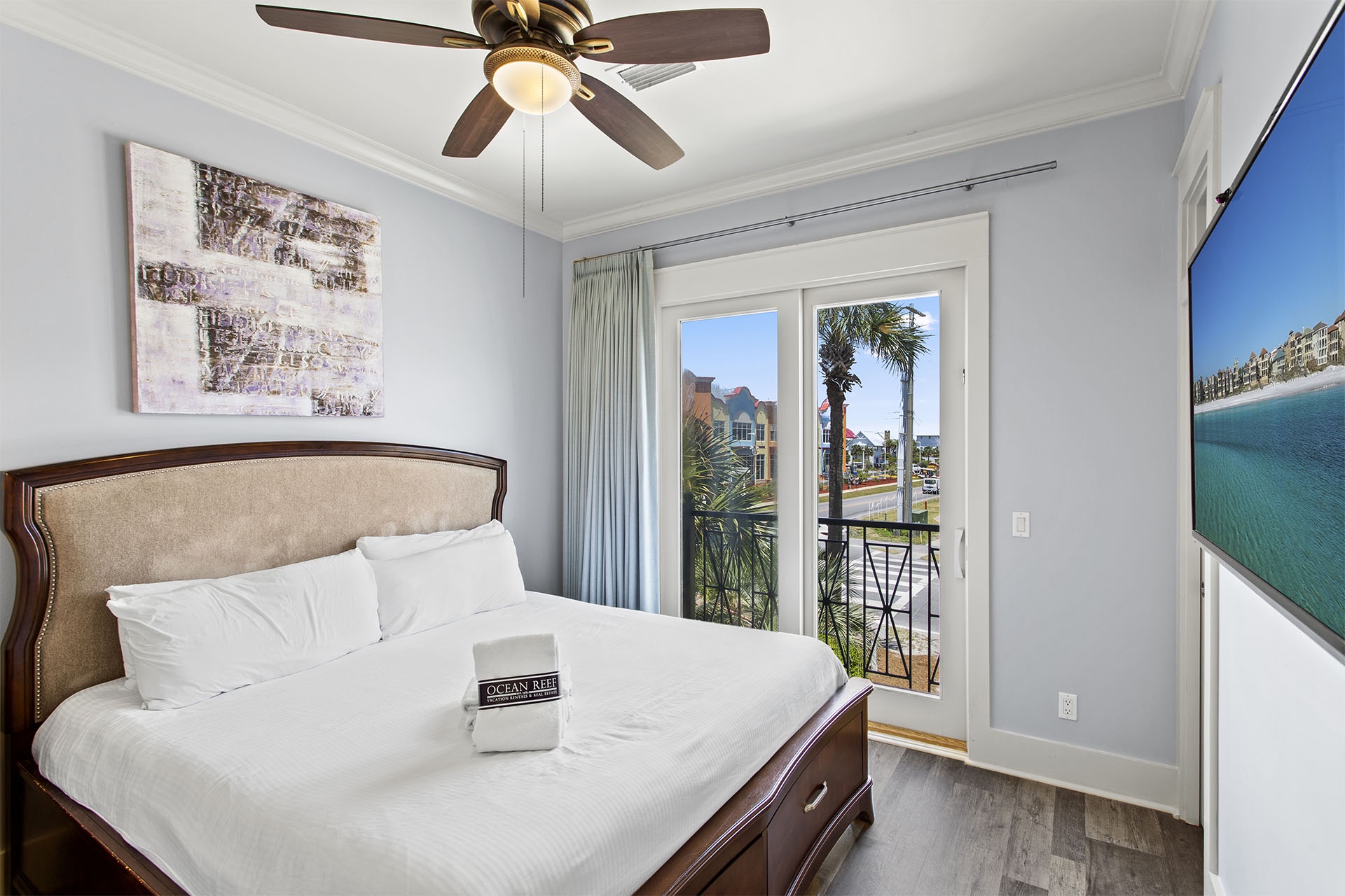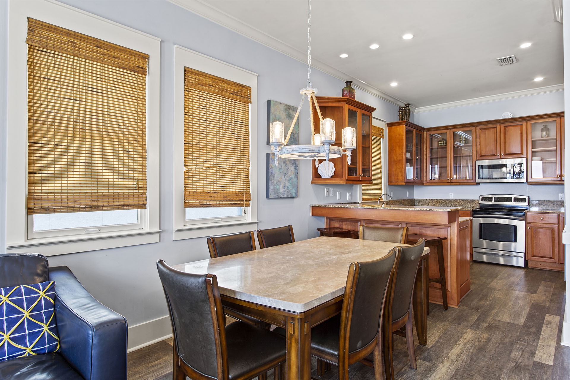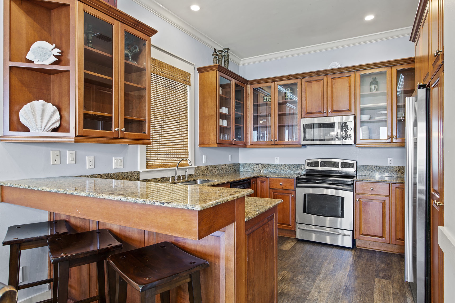 The main living area is on the second floor with rich hardwood flooring, attractive accent chairs and a couch face a flatscreen TV. This bright open room has glass balcony doors beside another wall of sunny windows. A formal dining table has six seats near the open modern kitchen, which features a granite bar with additional seating, warm maple toned custom cabinetry and state of the arts stainless steel appliances. There is another Guest Bedroom here with a big king size bed and 50" Plasma TV which has access to a full hall bath that conveniently doubles as a powder room.