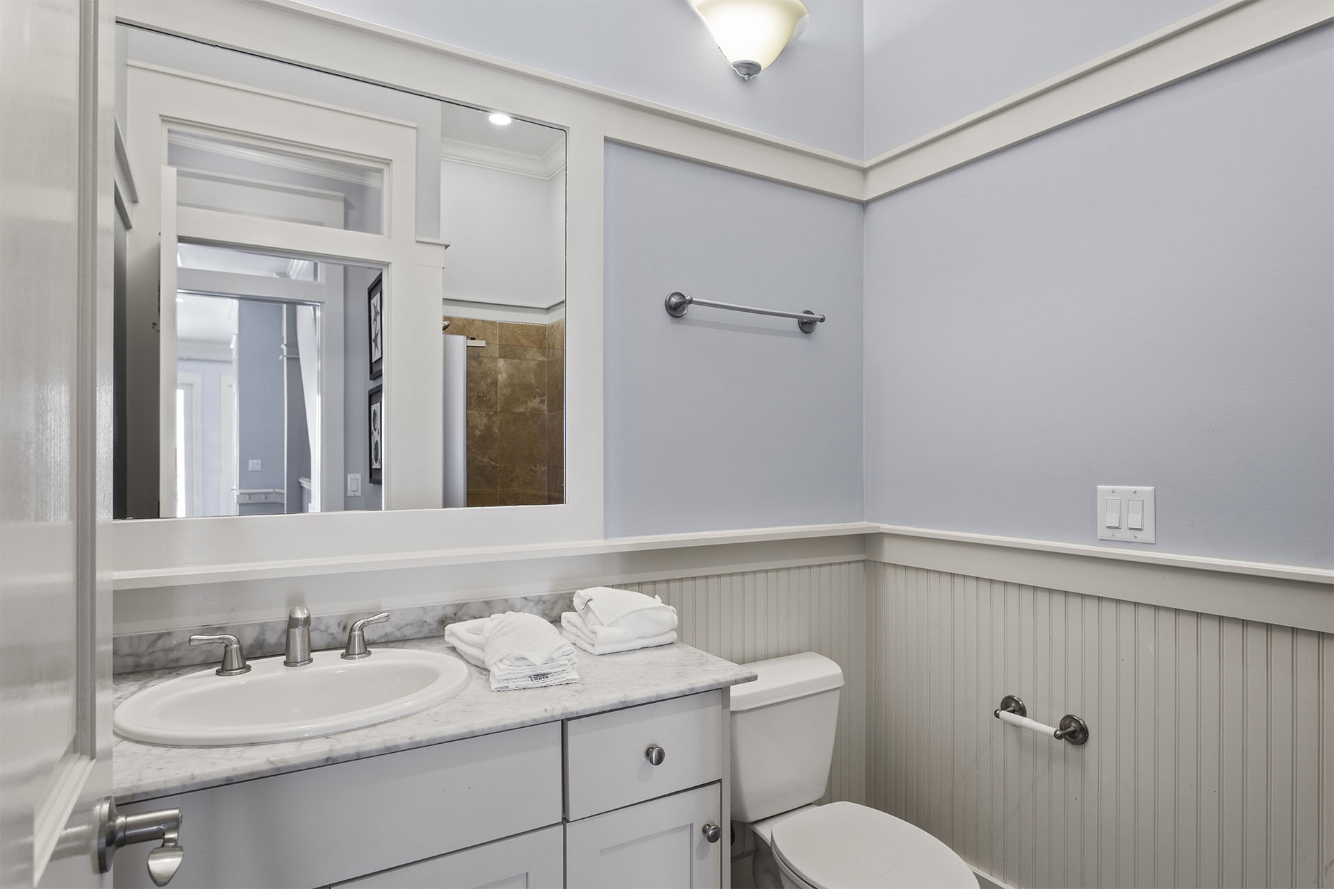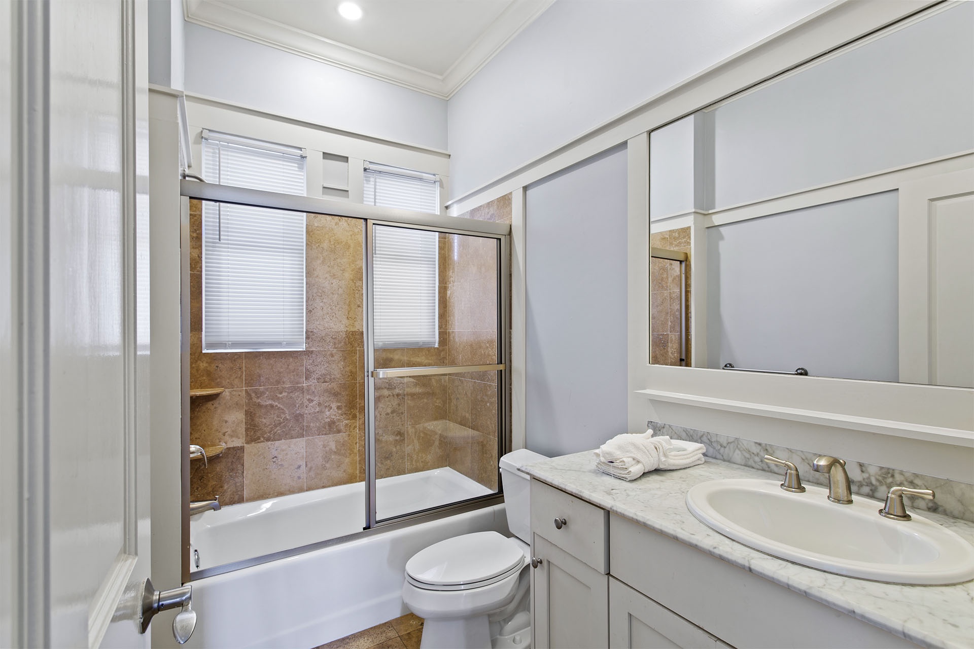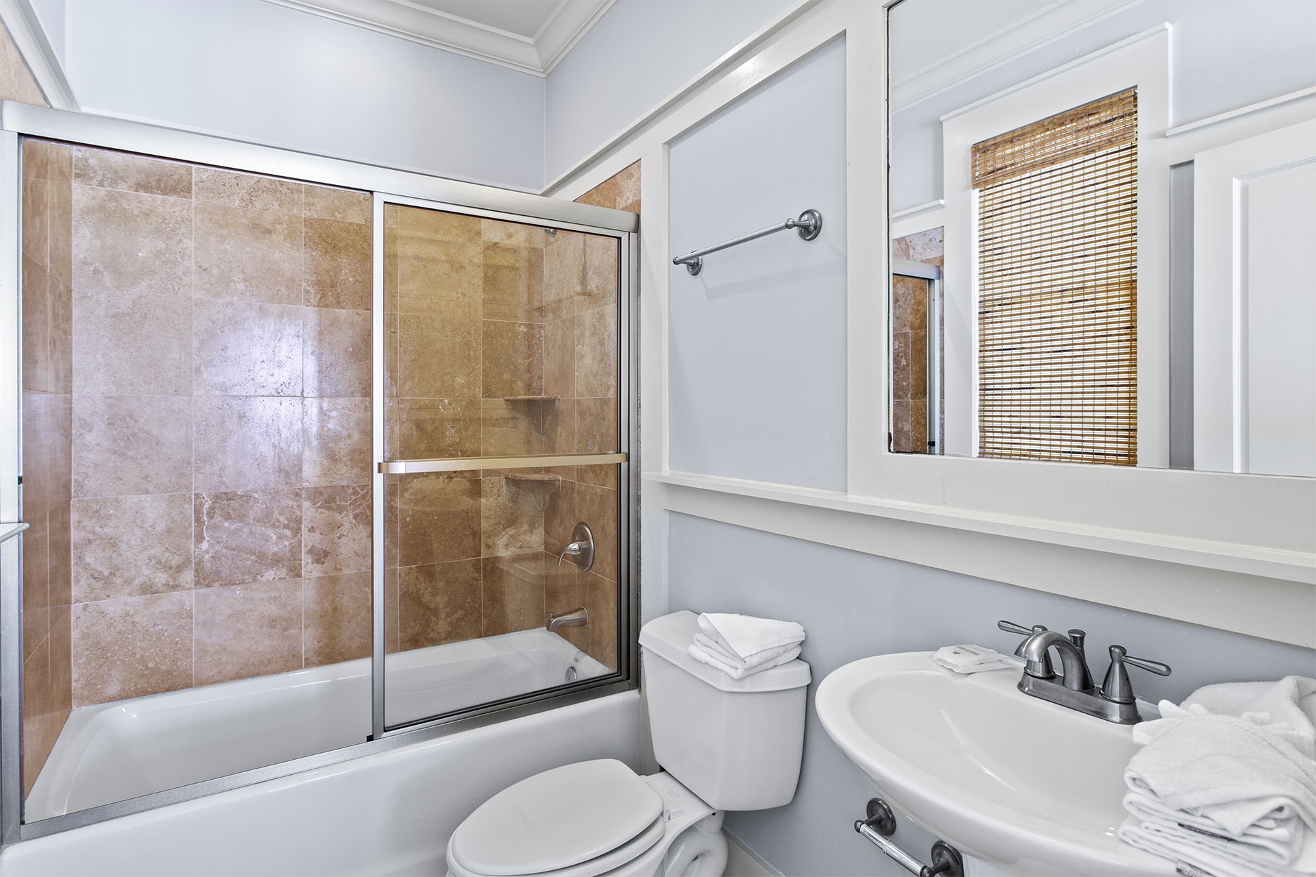 The main living area is on the second floor with rich hardwood flooring, attractive accent chairs and a couch face a flatscreen TV. This bright open room has glass balcony doors beside another wall of sunny windows. A formal dining table has six seats near the open modern kitchen, which features a granite bar with additional seating, warm maple toned custom cabinetry and state of the arts stainless steel appliances. There is another Guest Bedroom here with a big king size bed and 50" Plasma TV which has access to a full hall bath that conveniently doubles as a powder room.
