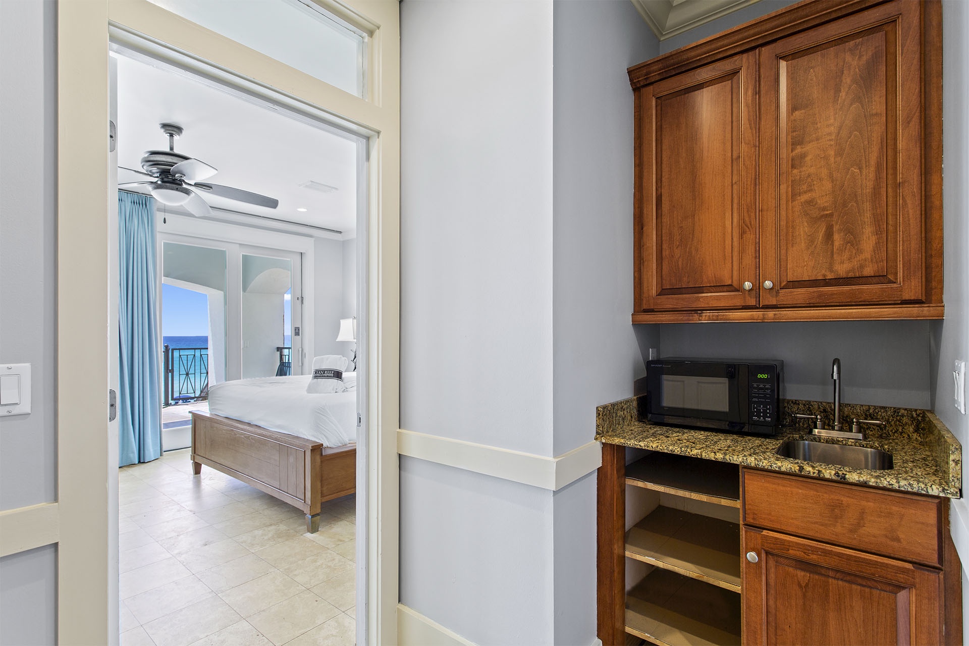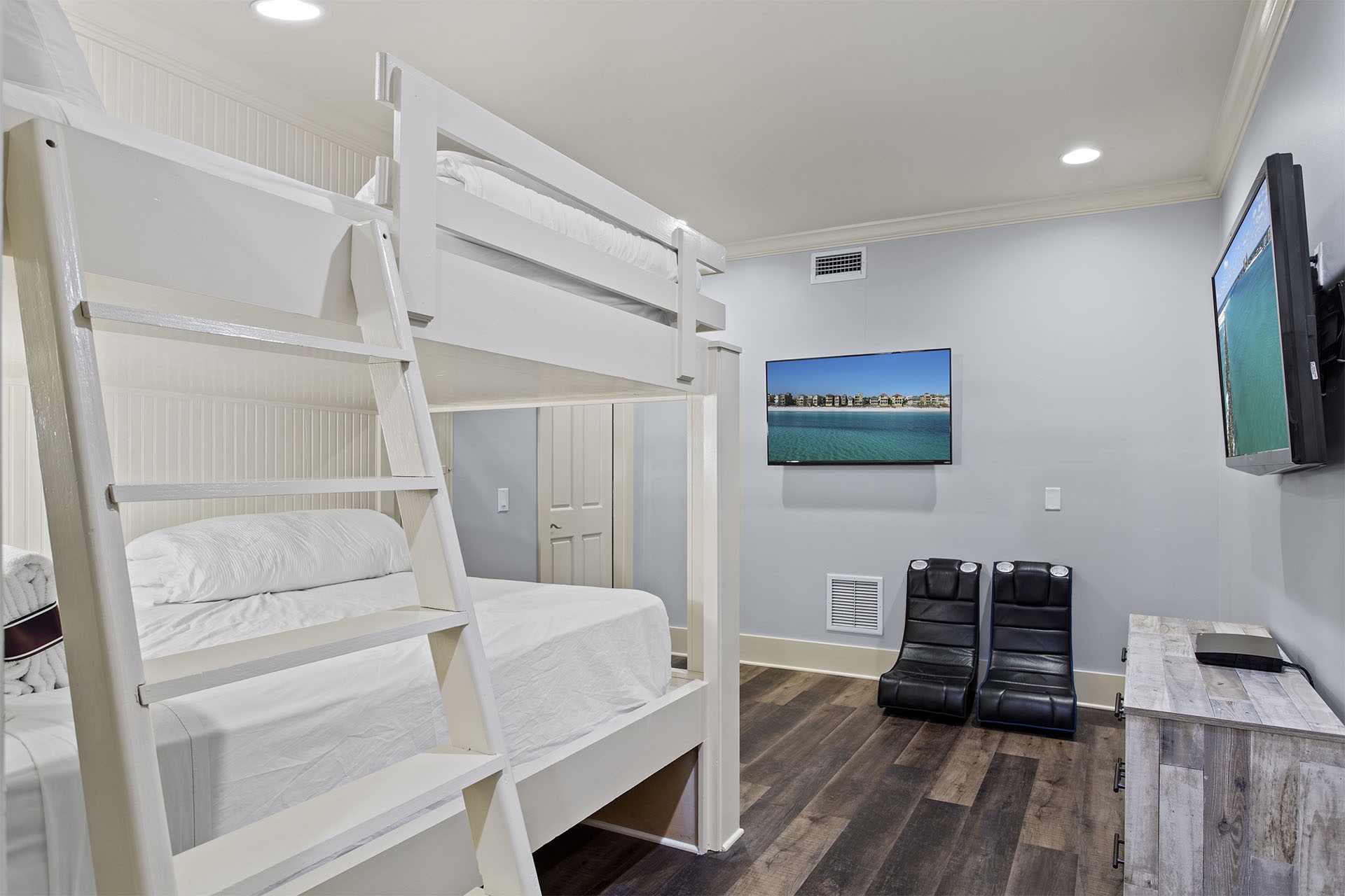 The first floor Master Bedroom has a full luxury bath en suite, a seating area as well as a comfortable king size bed beside double glass doors that lead out to the balcony that includes a "Martini" plunge pool. Balcony stairs provide access down to the sugary white sand beach where the host provides daily complimentary set-ups with four chairs and two umbrellas in season. A Bunk Room nearby offers two wall-mounted flatscreen TVs and provides separate sleeping quarters for an entire family.