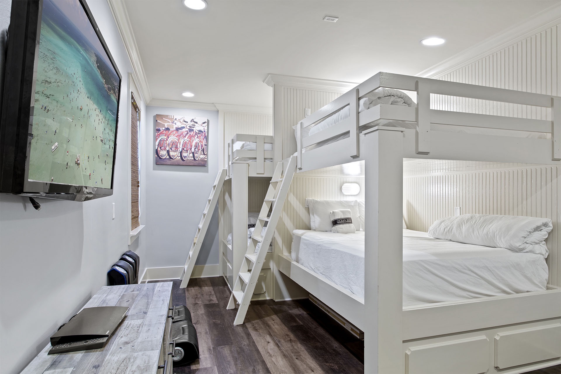First Floor: King Bedroom with Tub/Shower Combo and Patio Access, Bunk Room with Queen Bunk and Full Bunk, Wet Bar.