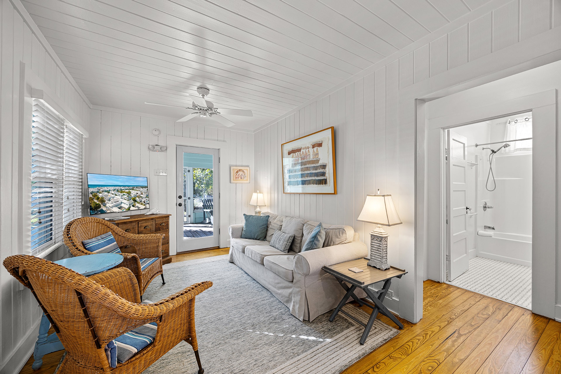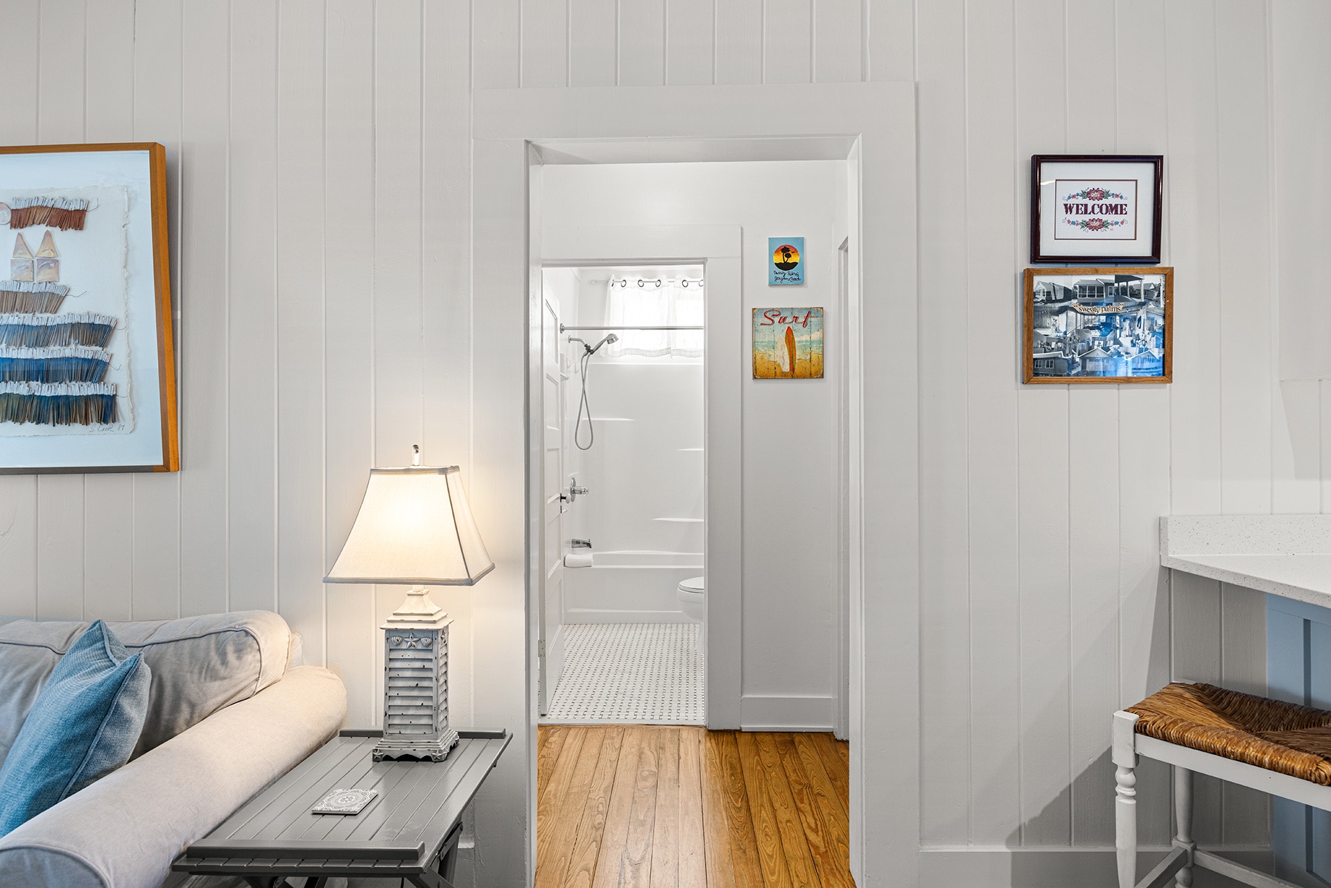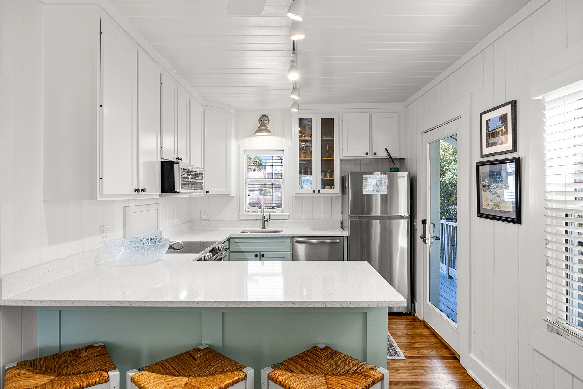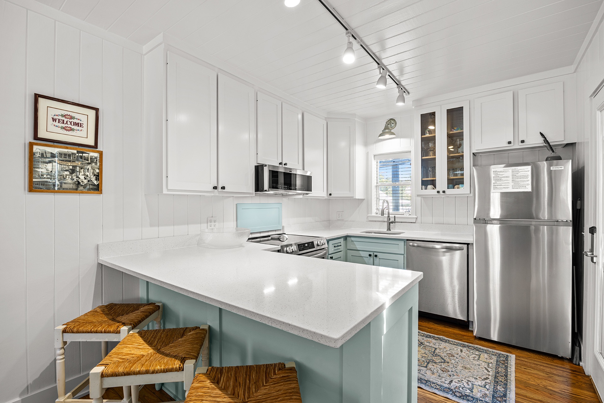 Inside, the home strikes a balance between cheerful design and cozy comfort. Crisp shiplap walls, warm hardwood floors, and coastal art create a nostalgic cottage feel, while quartz countertops and stainless-steel appliances add a polished, modern edge. The living area includes a cushioned sofa and wicker chairs, ideal for unwinding after a day in the sun. Central air conditioning and a washer and dryer make longer stays especially easy.